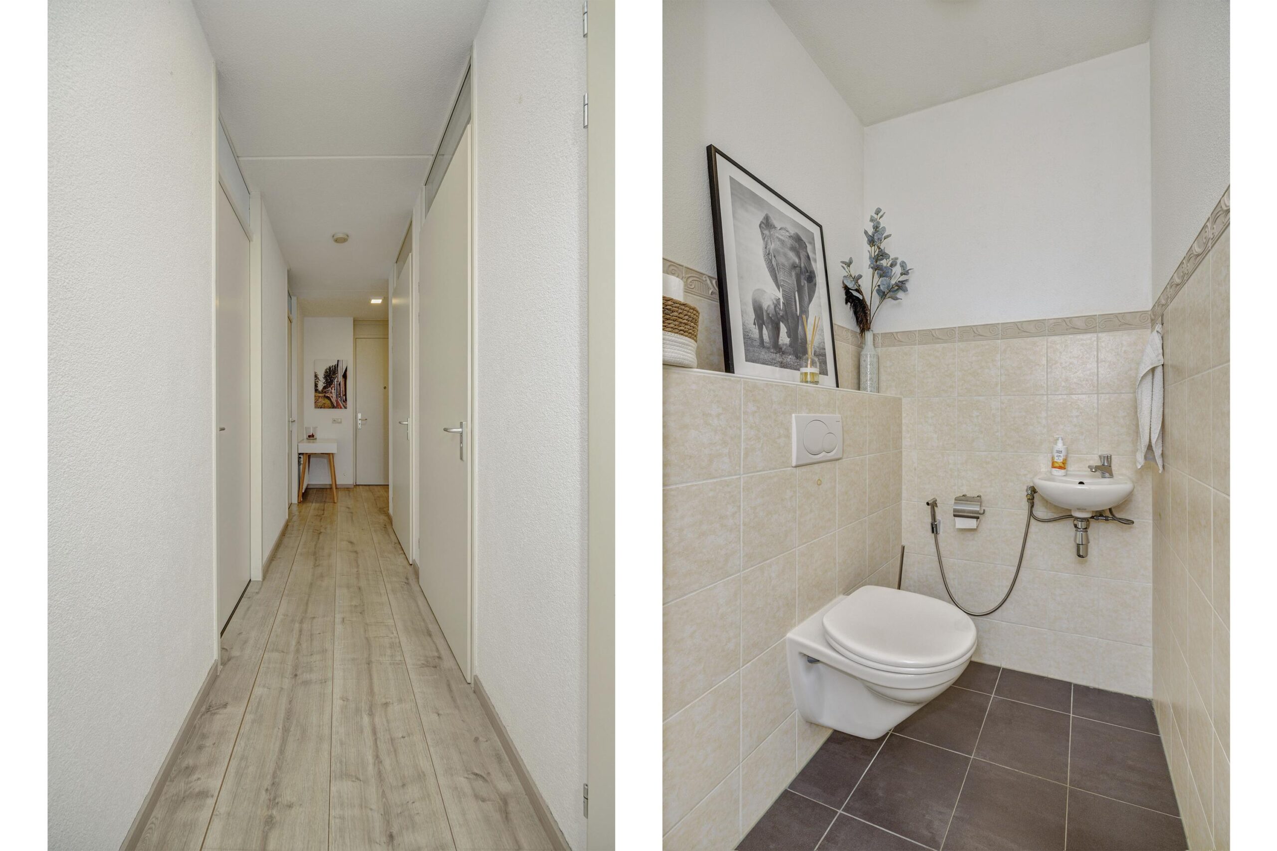 Terug in de hal lopen we door naar de twee slaapkamers, de badkamer, het separate toilet en de technische ruimte.