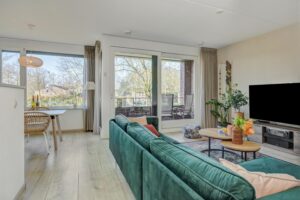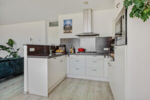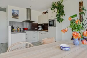 De woonkamer loopt naadloos over in de U-vormige keuken. De keuken is voorzien van de volgende inbouwapparatuur: een 5-pits gasfornuis met afzuigkap, combi-oven, vaatwasmachine, koelkast en opbergruimte in de kastjes.