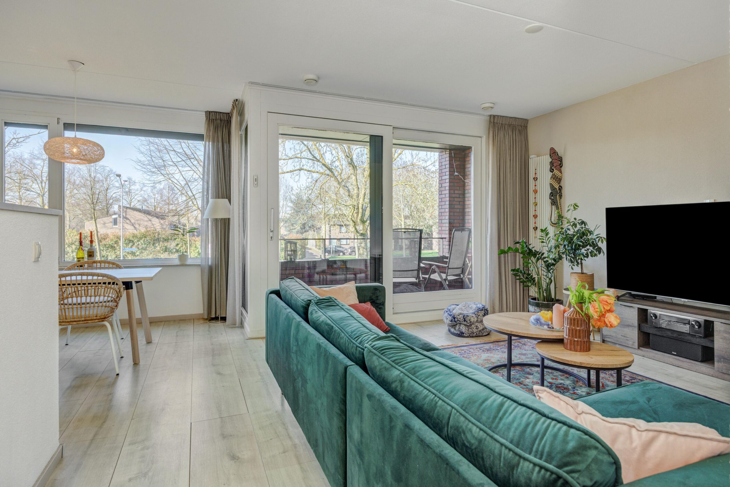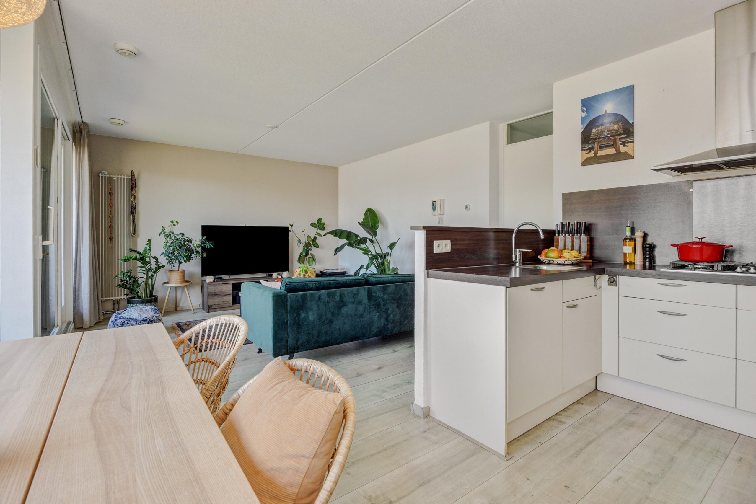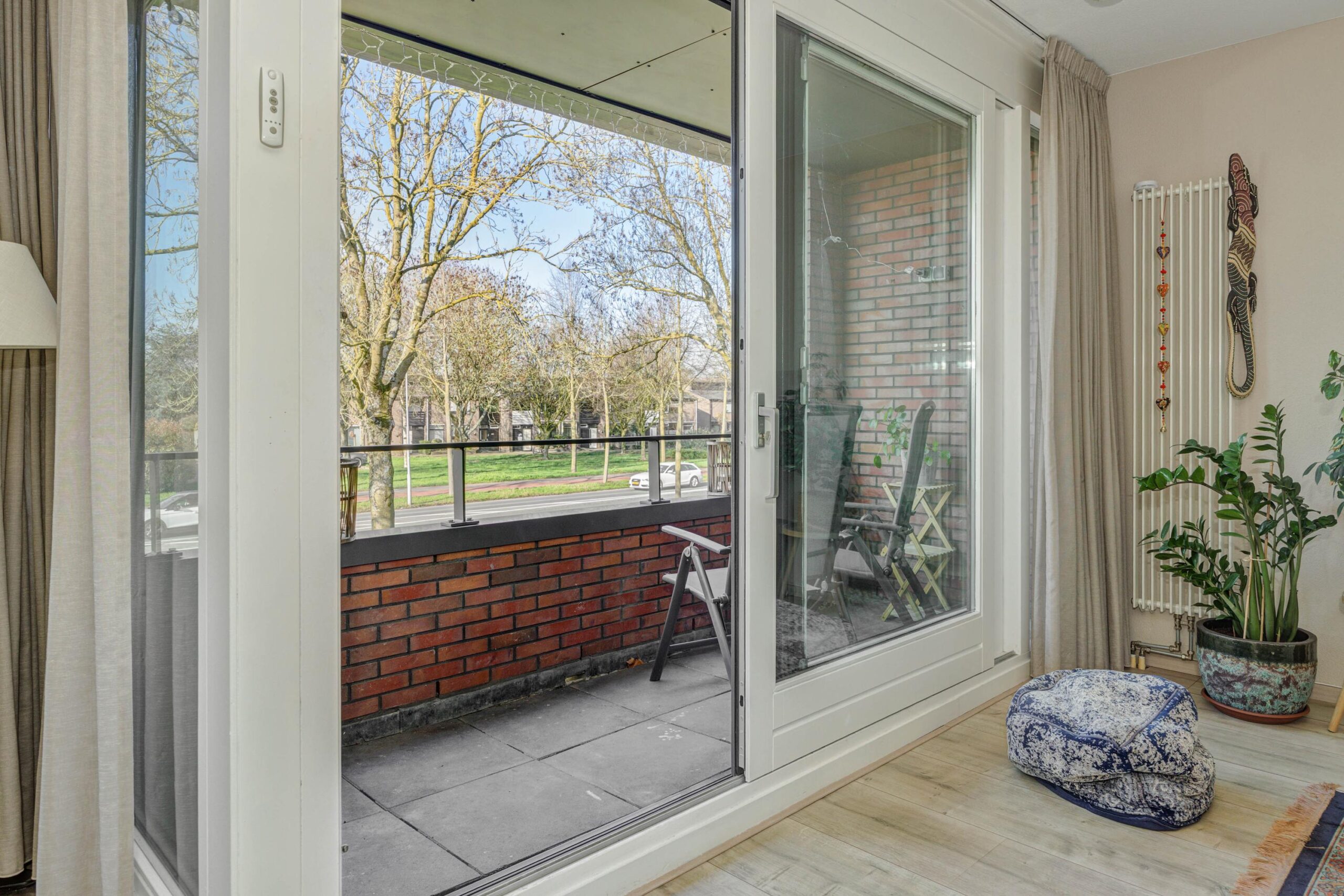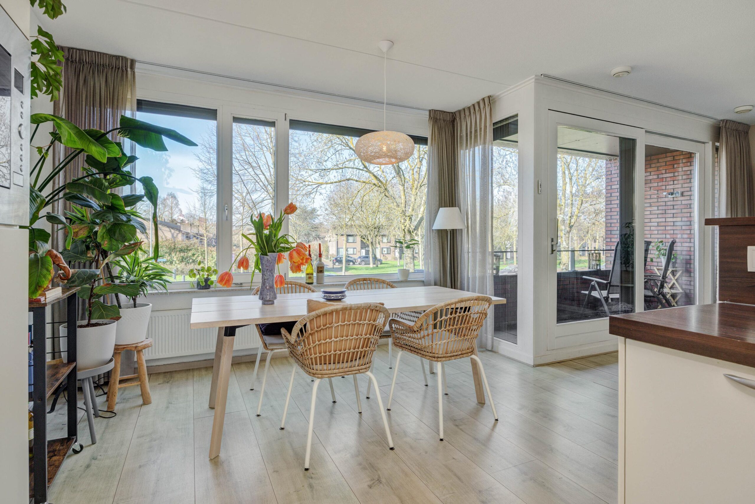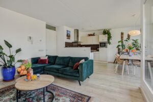 De ruime en lichte woonkamer is voorzien van grote raampartijen die zorgen voor veel lichtinval. De ramen zijn voorzien van zonnescreens. De woonkamer is keurig afgewerkt met een nette laminaatvloer en via de schuifpui is het zonnige balkon op het westen bereikbaar. Een fijne plek om in de zon te zitten!