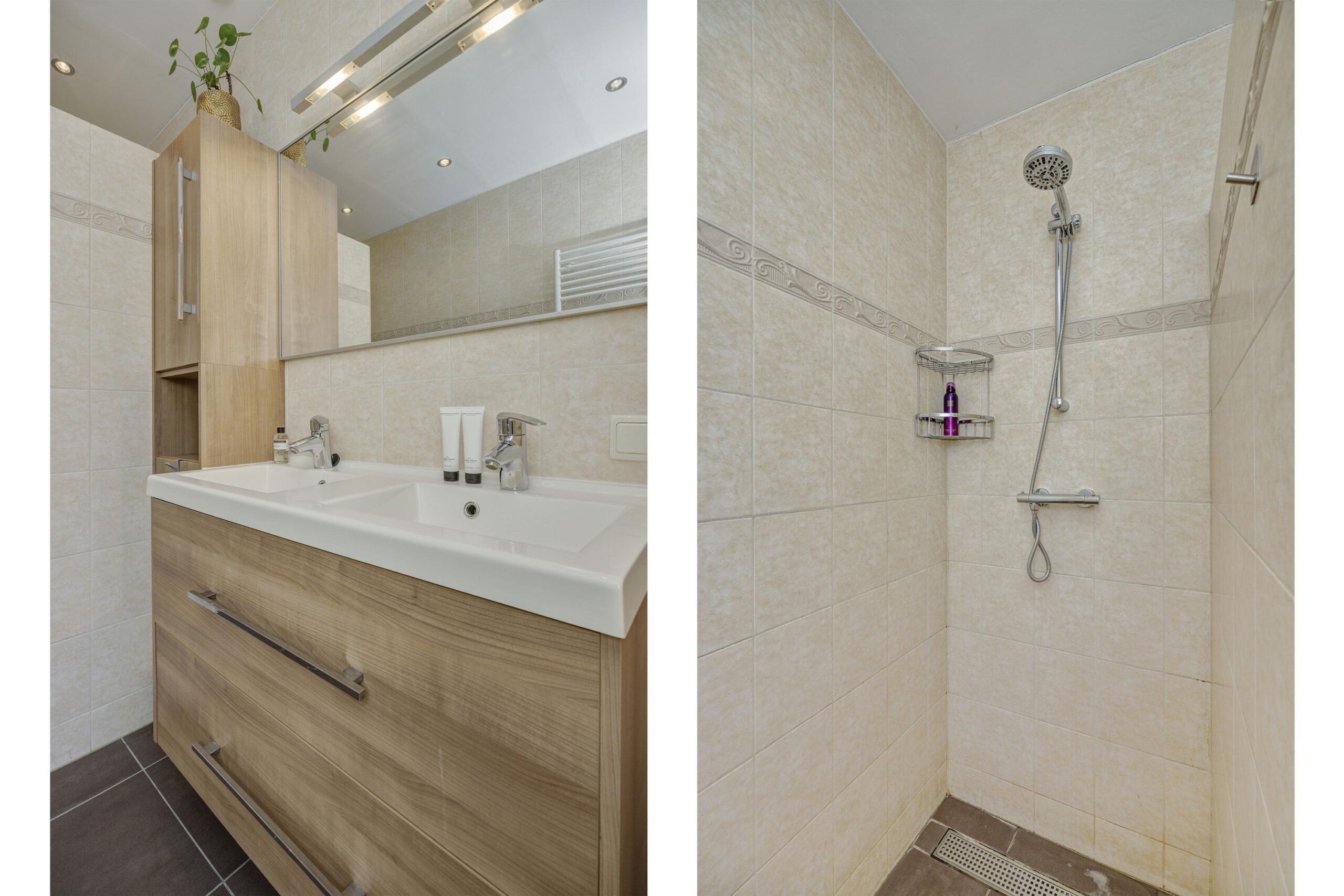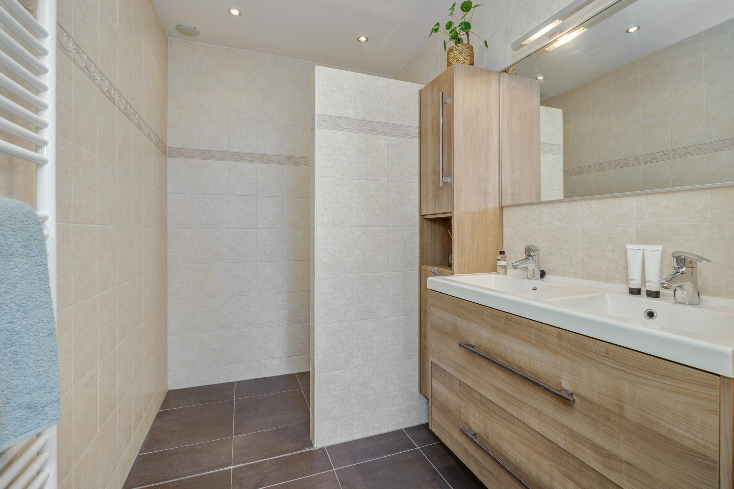 Tenslotte bereiken we de badkamer, welke volledig is betegeld met een lichte wandtegel en een bruine vloertegel. De badkamer is voorzien van een inloopdouche, dubbele wastafel met meubel, hangkast, spiegel en designradiator. Het separate toilet is voorzien van een wandcloset en fonteintje.