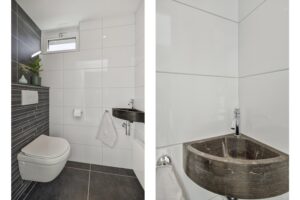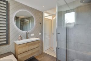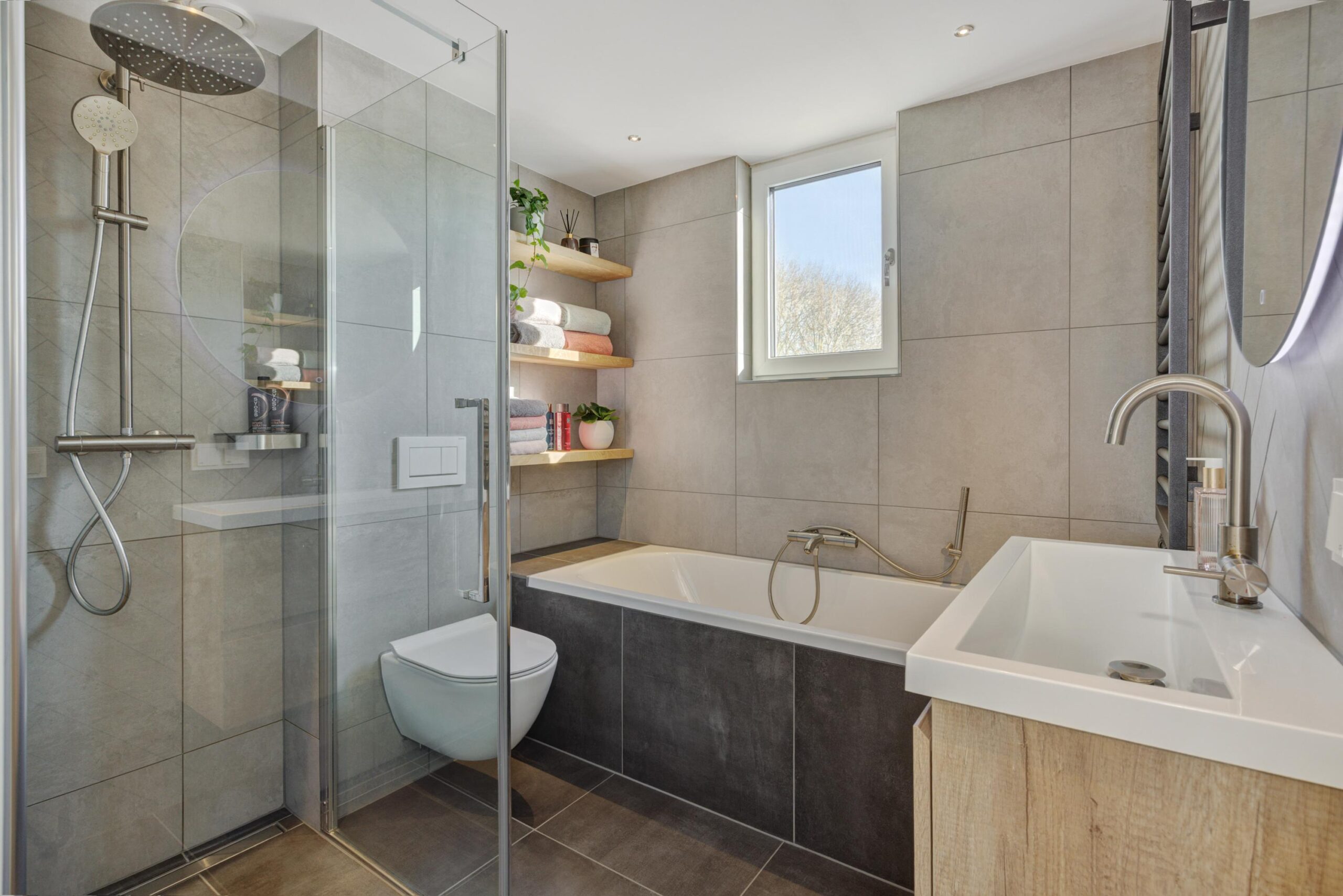 De moderne badkamer (2022) is compleet en luxe uitgevoerd met een ligbad, inloopdouche, toilet en wastafel. Daarnaast is de badkamer voorzien van elektrische vloerverwarming, een spiegel met verlichting een raam en mechanische ventilatie.