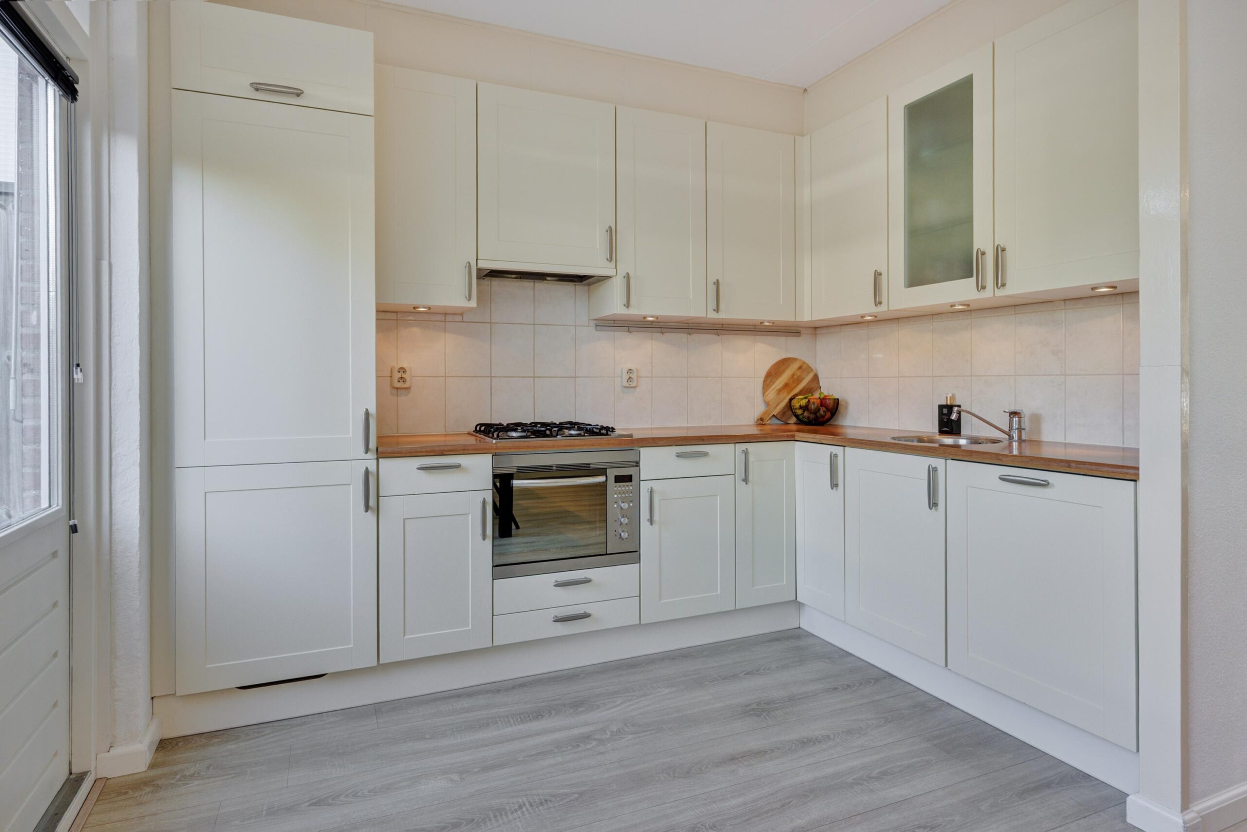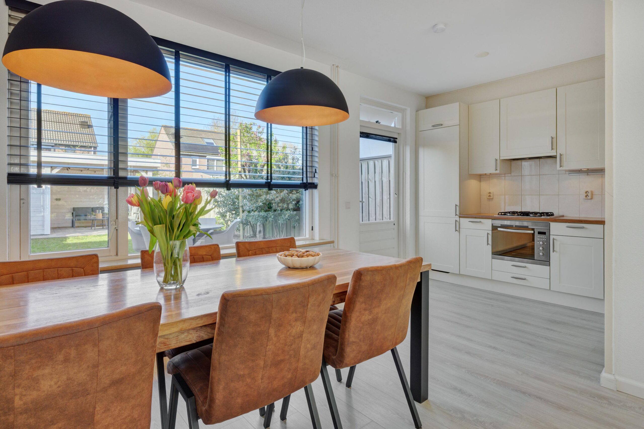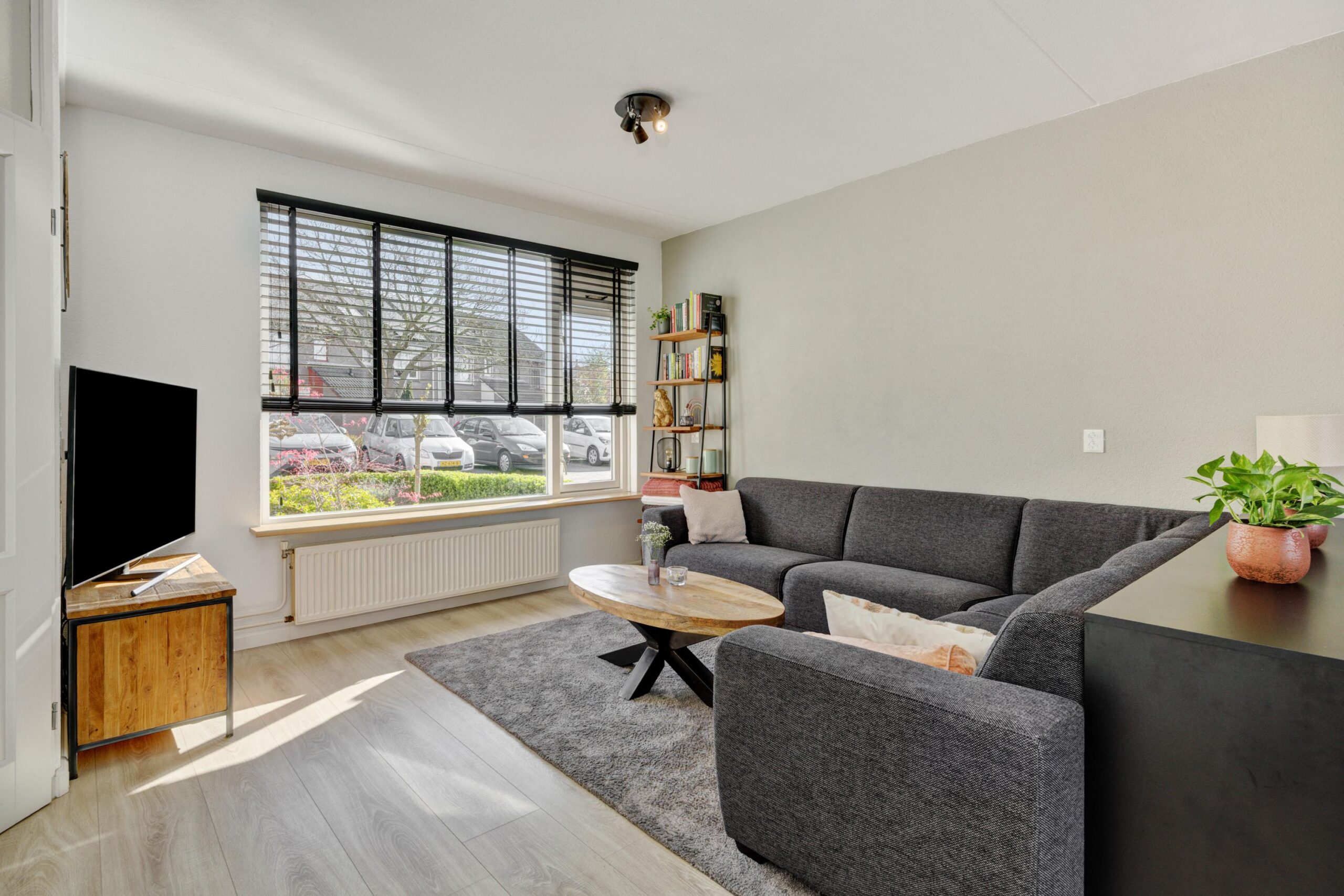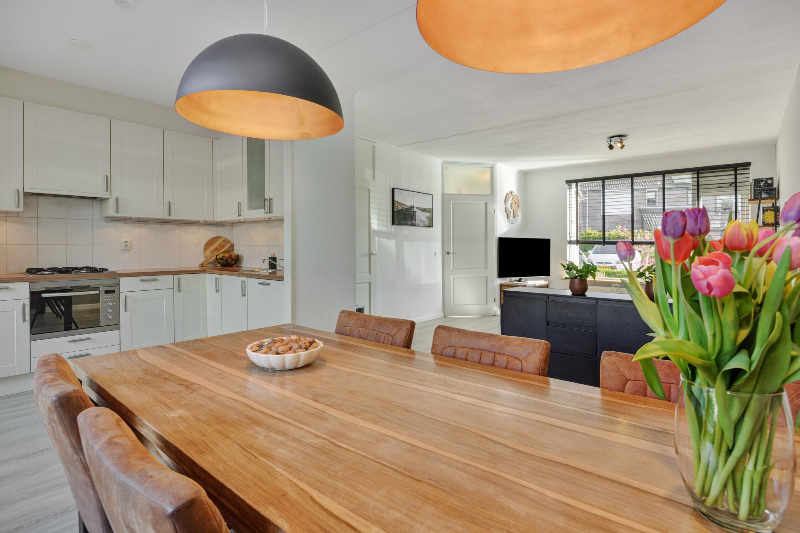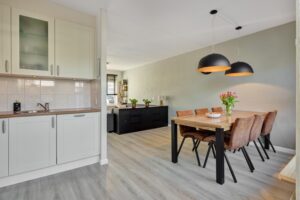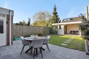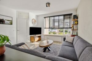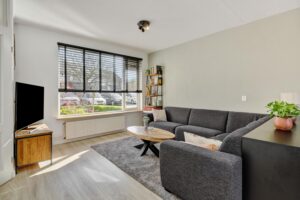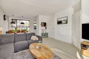 De woonkamer staat in open verbinding met de keuken, wat zorgt voor een prettige en ruimtelijke leefomgeving. Vanuit de keuken heeft u toegang tot de zonnige achtertuin.