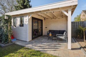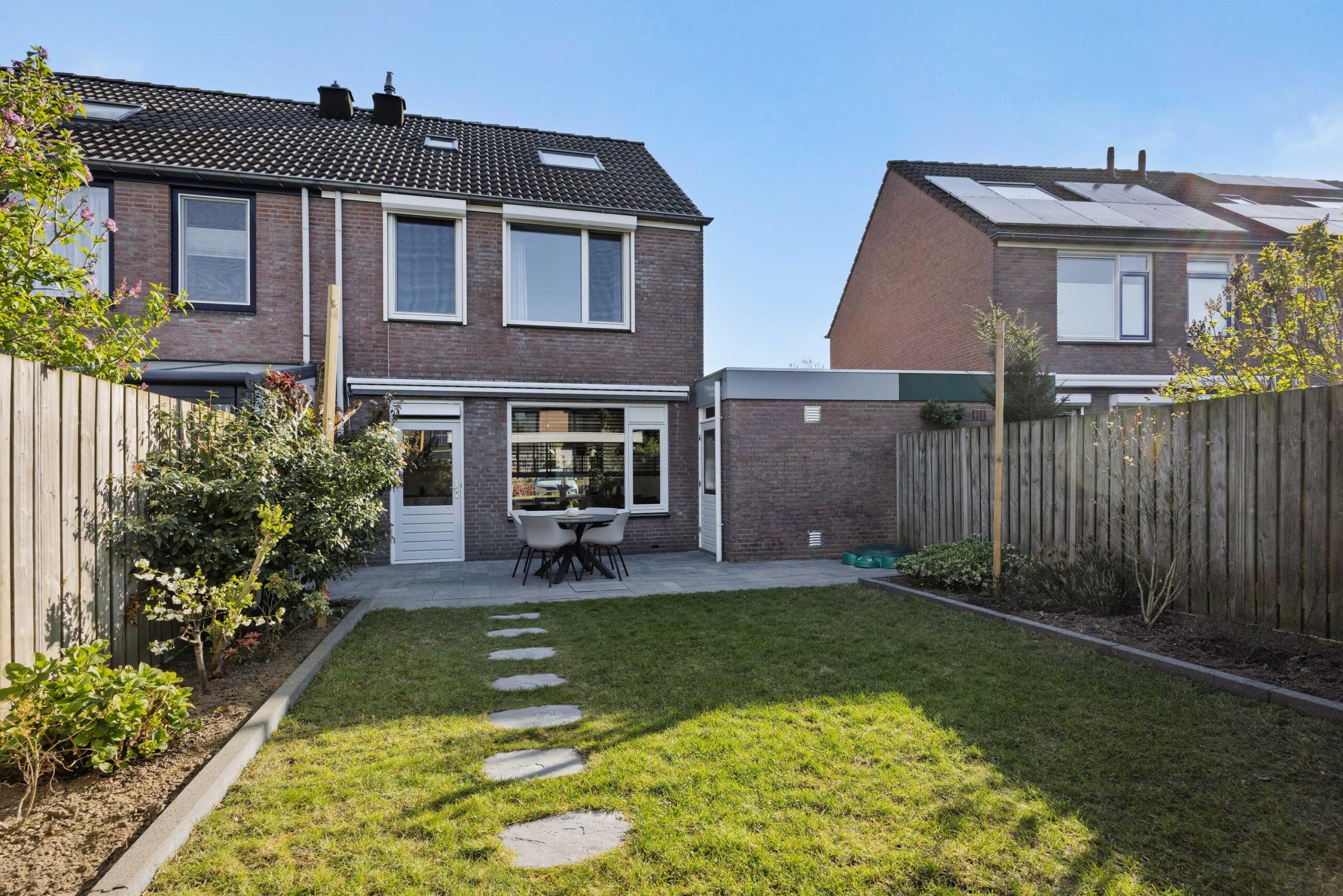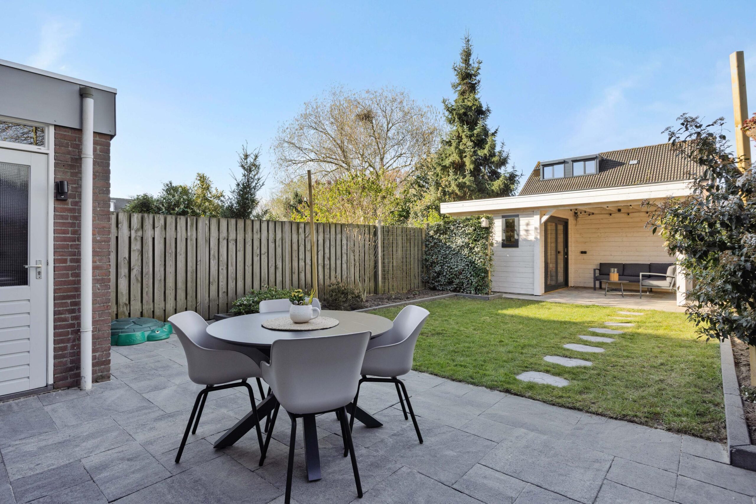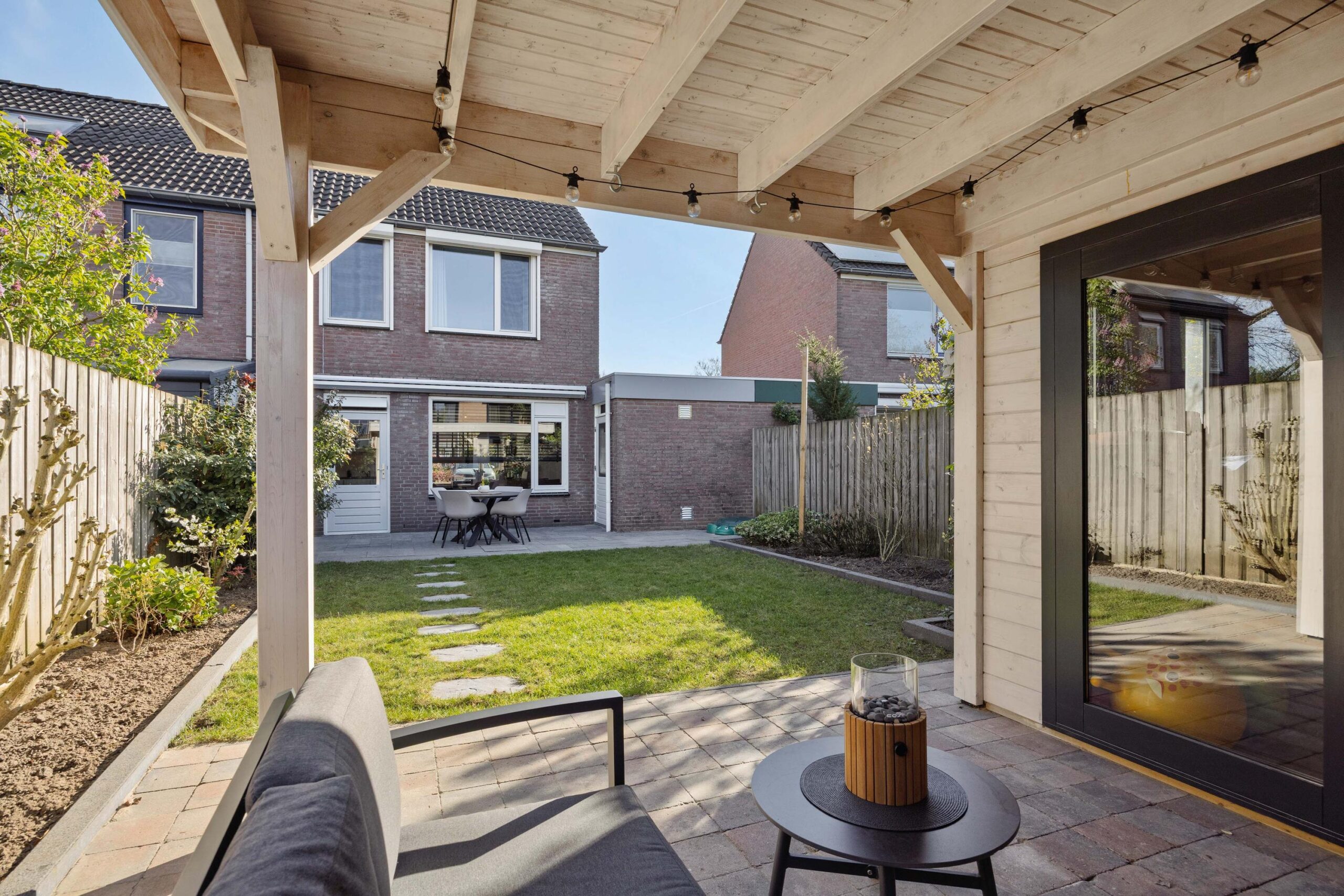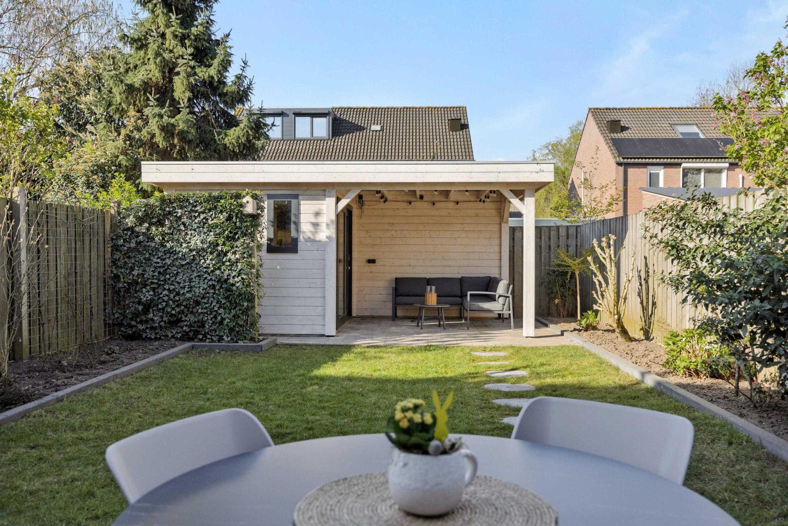 De achtertuin is gelegen op het zonnige zuidwesten en is verzorgd aangelegd met een grasgazon, borders met beplanting en meerdere terrassen. Daarnaast beschikt de tuin over een zonneluifel aan de achtergevel, een grote sfeervolle overkapping (2019) en een houten berging met elektra. Aan de voorzijde van de tuin bevindt zich tevens een stenen berging met directe toegang tot de oprit en carport.