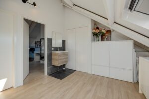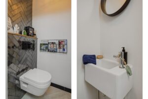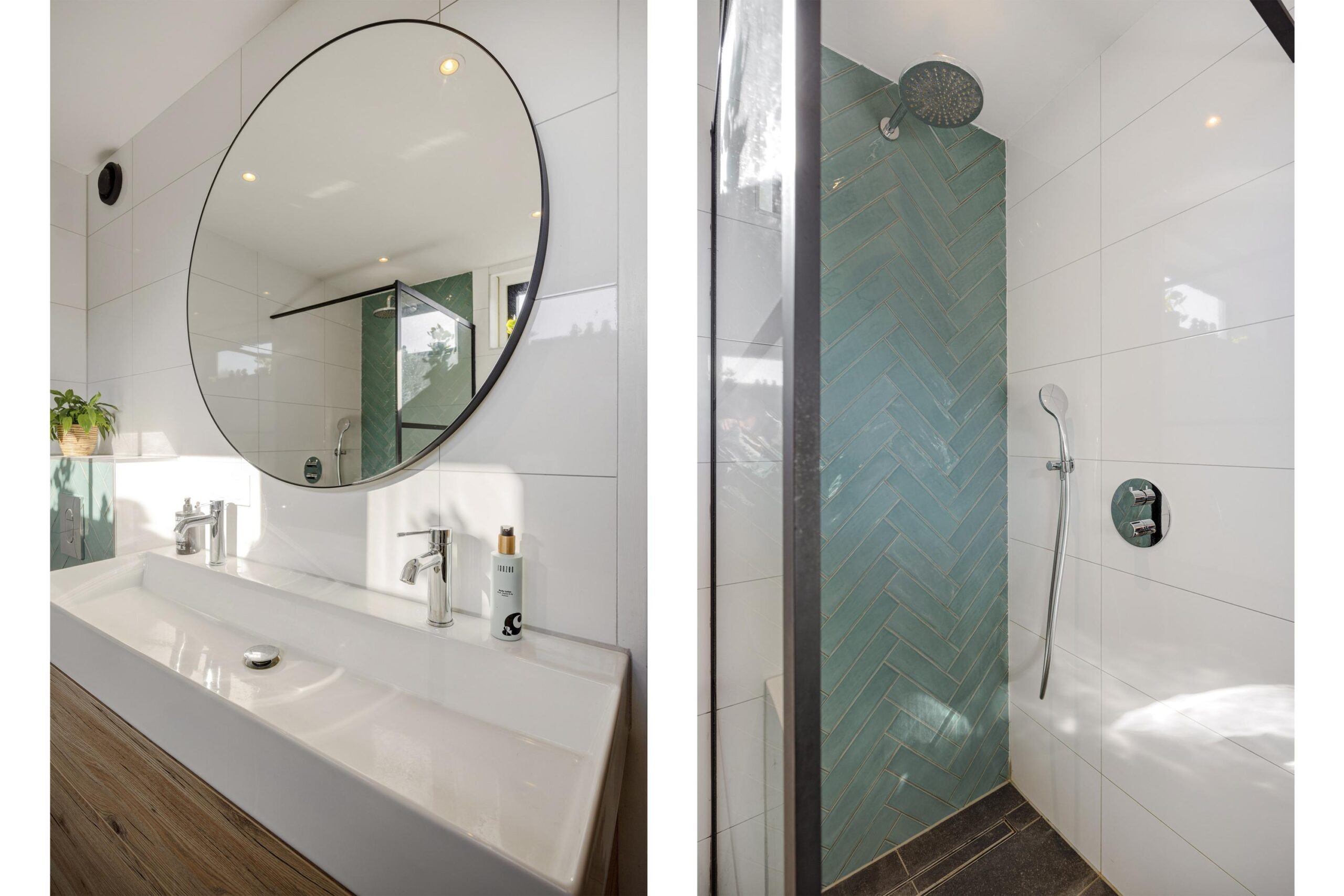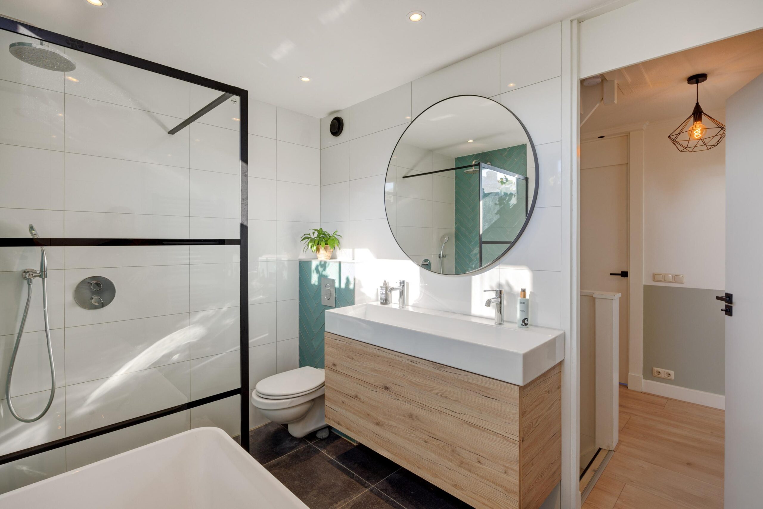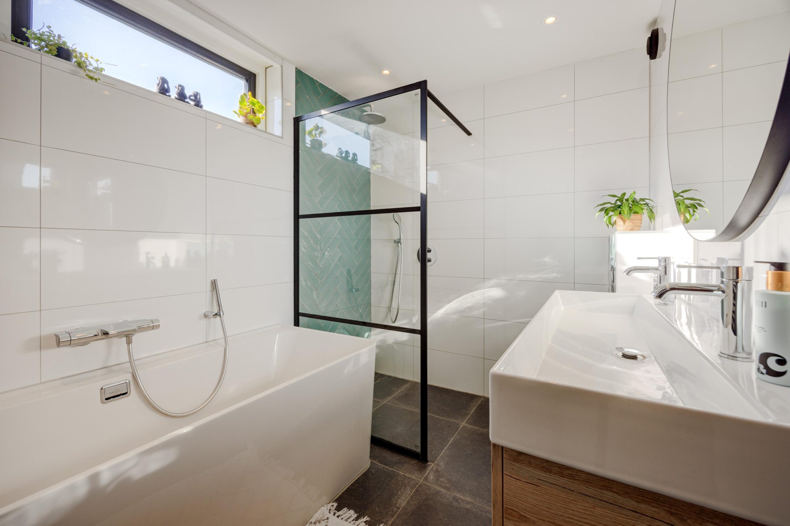 Tenslotte bereiken we de in 2020 vernieuwde badkamer. De badkamer is volledig betegeld met een witte wandtegel, visgraat achterwand bij de douche en het toilet en een antraciet vloertegel, en is voorzien van een ligbad, inloopdouche, wastafel met meubel, spiegel, wandcloset en designradiator.