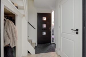 Via de entree aan de zijkant van de woning komen we in de hal met meterkast, garderoberuimte, toiletruimte (met wandcloset en fonteintje) en toegang tot de woonkamer. Tevens bevindt zich in de hal de trapopgang naar de eerste verdieping.