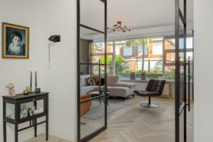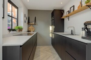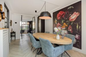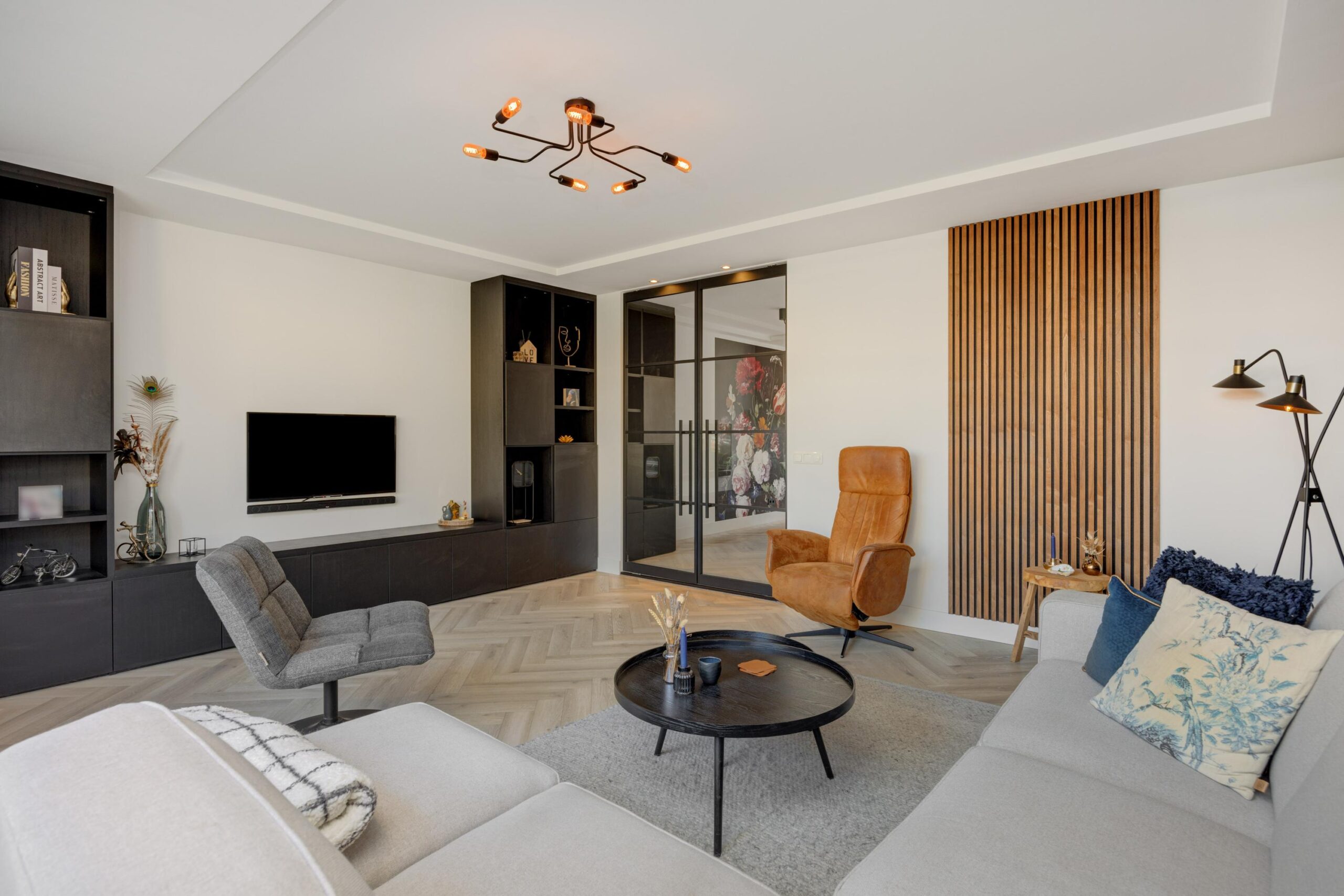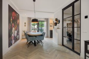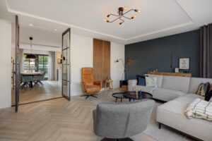 Als we verder doorlopen komen we via de zwarte aluminium deur in de eetkamer en keuken met doorloop naar de woonkamer aan de voorzijde. De keuken en de woonkamer worden via een roomdivider met openslaande deuren van elkaar gescheiden. Een fantastische eyecatcher! De woonkamer is voorzien van heerlijke grote raampartijen. Laat u verbazen over de goede en lichte afwerking.