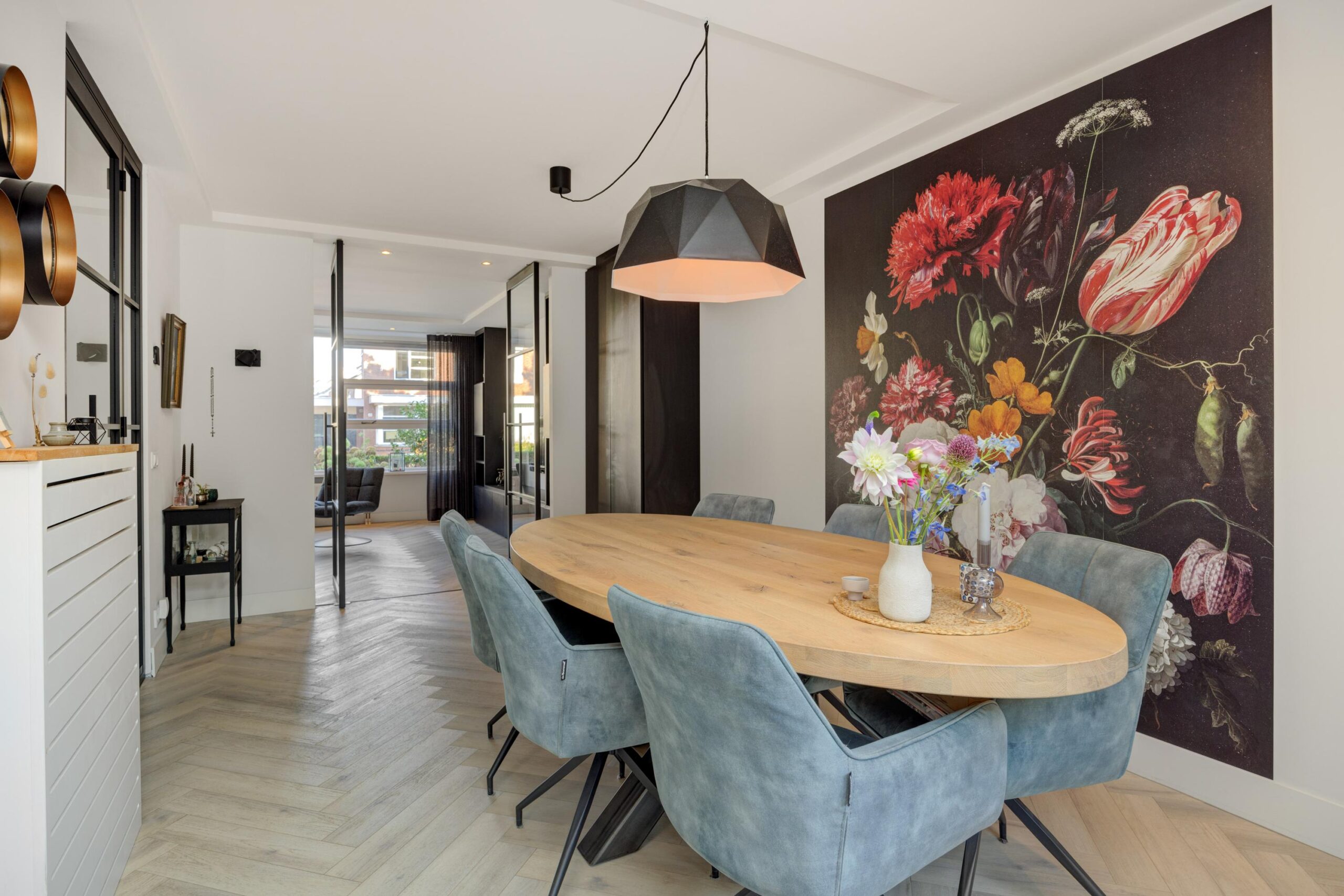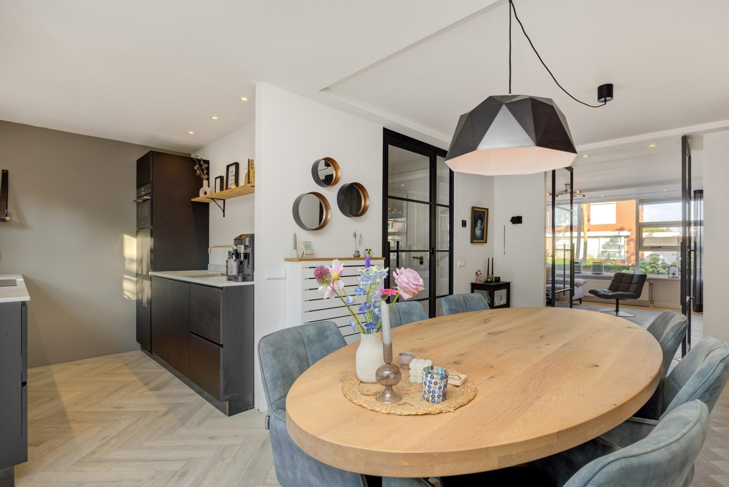 Aan de achterzijde van de woning is de eetkamer met doorloop naar de keuken gesitueerd. De keuken (2021) is geplaatst aan 2 zijden en is voorzien van de volgende inbouwapparatuur: combimagnetron, koelkast, vaatwasmachine, spoelbak, quooker, inductiekookplaat met afzuiging en opbergruimte in de kasten en lades. Via de openslaande tuindeuren is de achtertuin bereikbaar.