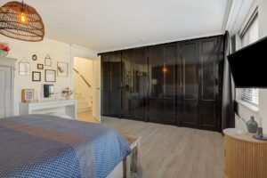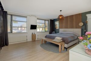 De masterbedroom is aan de voorzijde over de volle breedte van de woning gepositioneerd en is met ca. 24m² ruim van omvang. Deze kamer, met vaste kastenwand, kunt u weer verdelen in 2 kamers. Aan de achterzijde is de tweede slaapkamer gesitueerd.