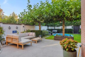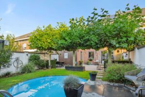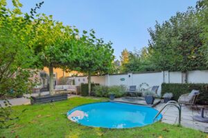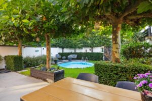 Vanuit de keuken is de ruime achtertuin te bereiken. De zonnige tuin is gelegen op het zuidoosten, u krijgt hier heerlijk veel zon in de tuin. De tuin, met achterom, is voorzien van keramische sierbestrating (2024), groenborders, gazon en sfeervolle leilindes. Als kers op de taart is de tuin voorzien van een klein rond zwembad, welke verwarmd kan worden via een warmtepomp. Een fijne en rustig gelegen tuin!