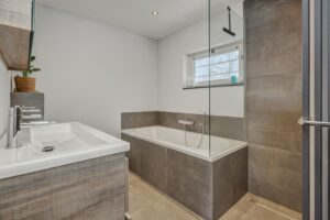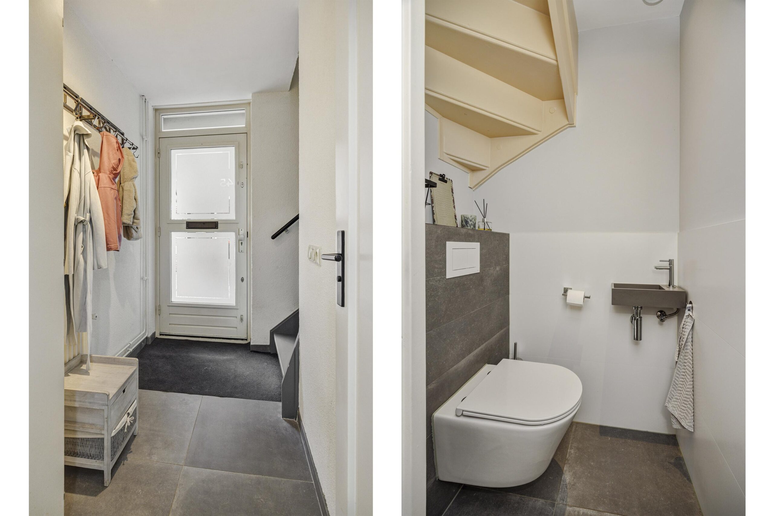 Via de voortuin met oprit en eigen parkeerplaats bereik je de overdekte entree van de woning. Je komt binnen in de hal met garderobe, uitgebreide meterkast, moderne toiletruimte met fonteintje (2022) en de trapopgang naar de eerste verdieping. De deuren bij het toilet en in de hal zijn extra hoog uitgevoerd.