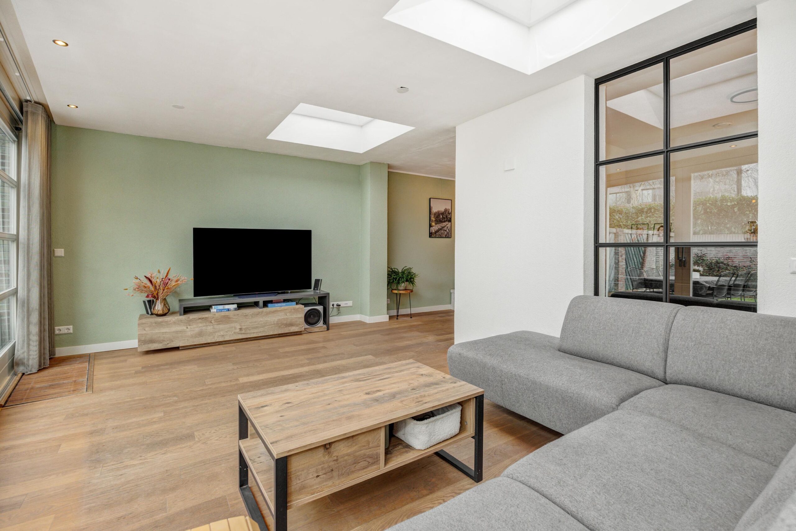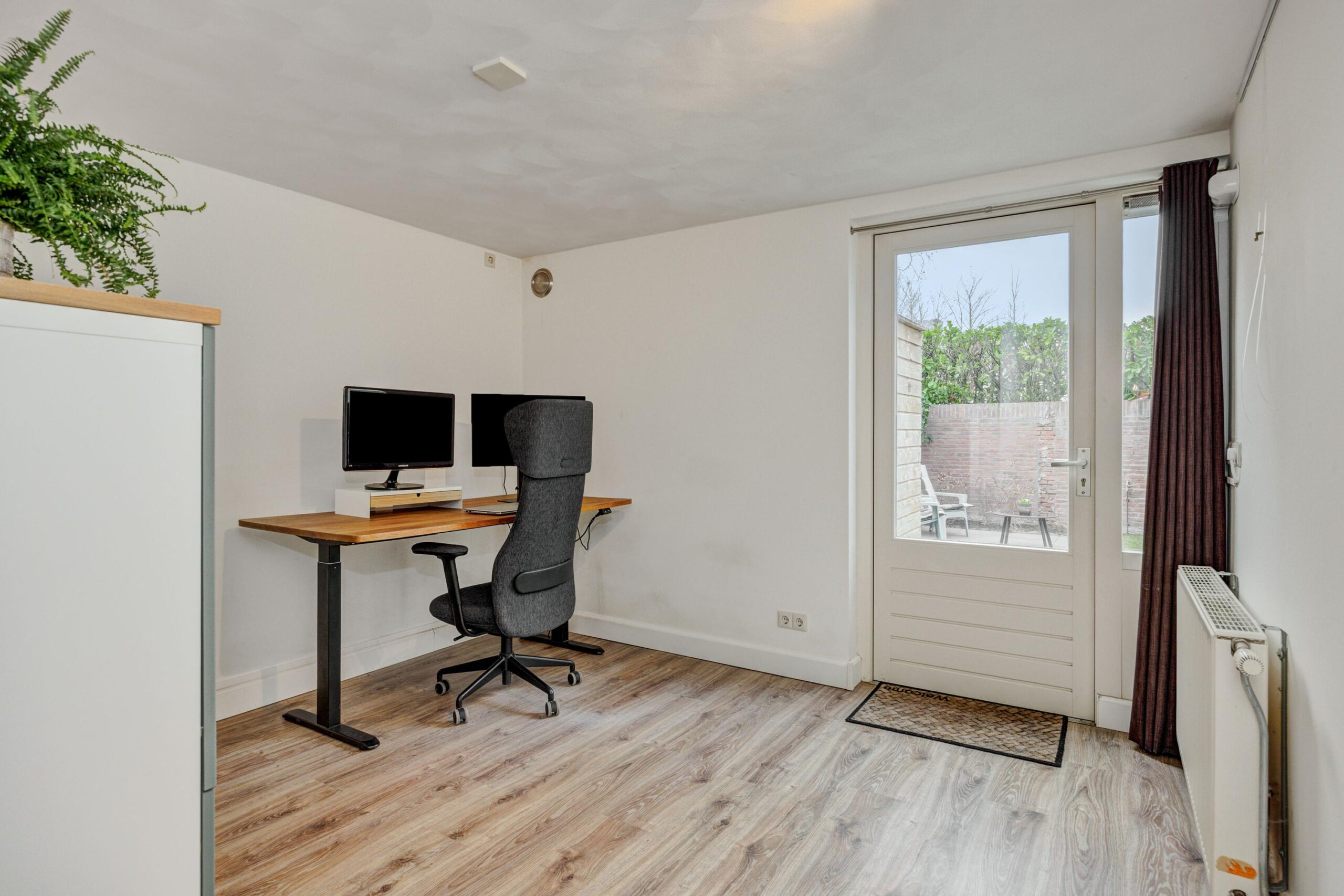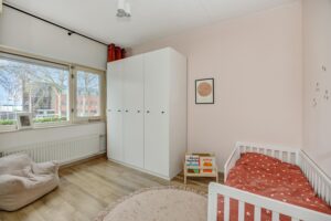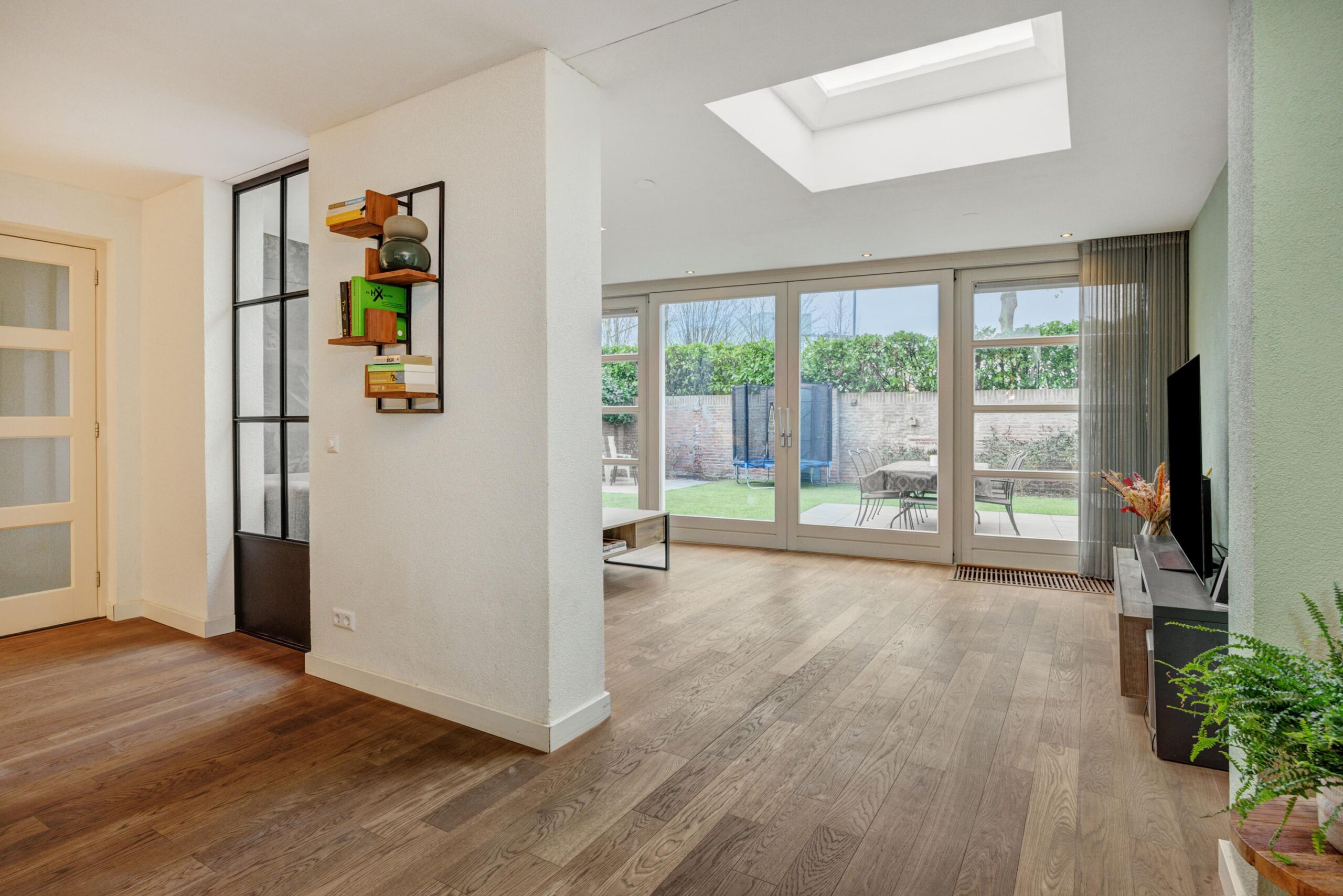 Een brede doorgang tussen de keuken en de woonkamer, voorzien van een mooi stalen raamkozijn, biedt toegang tot een fijne multifunctionele kamer. Deze ruimte is ideaal als werk- of speelkamer en biedt direct toegang tot de tuin en de (fietsen)berging. In de woonkamer ligt een lamelparketvloer en de ruimte is aan de achterzijde afgewerkt met een strak vernieuwd plafond met inbouwspots en een nagenoeg nieuwe airconditioning.