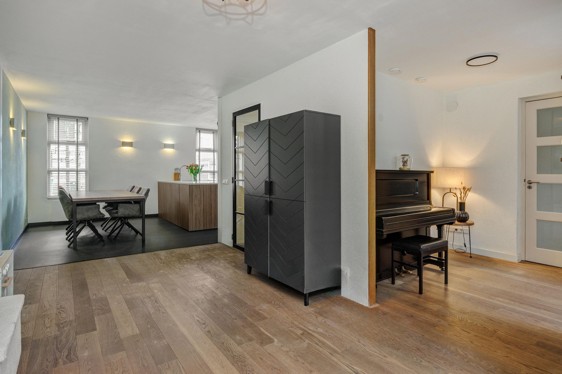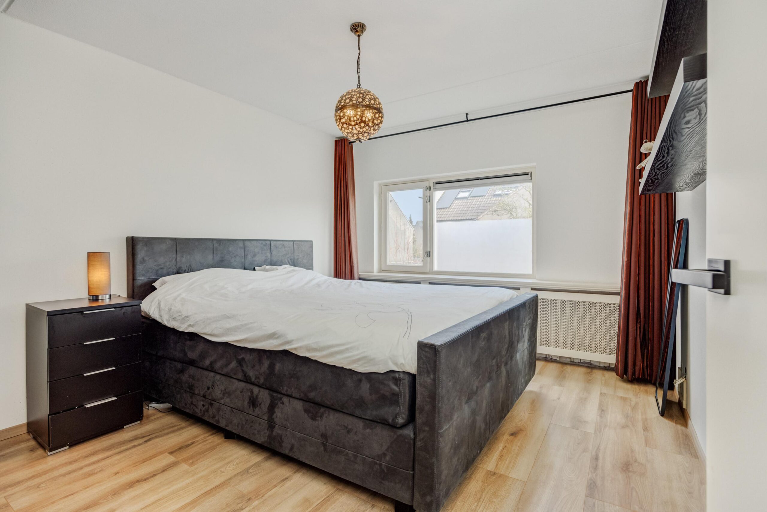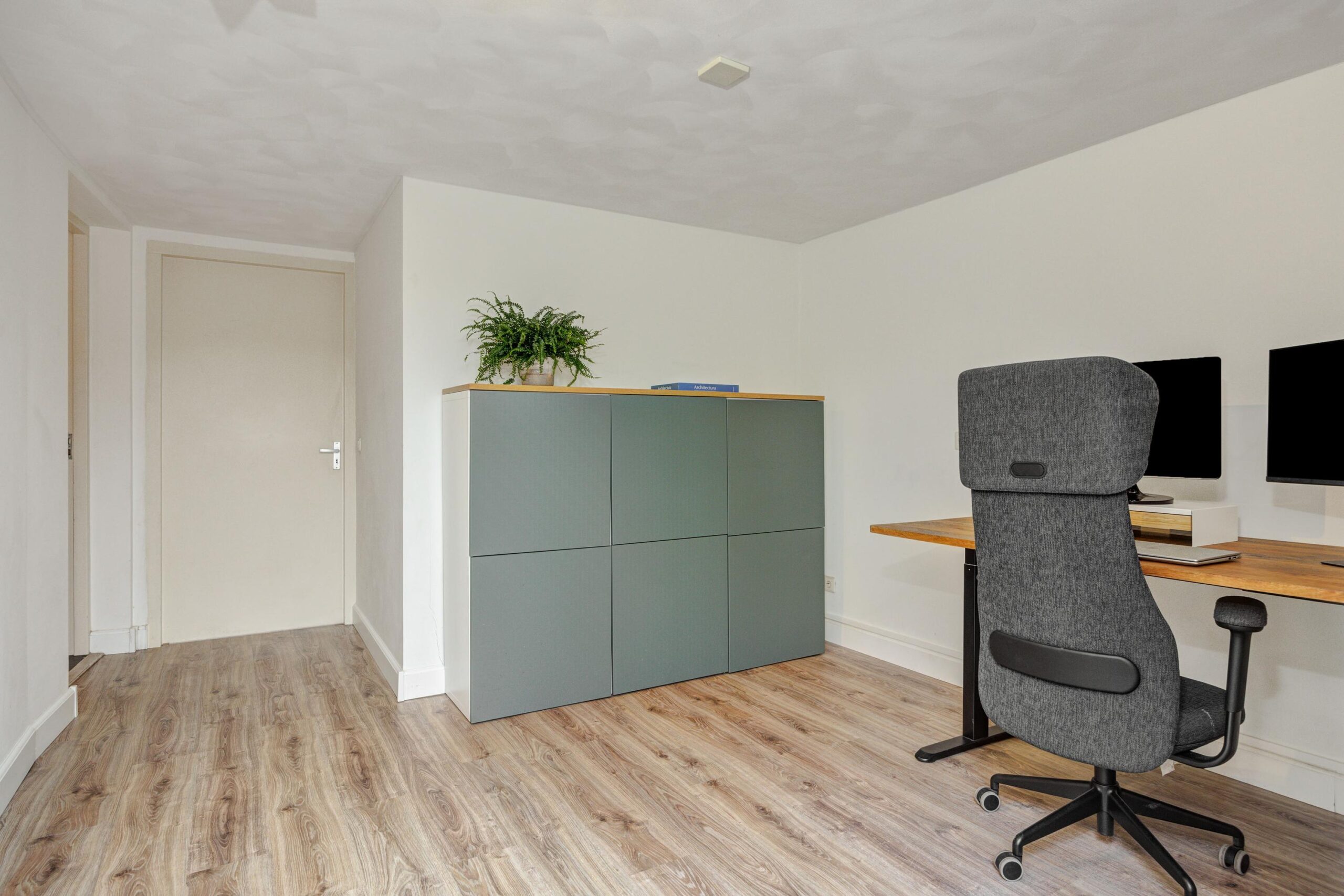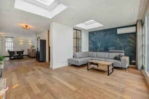 Een brede doorgang tussen de keuken en de woonkamer, voorzien van een mooi stalen raamkozijn, biedt toegang tot een fijne multifunctionele kamer. Deze ruimte is ideaal als werk- of speelkamer en biedt direct toegang tot de tuin en de (fietsen)berging. In de woonkamer ligt een lamelparketvloer en de ruimte is aan de achterzijde afgewerkt met een strak vernieuwd plafond met inbouwspots en een nagenoeg nieuwe airconditioning.