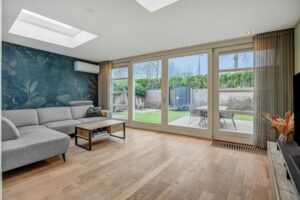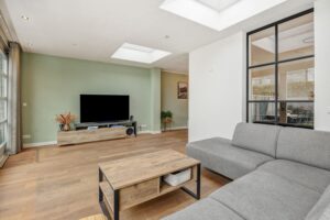 Via de hal loop je de ruime living binnen, waar je direct wordt begroet door een grote hoeveelheid daglicht. De woning is praktisch ingedeeld en beschikt over prettige ruimtes, zowel beneden als boven. De begane grond is aan de achterzijde uitgebouwd, waardoor een riante living is ontstaan. De grote schuifpui zorgt voor een prachtige verbinding met de tuin en twee lichtkoepels zorgen voor een fantastische lichtinval.