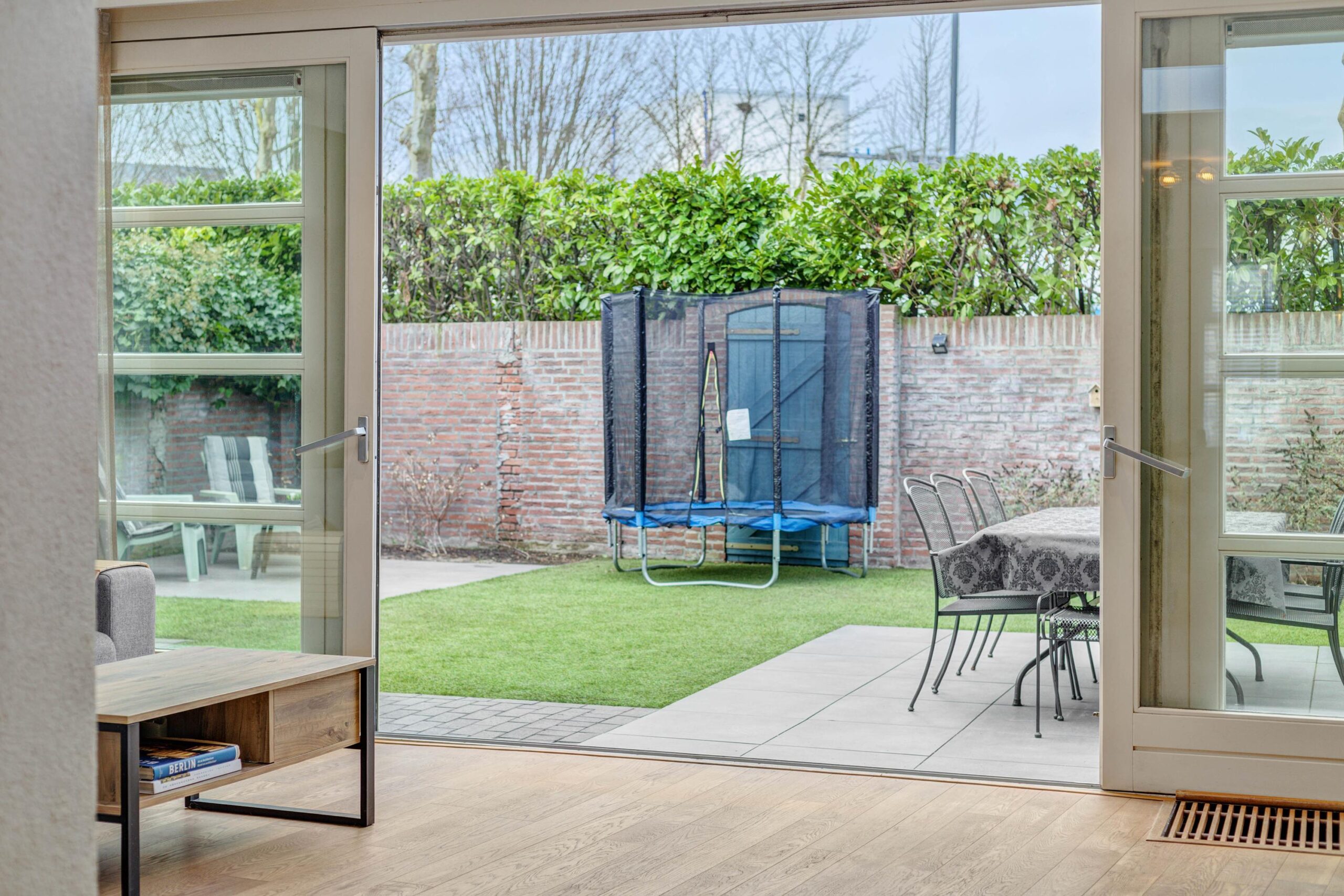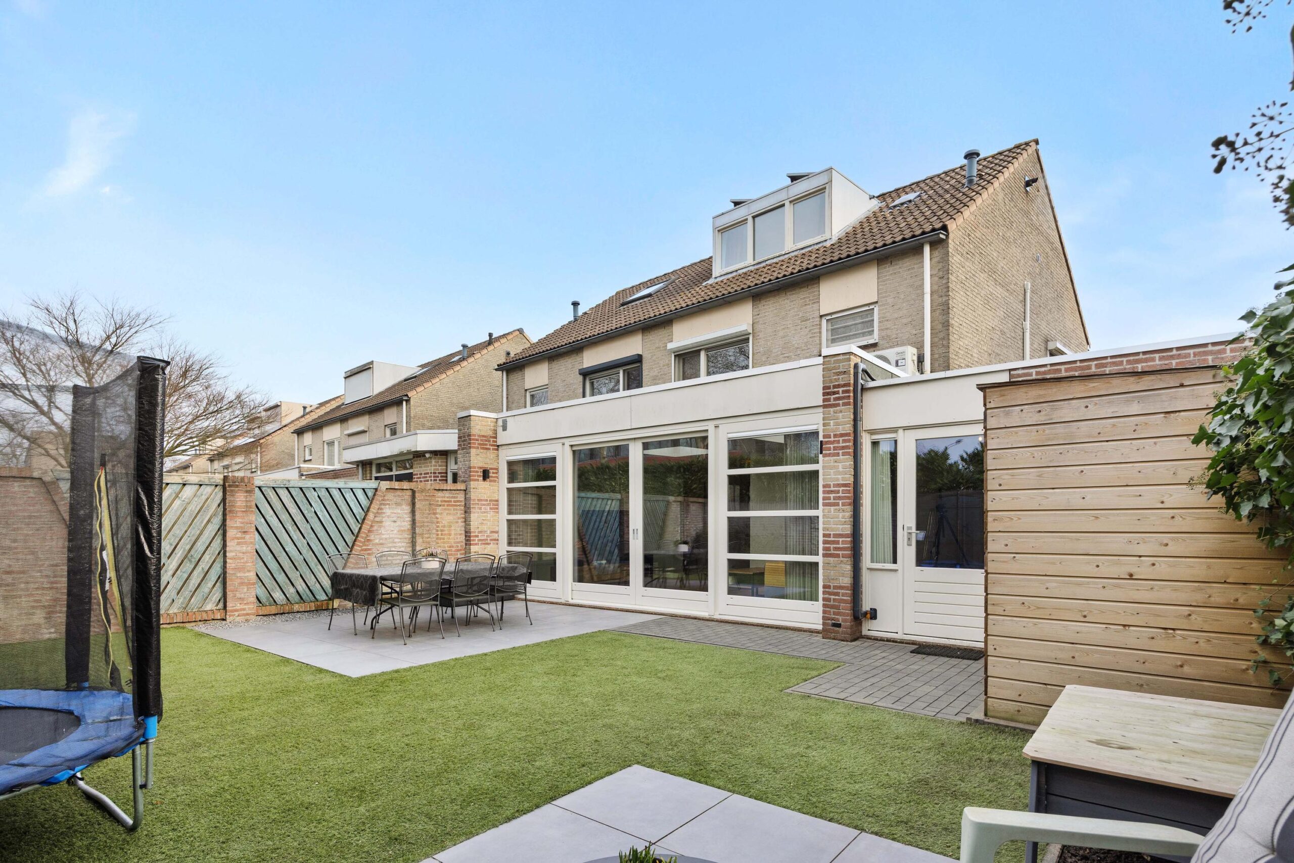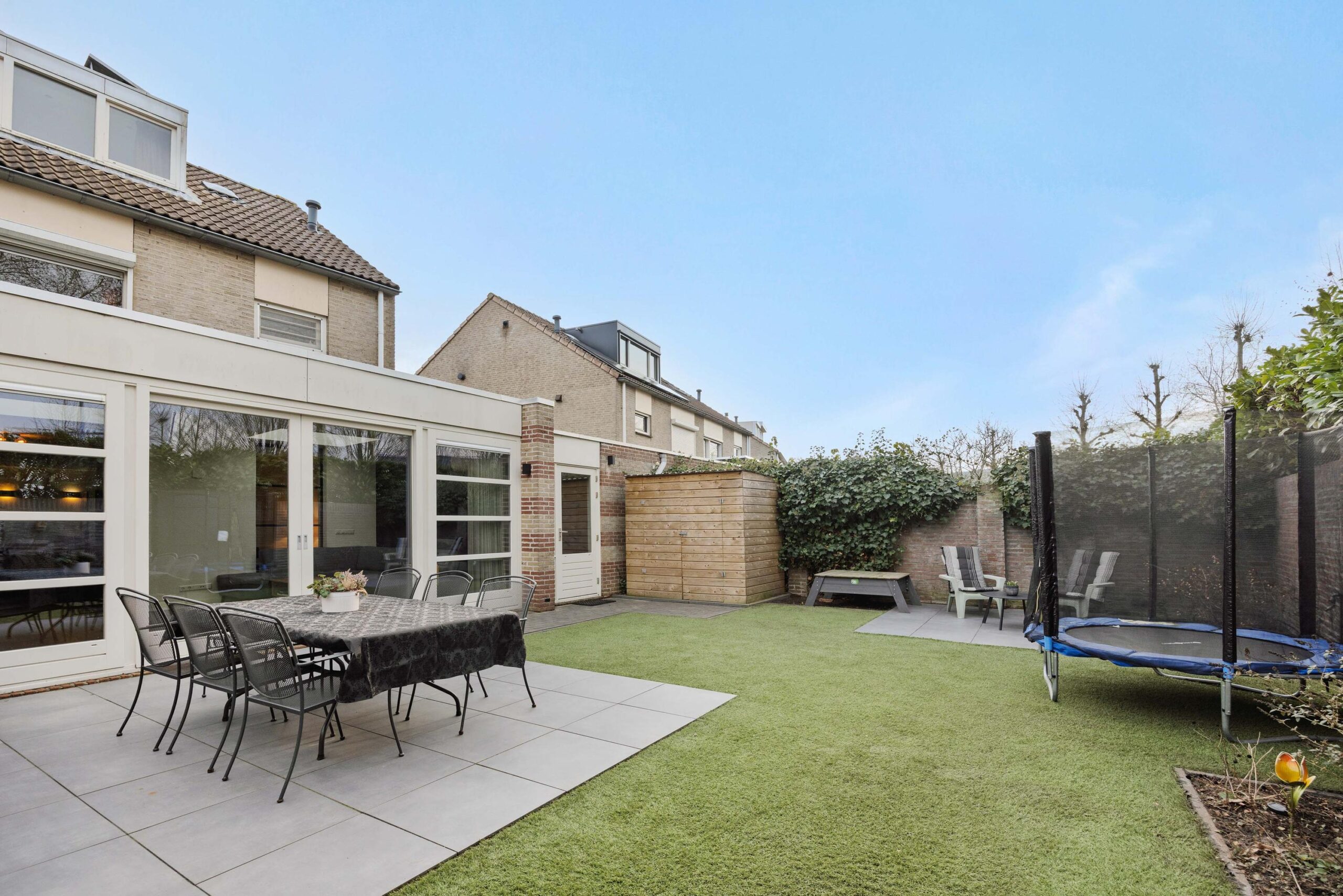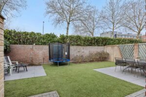 De achtertuin is een heerlijk verlengstuk van de woonkamer. De tuin is in 2022 opnieuw aangelegd met een terras van keramische tegels, een kunstgrasgazon, gemetselde erfafscheiding en een houten berging. Door de vrije ligging aan de achterzijde geniet je hier van optimale privacy en alle rust van het buitenleven.