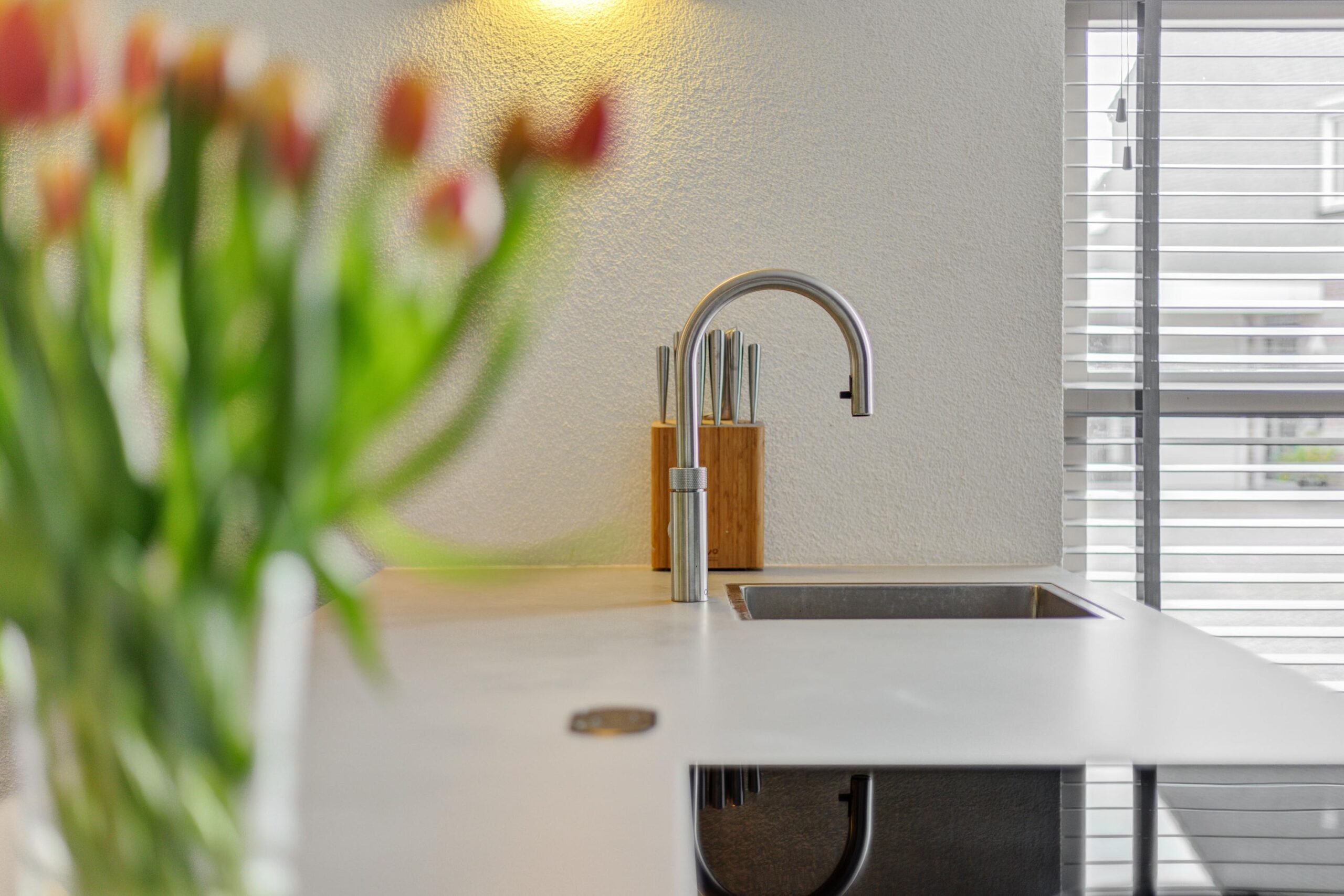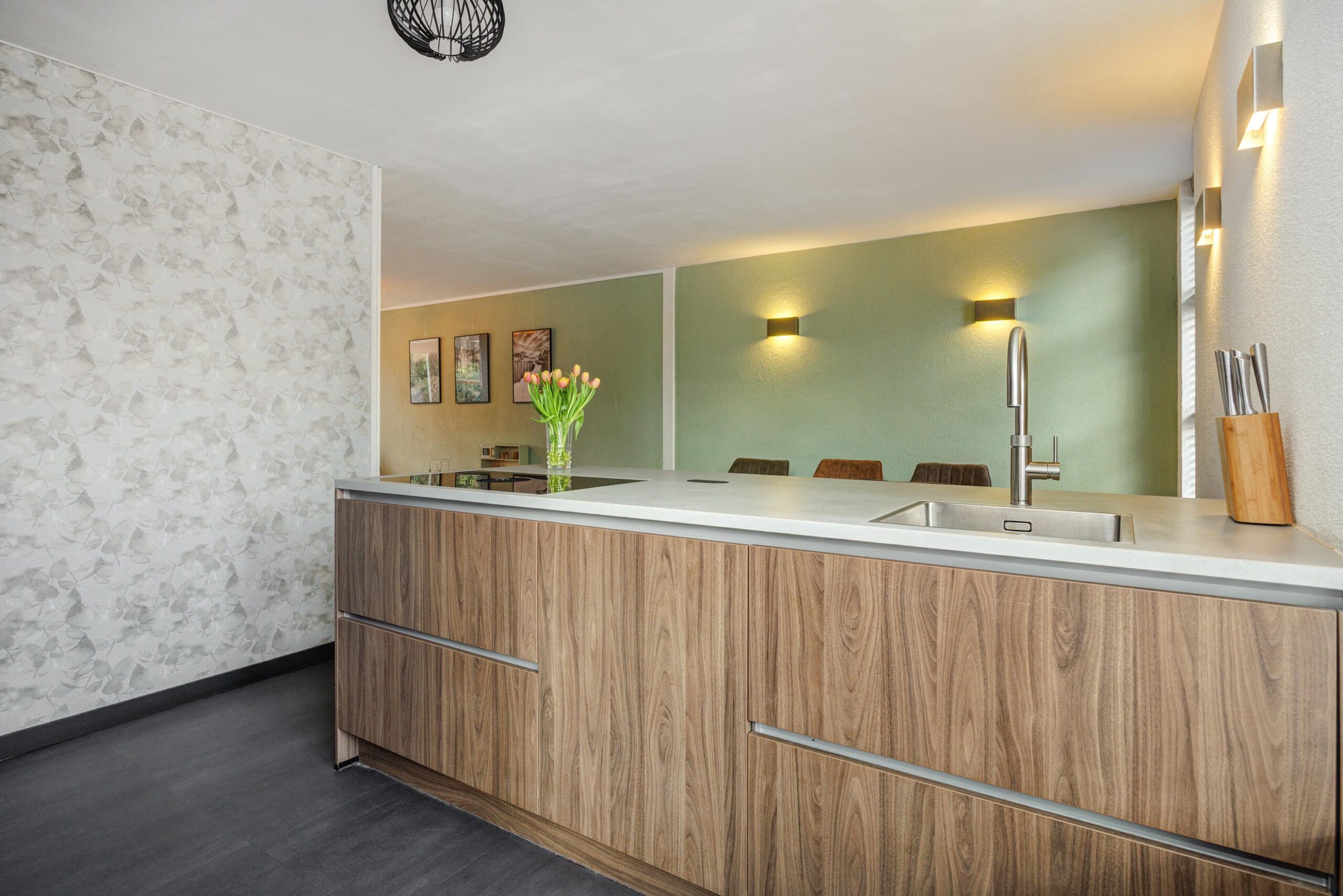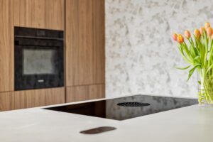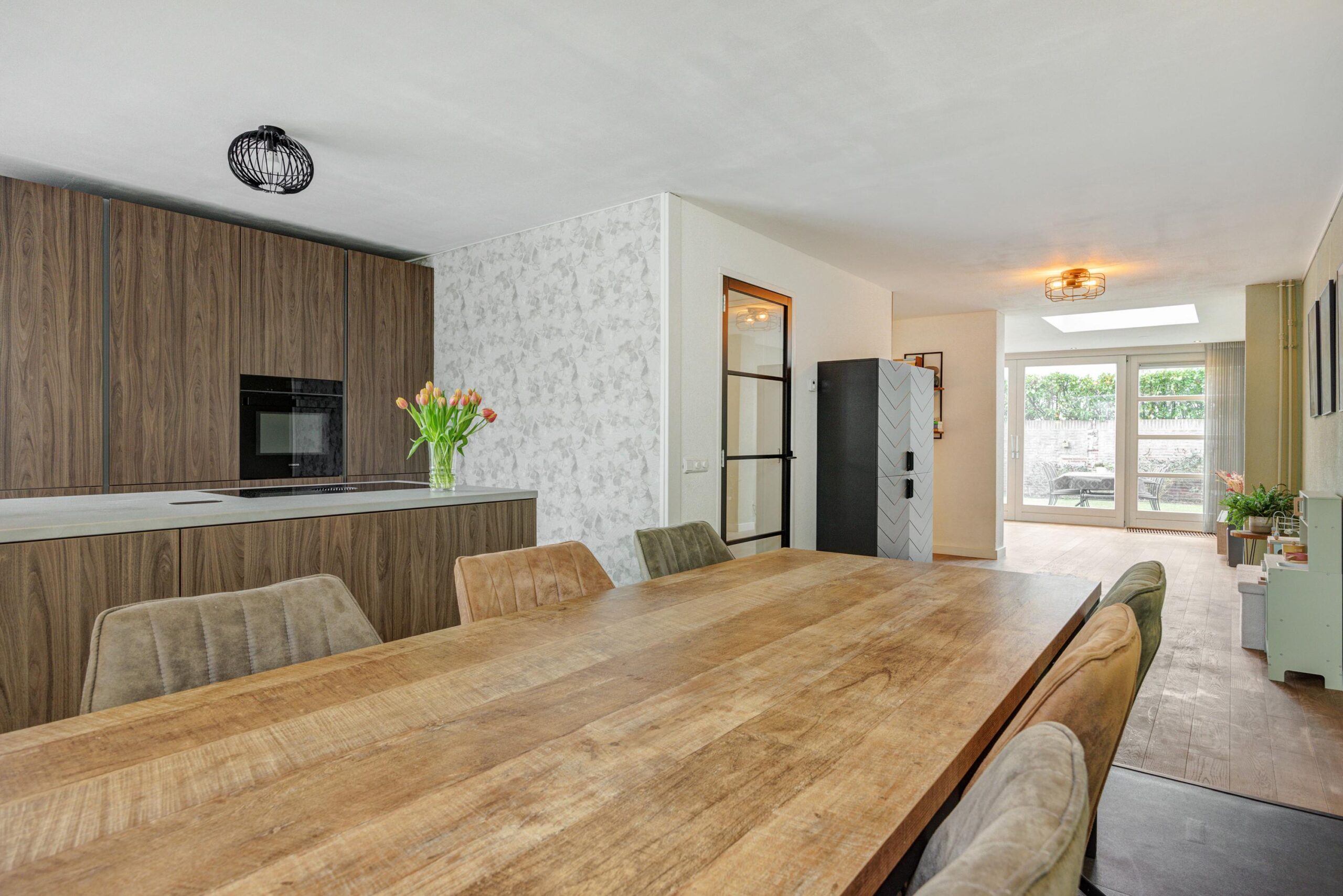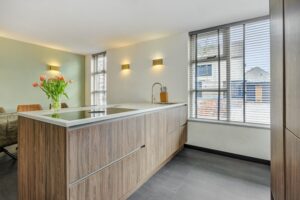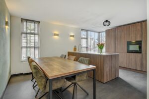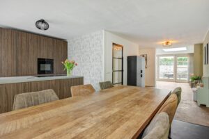 De moderne keuken aan de voorzijde (geplaatst in 2023) is een droom voor iedere kookliefhebber. De keuken is uitgerust met een prachtig composiet aanrechtblad, een schiereiland met Bora-inductiekookplaat, Quooker en een vaatwasser. De wandopstelling beschikt over een combi-oven en een grote koelkast. Een mooi hoekraam zorgt voor een zeer aangename lichtinval. De keukenvloer is afgewerkt met PVC-tegels en biedt voldoende ruimte voor het plaatsen van een grote eettafel.