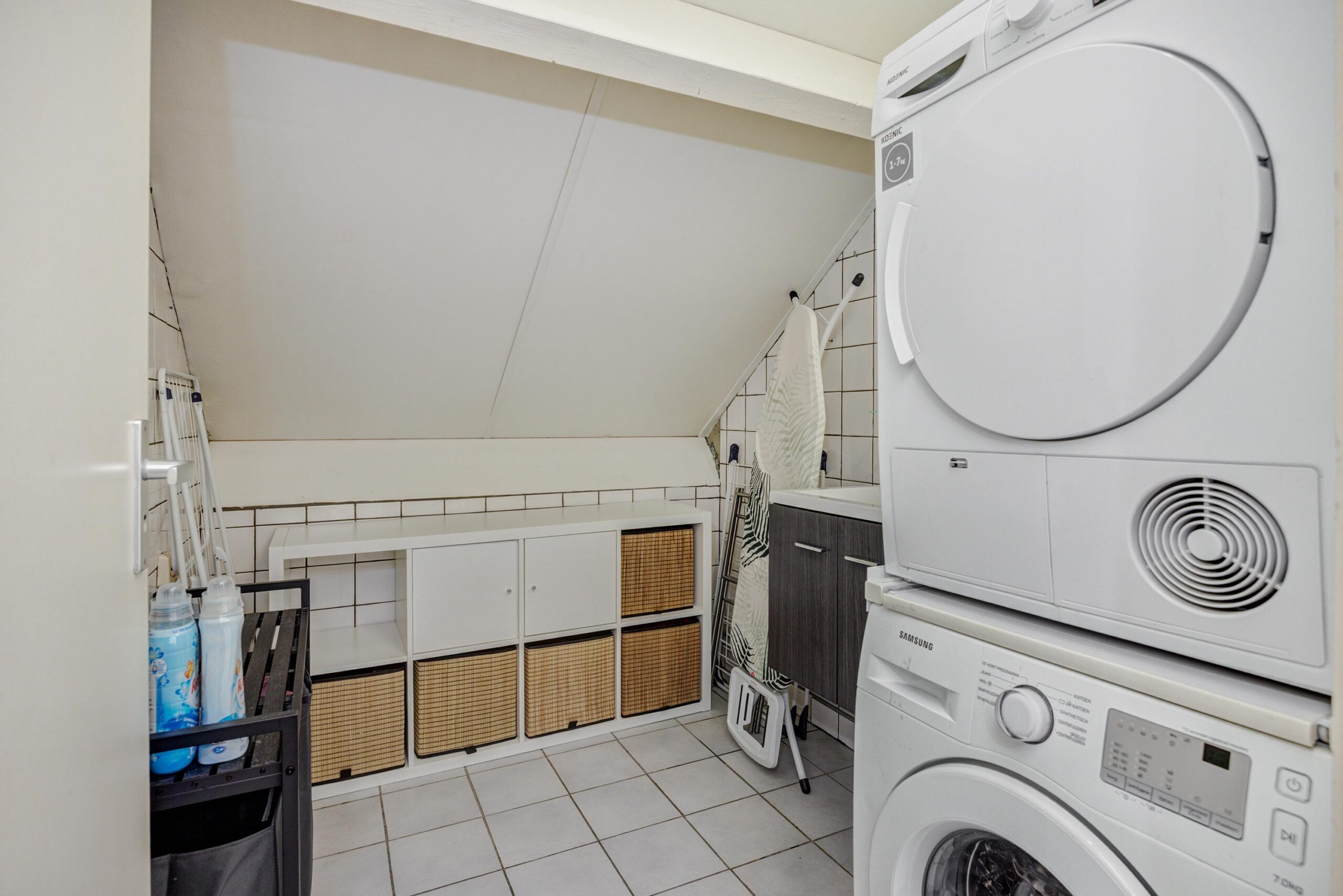 Voorzolder met doorgang naar de vierde volwaardige slaapkamer, welke is voorzien van een dakkapel, een dakraam, airconditioning en bergruimte achter de knieschotten over de volle breedte van de woning. Vanaf de voorzolder is er toegang tot een wasruimte met wastafelmeubel en de aansluitingen voor wasapparatuur. Er bestaat de mogelijkheid om hier eenvoudig een tweede badkamer te creëren. Tevens bevindt zich hier een aparte ruimte voor de opstelling van de CV-ketel.