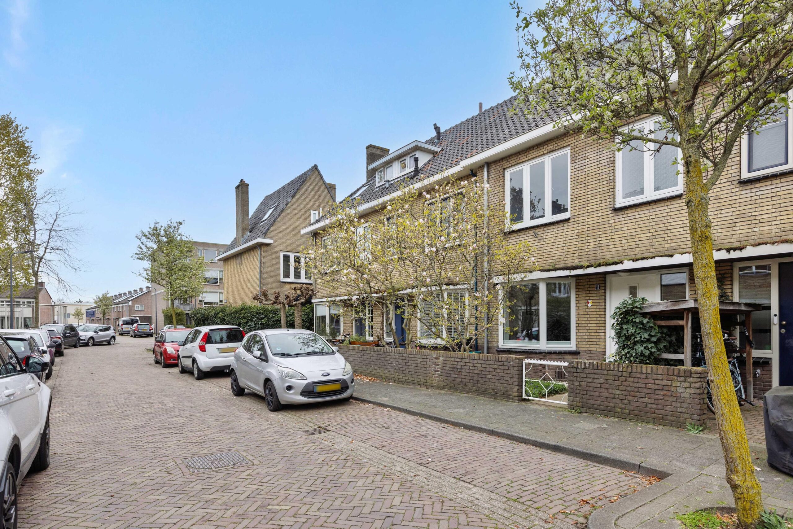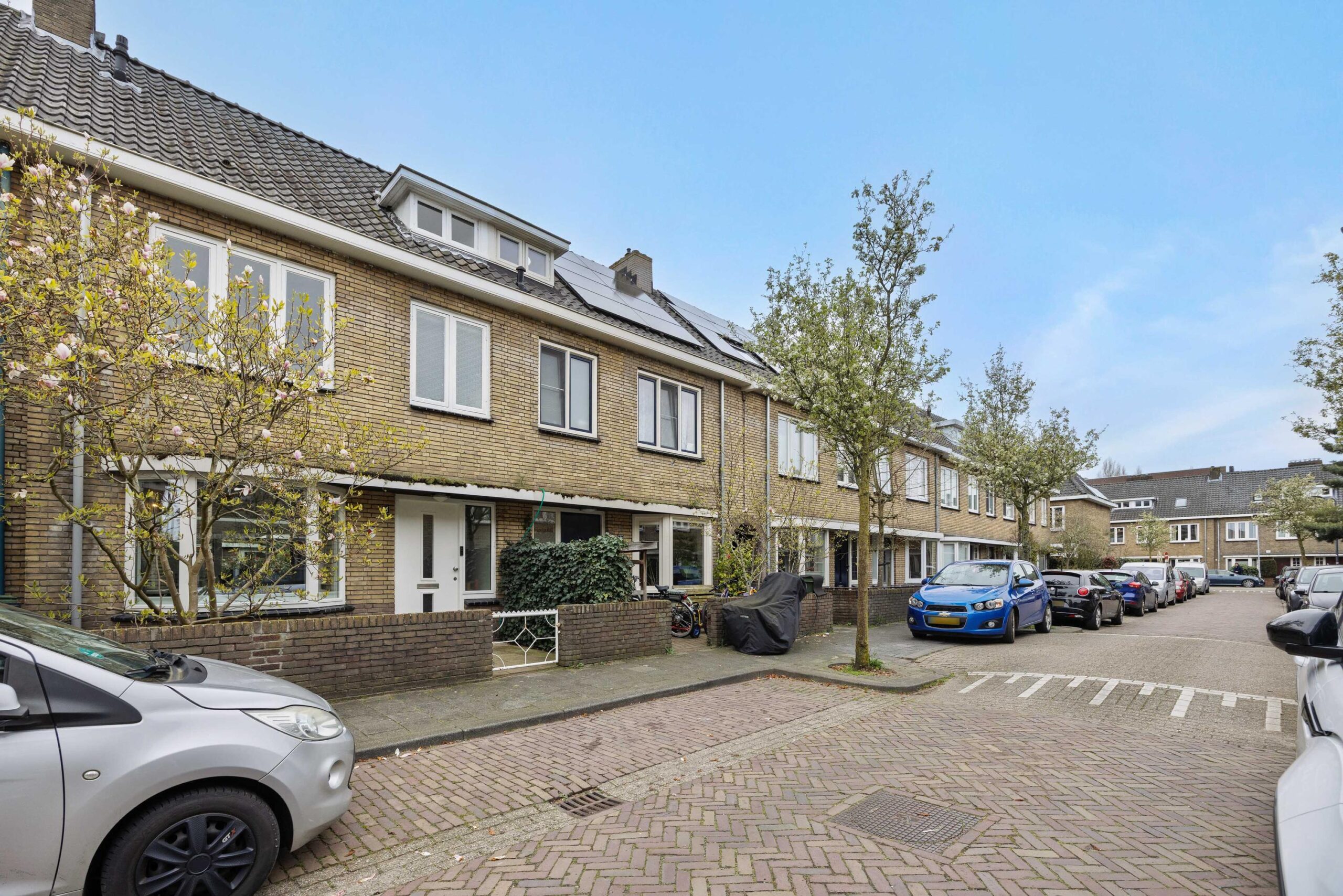 De voortuin is voorzien van diverse groenborders met magnolia boom, sierbestrating en een sedum dak bij de entree van de woning.