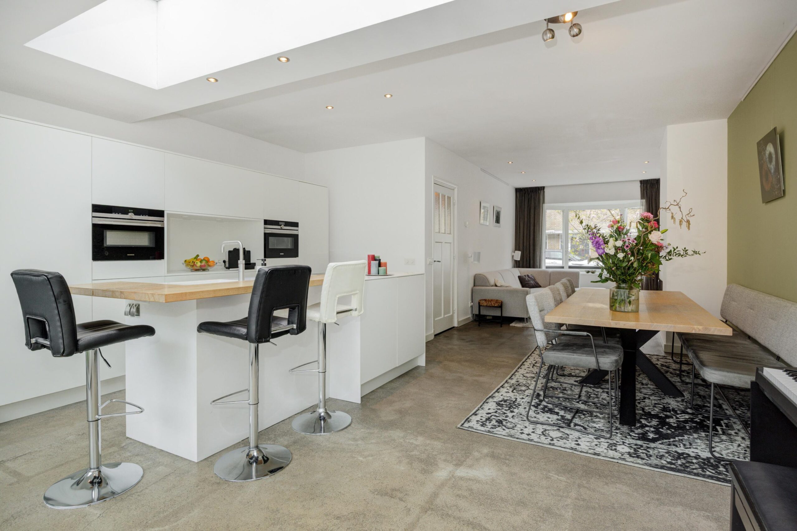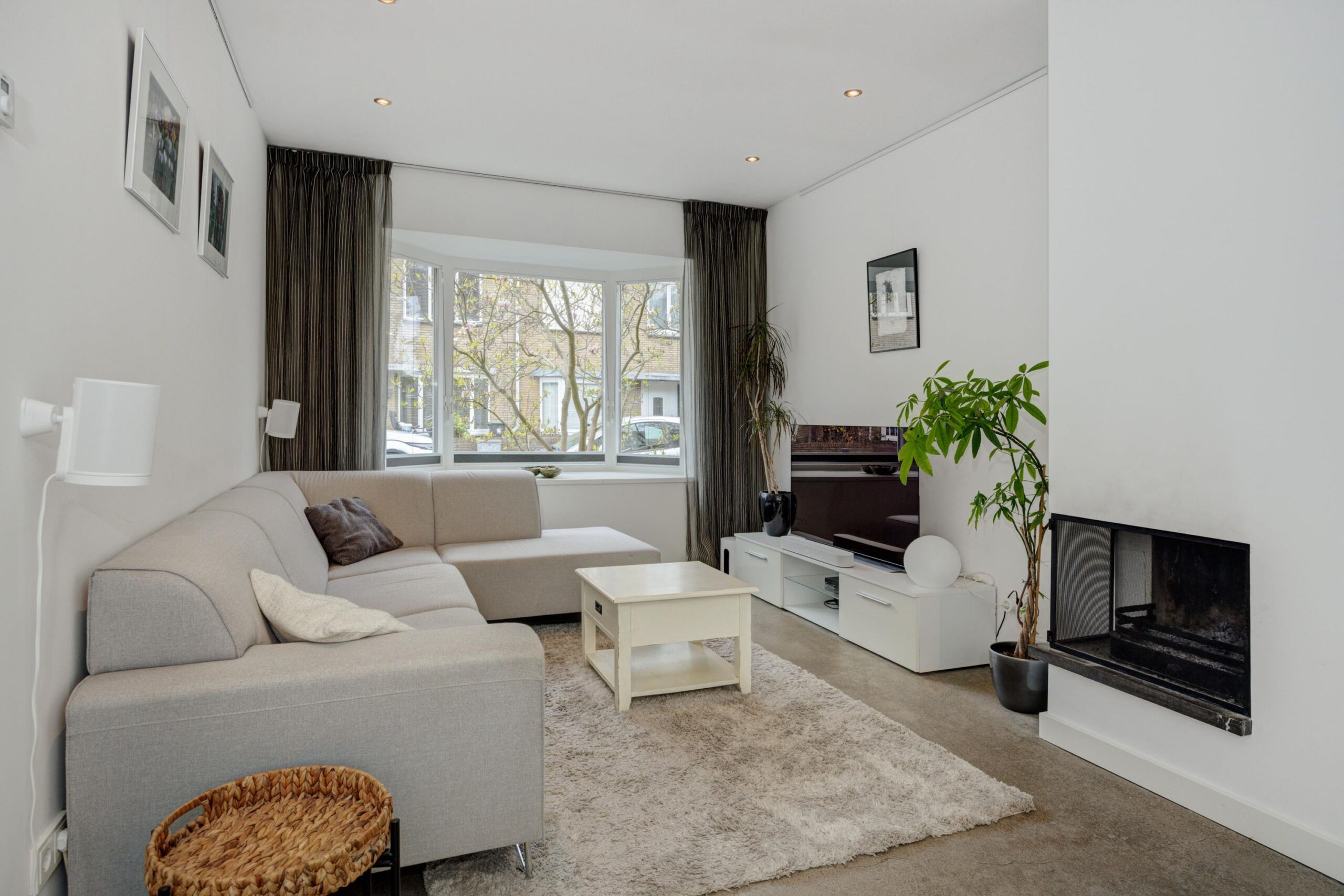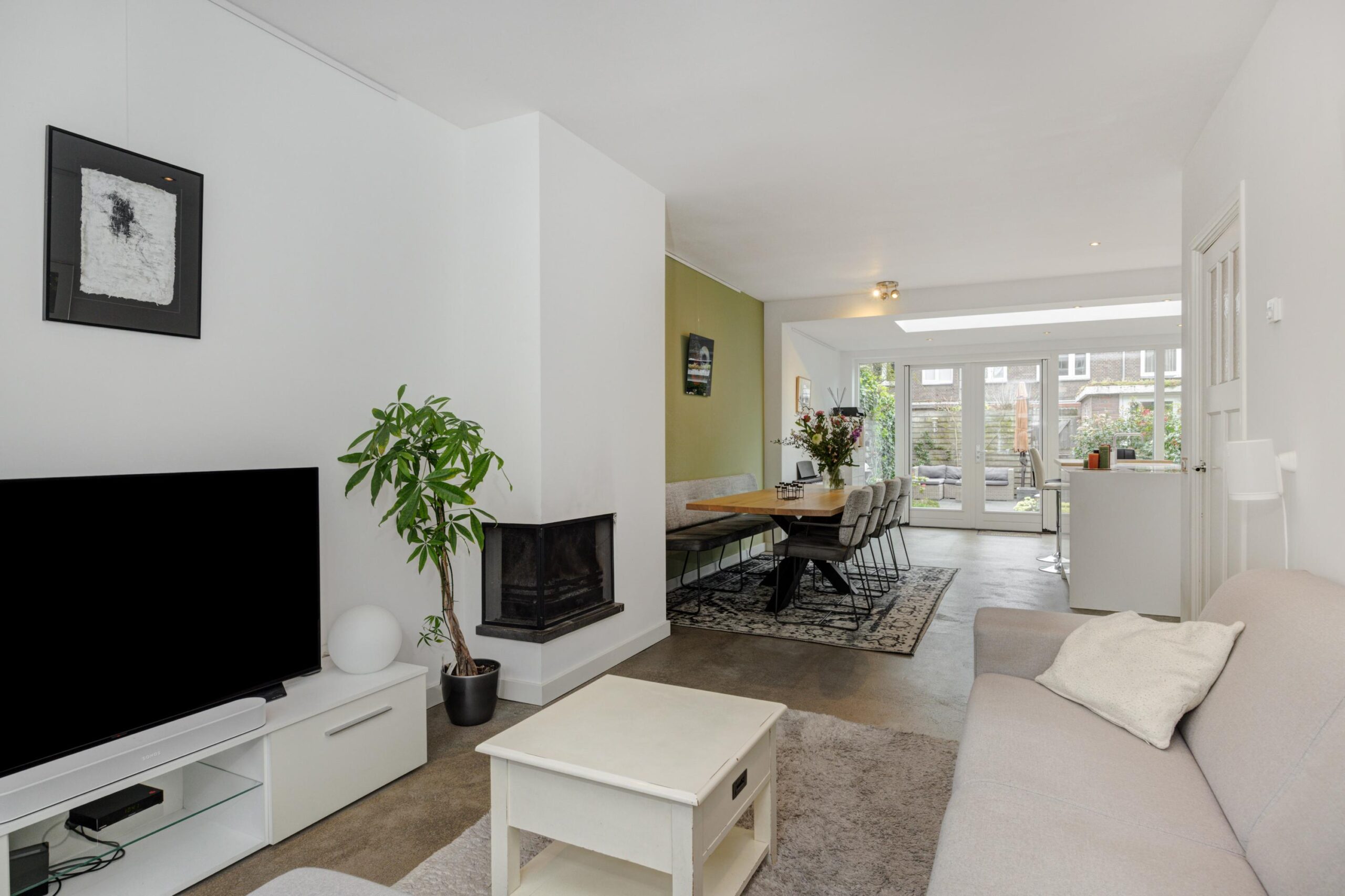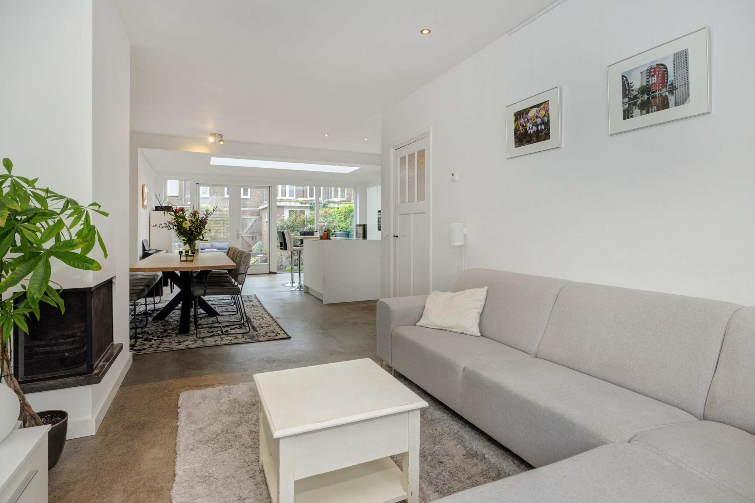 Bij binnenkomst in de living valt direct de enorme ruimte én de hoeveelheid lichtinval op. Een fijne en heerlijk lichte ruimte! Aan de voorzijde van de woning bevindt zich het zitgedeelte met erker en open haard.