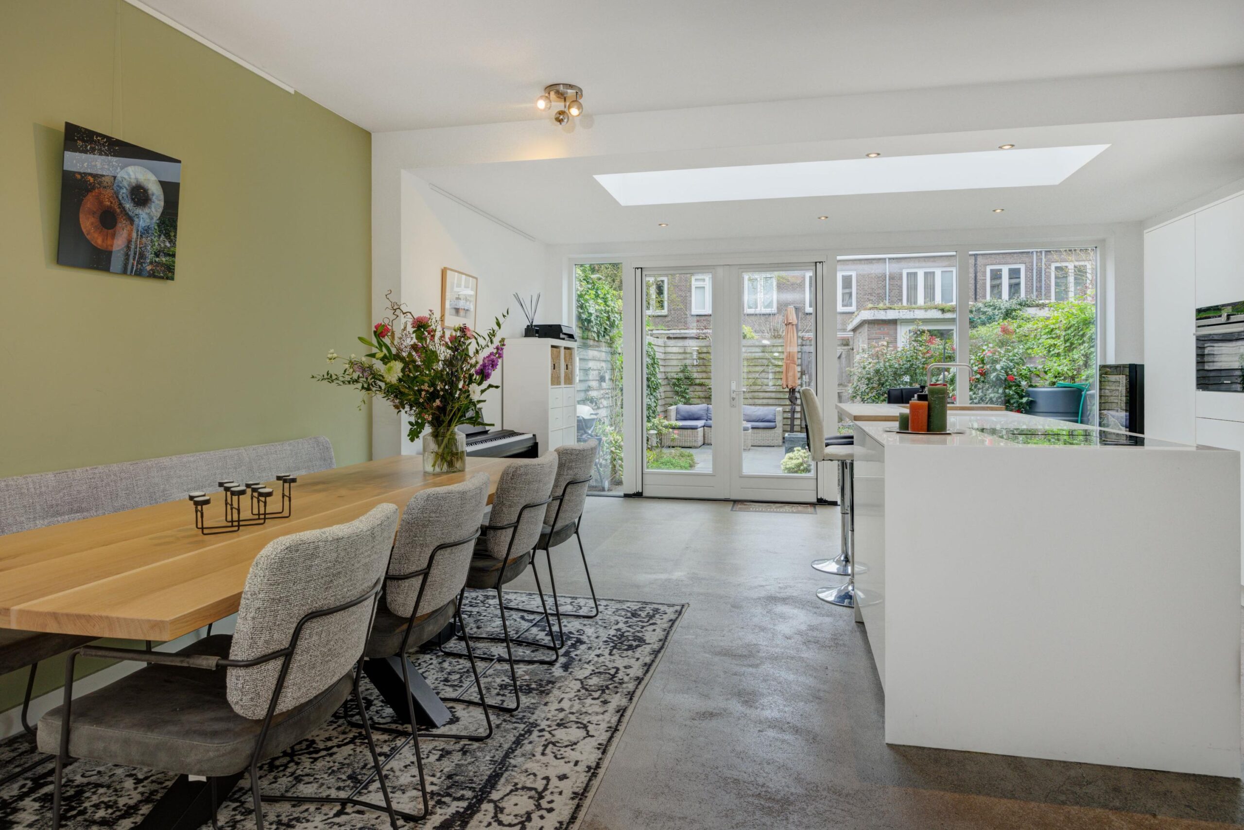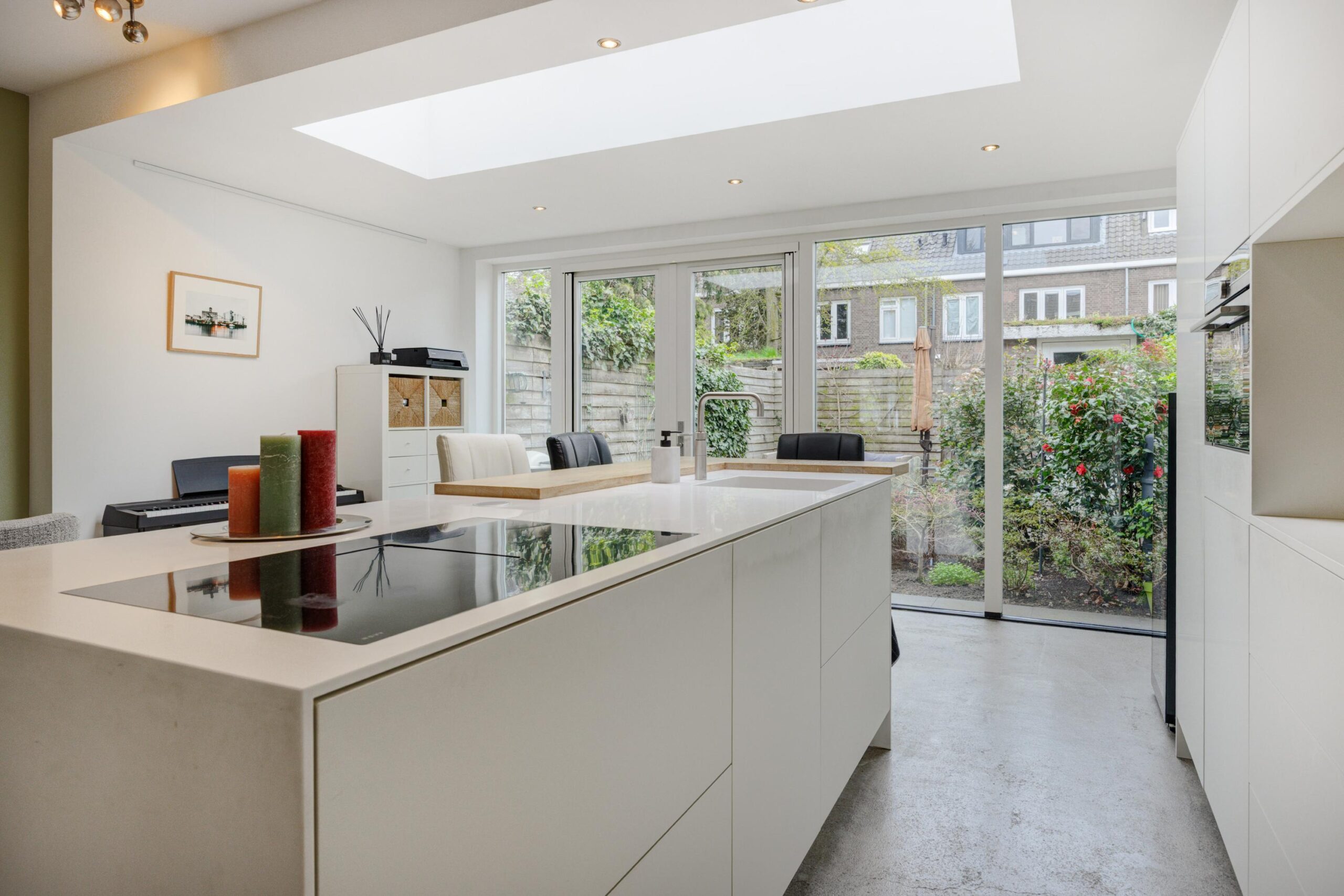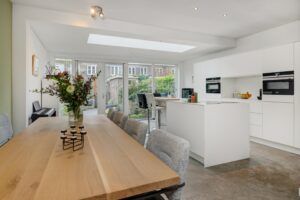 Vanuit het zitgedeelte lopen we door naar de woonkeuken welke deels in de uitbouw is geplaatst. De woonkeuken, met keramiek aanrechtblad, is geplaatst in 2 delen; een kookeiland met barretje en een wandblok, en is voorzien van de volgende inbouwapparatuur: spoelbak, Novi inductiekookplaat met afzuiging, vaatwasmachine, grote koelkast, vriezer, stoomoven (Siemens), combi-oven (Siemens), nis met koffiecorner en veel bergruimte in de kastjes en de lades. De tuingerichte keuken is heerlijk ruim en voorzien van een mooie lichtstraat en glaspui met openslaande deuren met toegang tot de achtertuin.