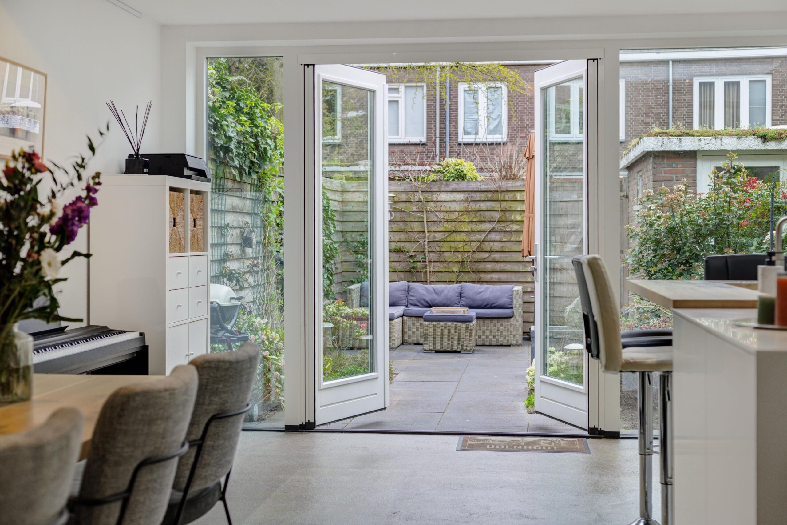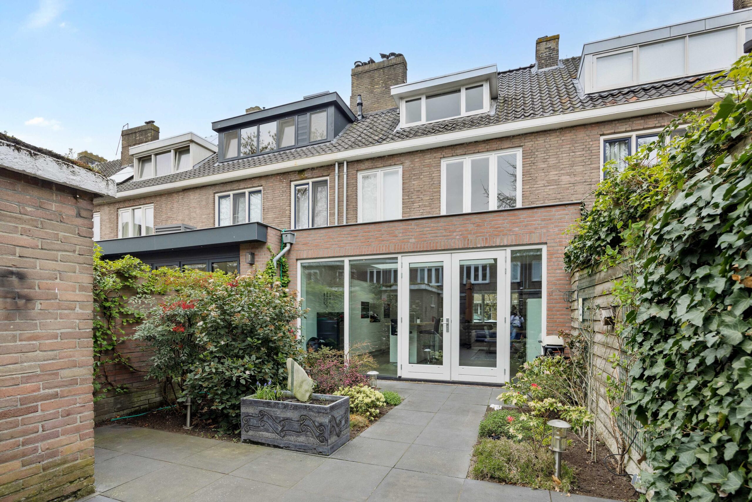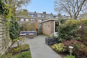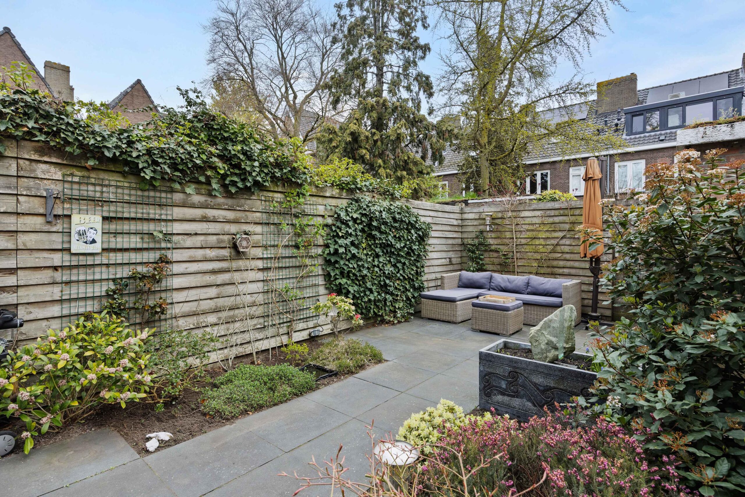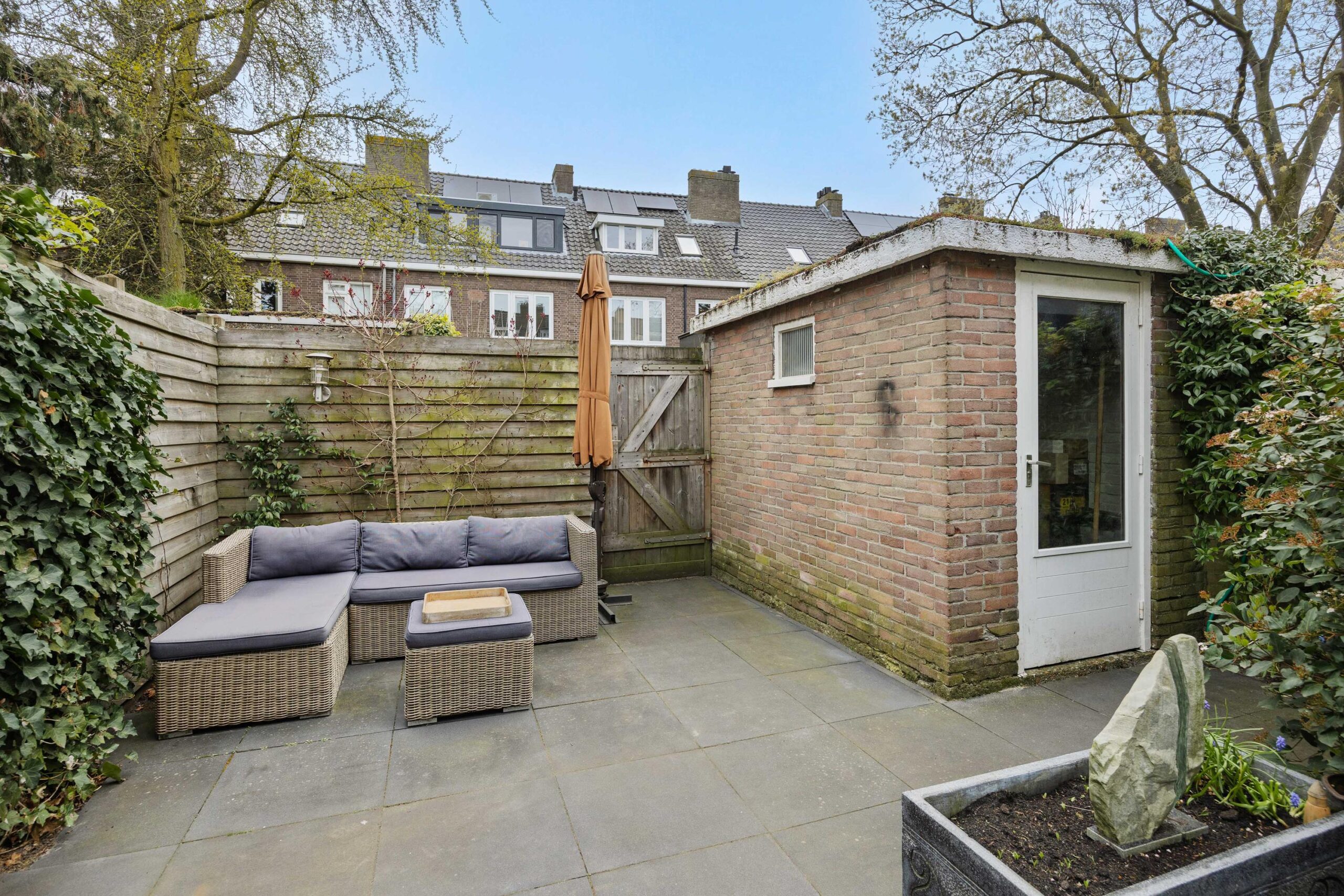 Vanuit de woonkeuken is de sfeervolle stadstuin met achterom bereikbaar. De achtertuin is gelegen op het oosten en voorzien van sierbestrating met terras achterin de tuin, groenborders, buitenkraan, elektra en tuinverlichting (van binnenuit te bedienen). Achterin de tuin bevindt zich een vrijstaande stenen berging met elektra en sedum dak. Ook het dak van de aanbouw is voorzien van sedum dakbedekking. Kortom, een fijne tuin waar je heerlijk kunt zitten!