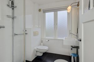 Tenslotte bereiken we de nette badkamer. De badkamer is volledig betegeld met een antraciet vloertegel en een witte wandtegel, en is voorzien van een douche, wastafel, wandcloset, kast en elektrische vloerverwarming met klokschakelaar.