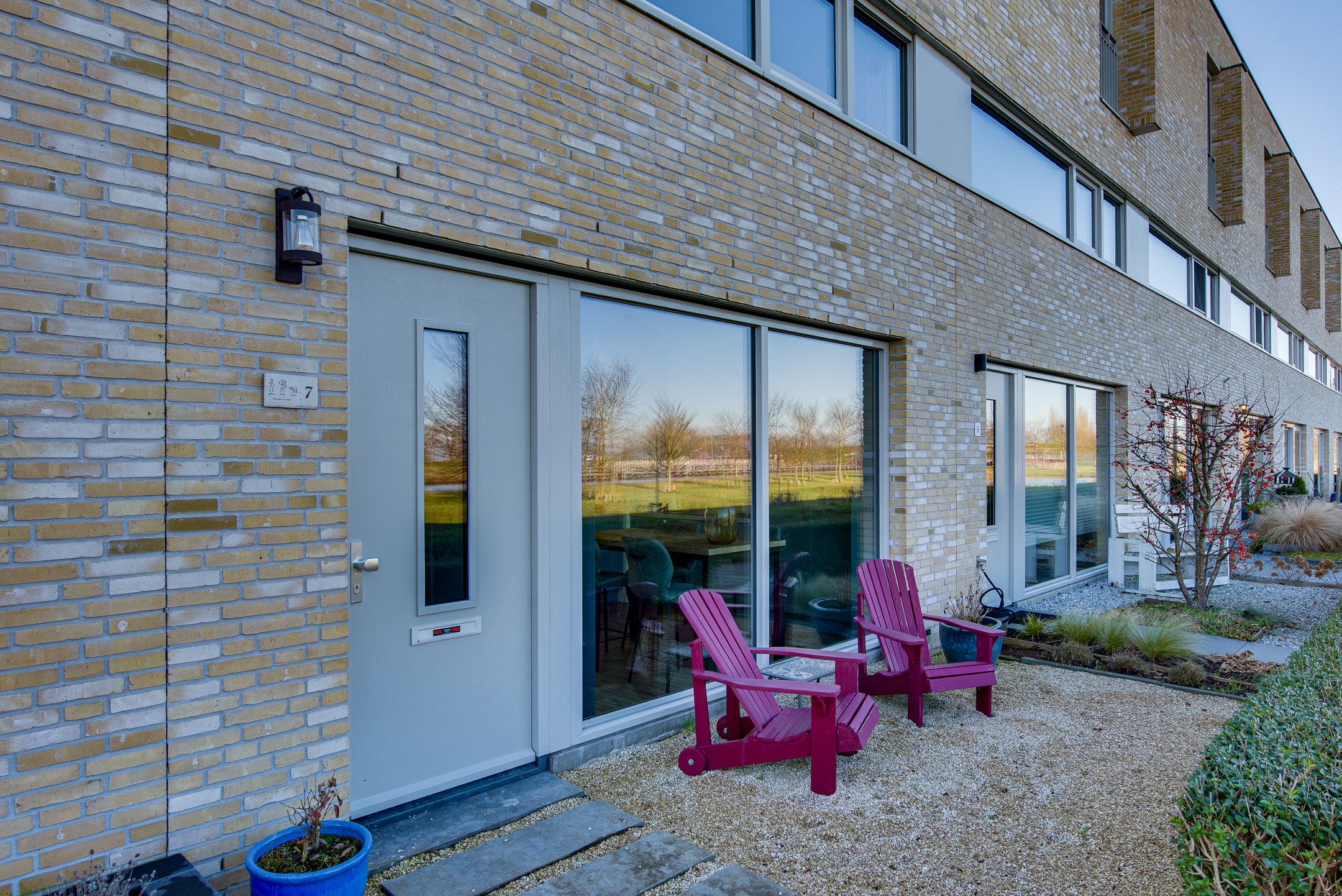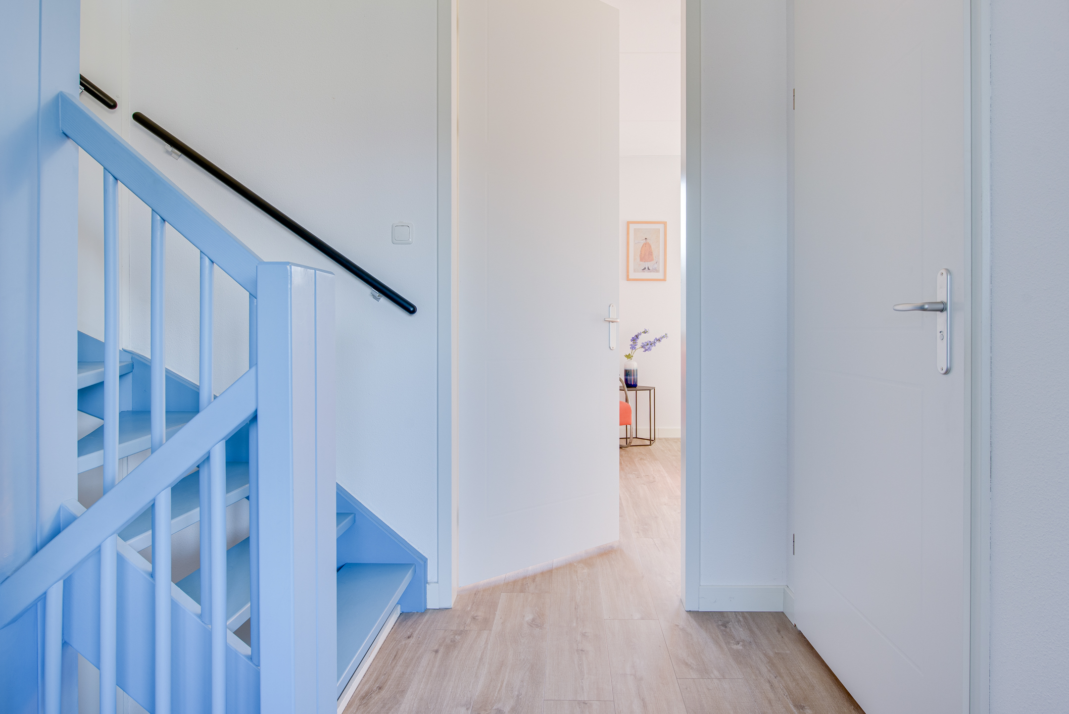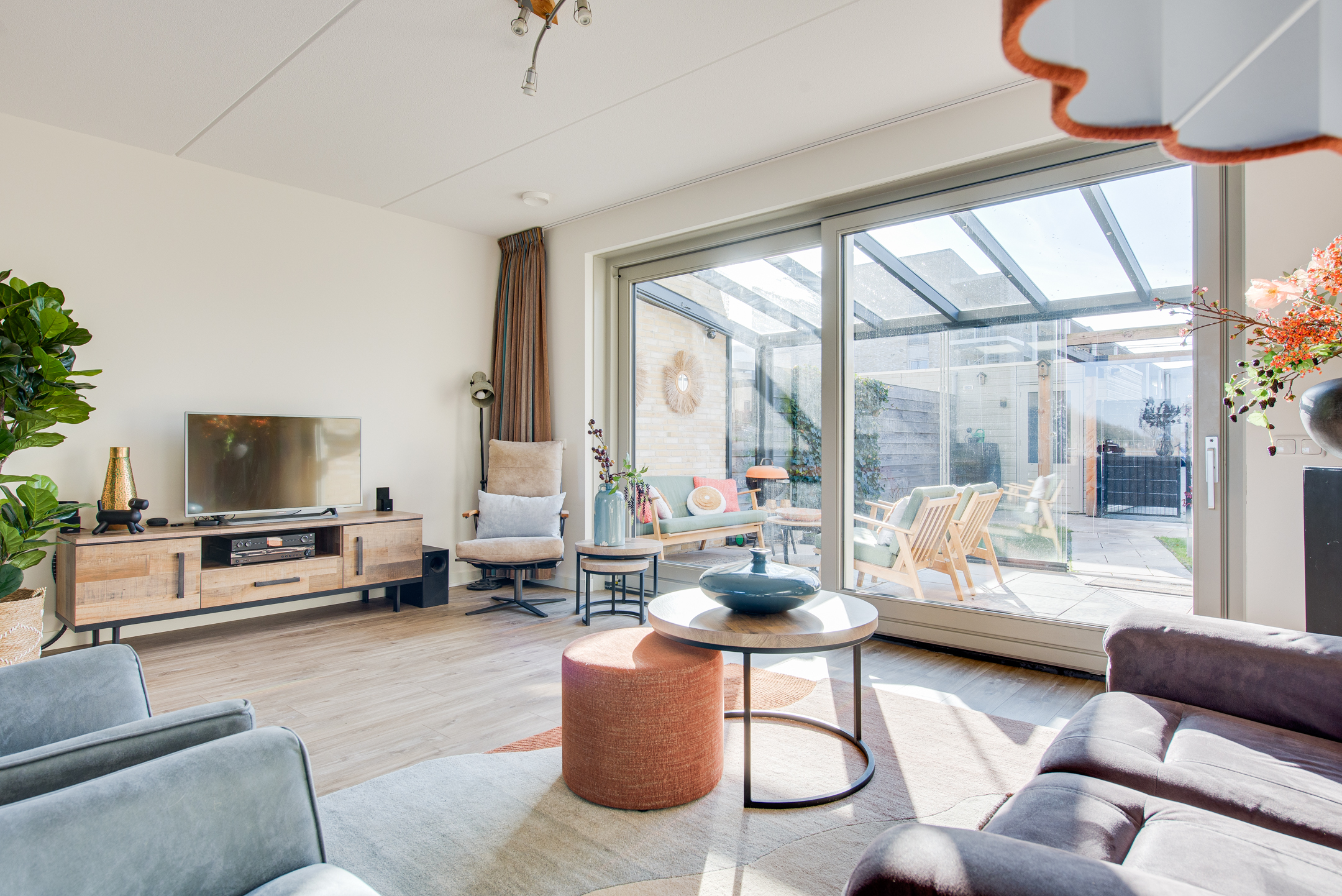 De tuingerichte zithoek ligt aan de achterzijde. Een grote glazen schuifpui over de volle breedte zorgt ervoor dat u de tuin optisch bij de woning kunt betrekken. Aan de achtergevel is een overkapping geplaatst, voorzien van een elektrische zonneluifel. In de woonkamer bevindt zich tevens een praktische provisiekast. De trap leidt u naar de eerste verdieping.