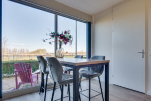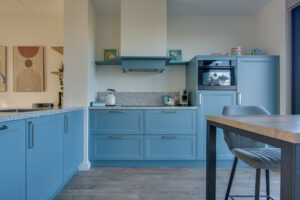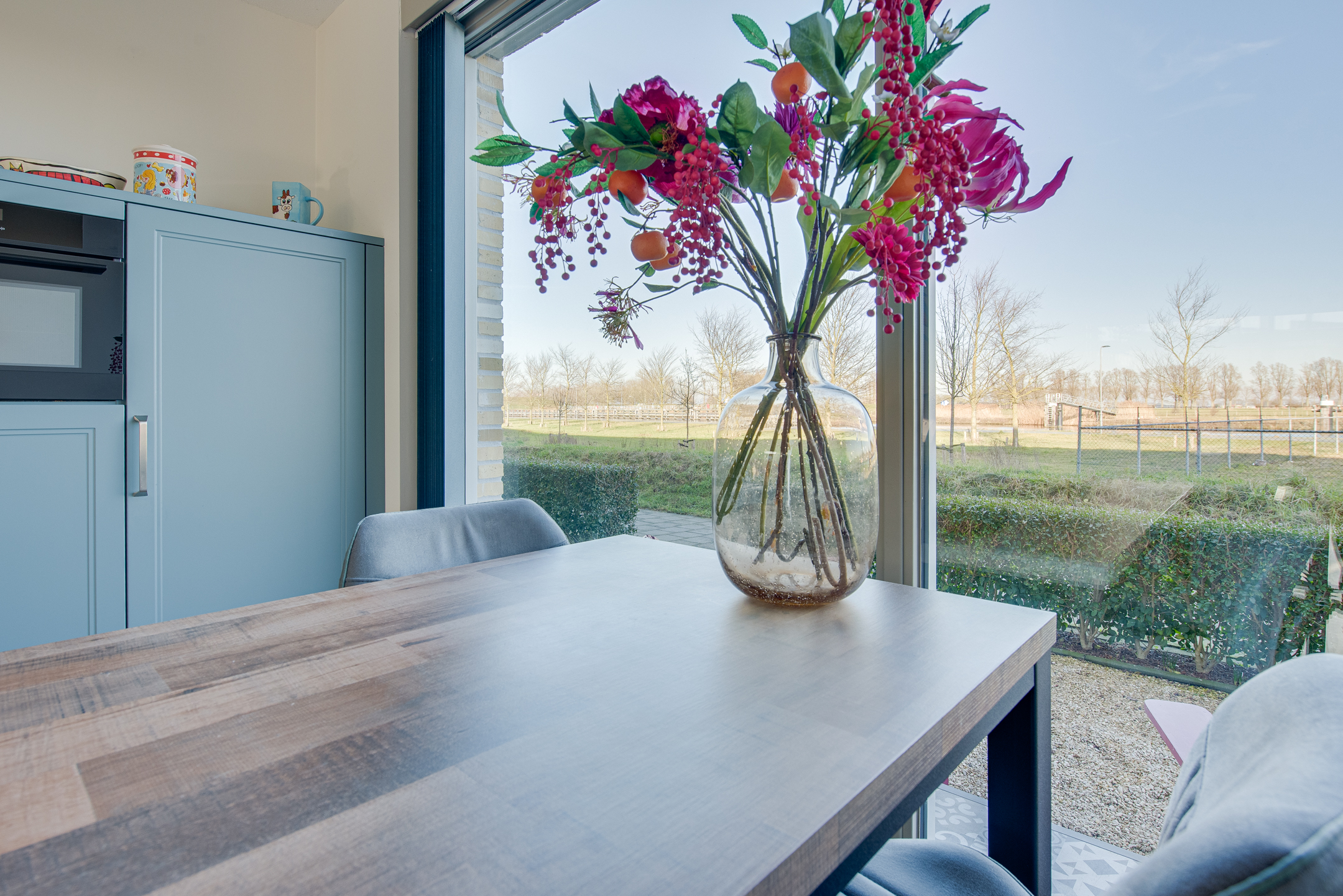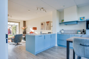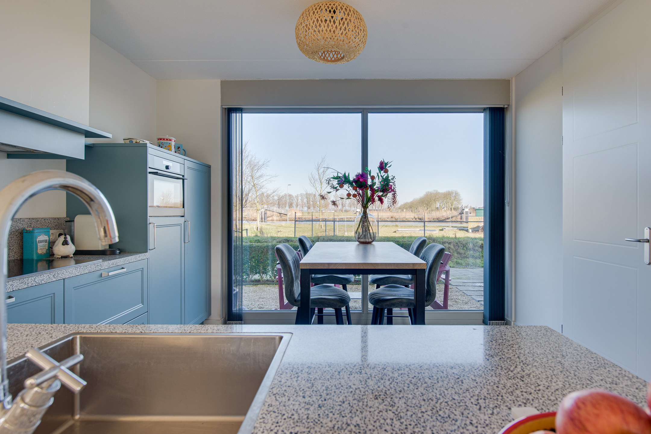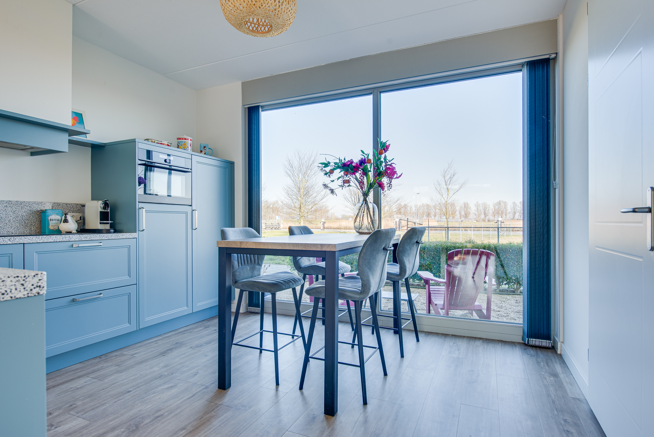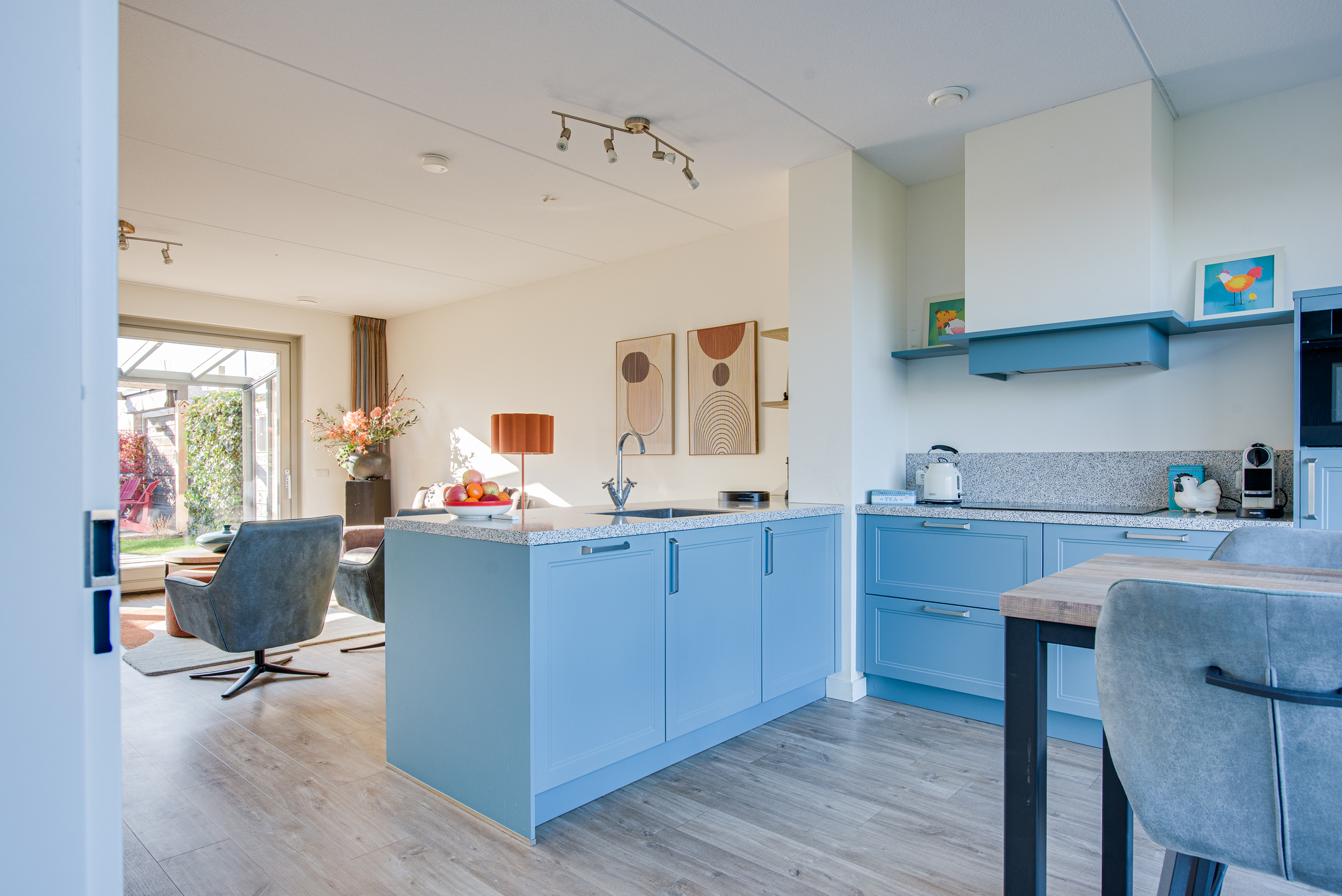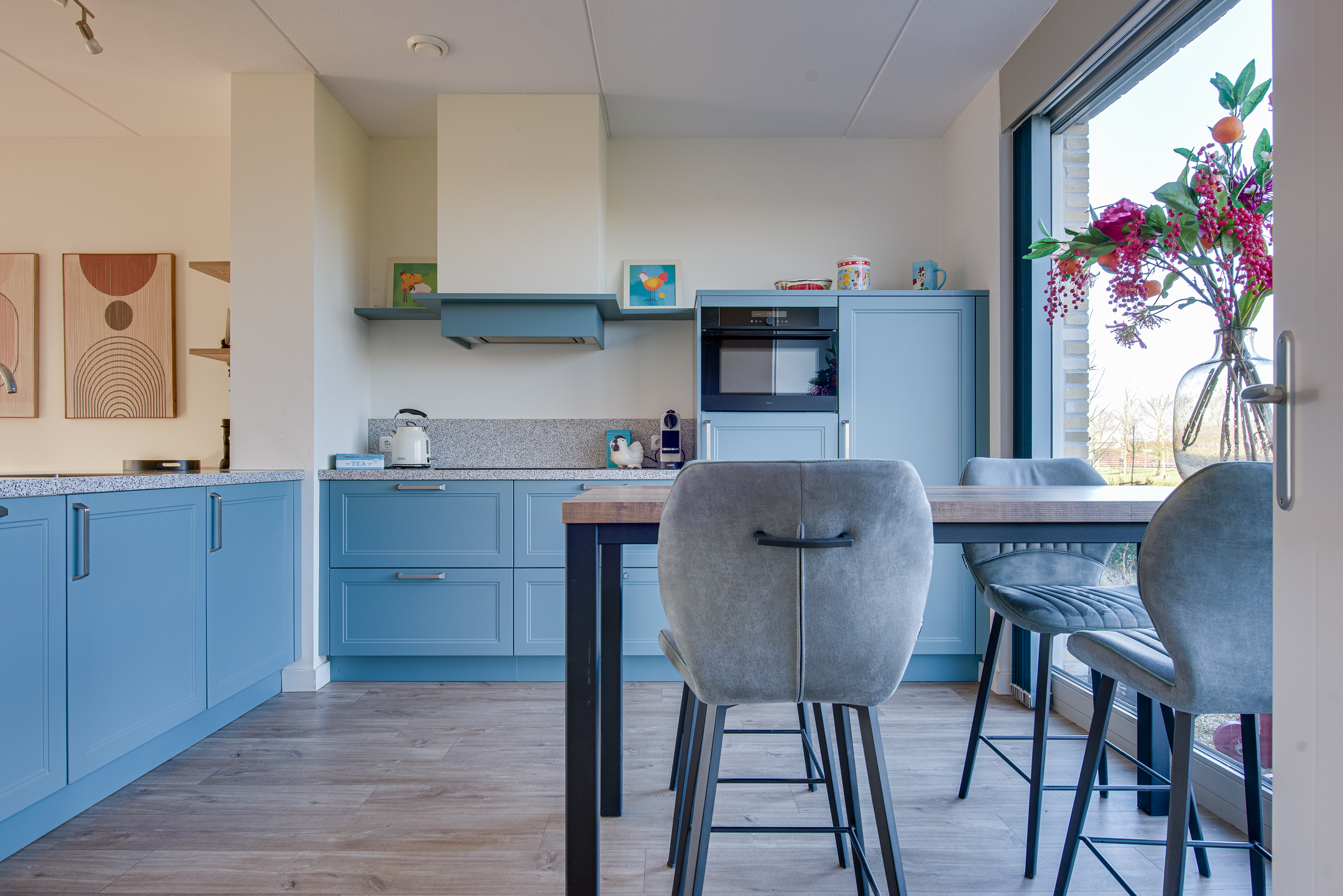 De kookliefhebber kan zijn hart ophalen in deze sfeervolle, grijsblauwe keuken in landelijke stijl. De keuken is hoogwaardig afgewerkt met een composiet werkblad en voorzien van moderne inbouwapparatuur, waaronder een inductiekookplaat met schouw, een grote koelkast met vriesvak, een combi-oven en een vaatwasser. Aan één zijde nodigt het bargedeelte uit om gezellig aan te schuiven. Dankzij de raampartijen tot aan de grond valt er aangenaam veel daglicht binnen; een heerlijke plek om te tafelen en te genieten van het vrije uitzicht.
