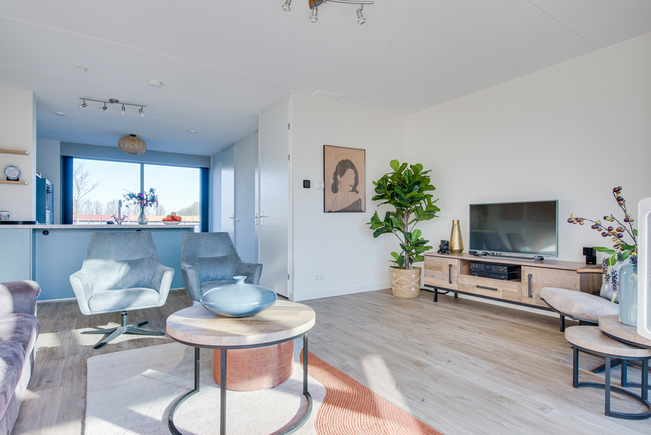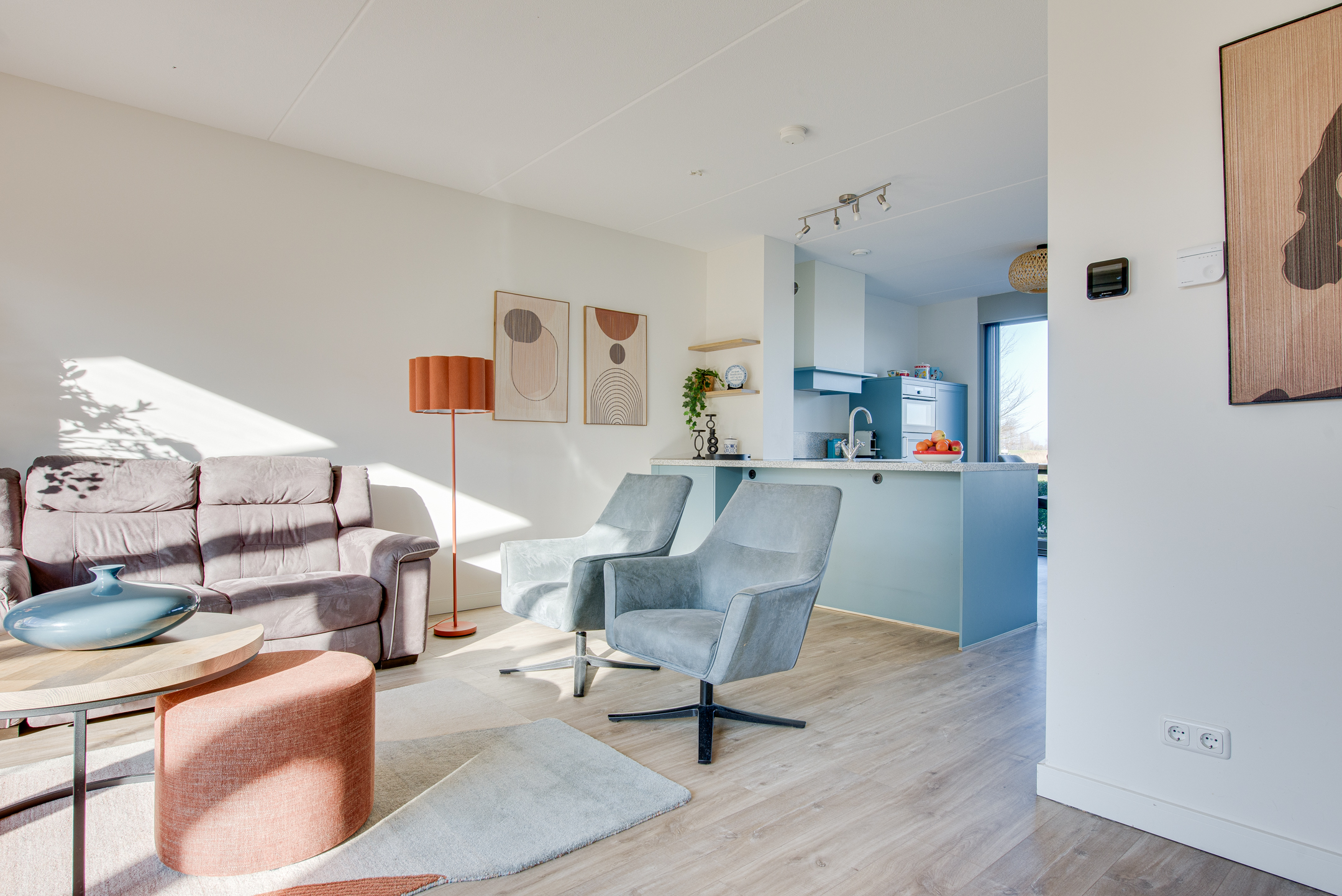 De living is fraai ingedeeld met de keuken aan de voorzijde en een tuingerichte zithoek aan de achterzijde.