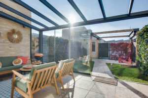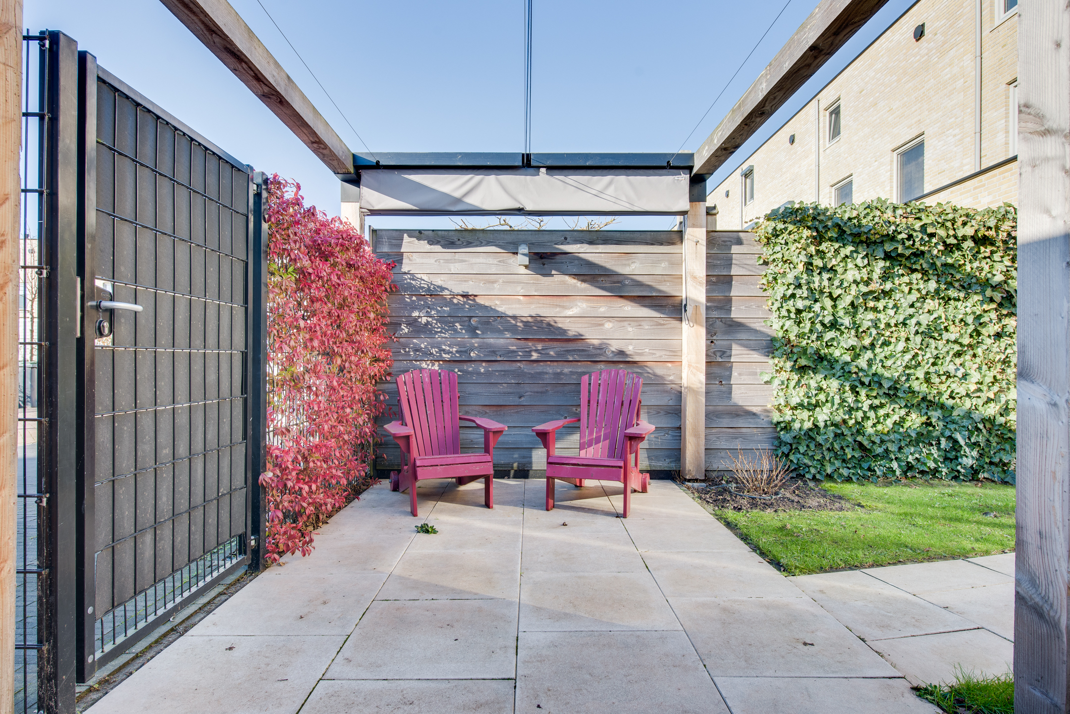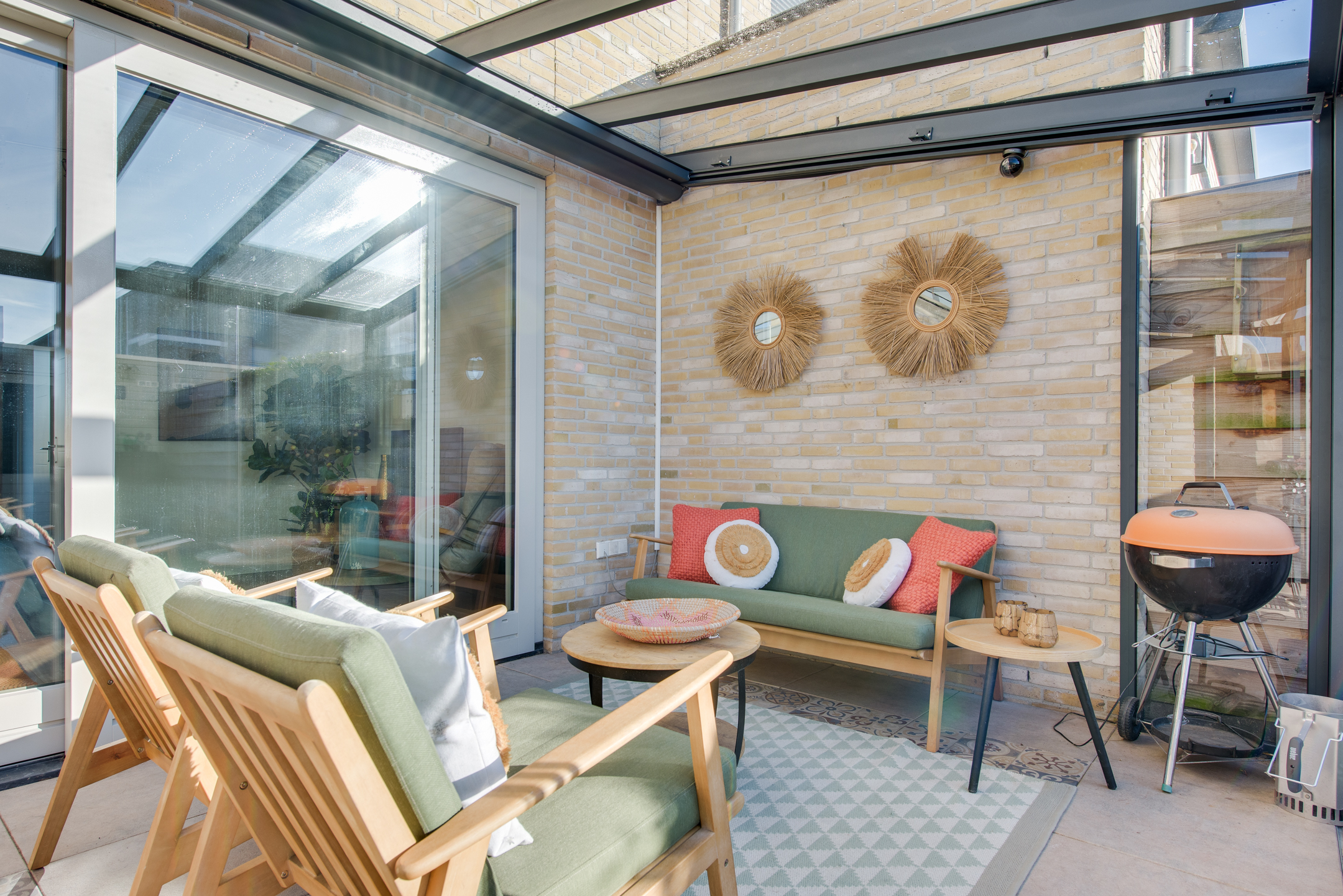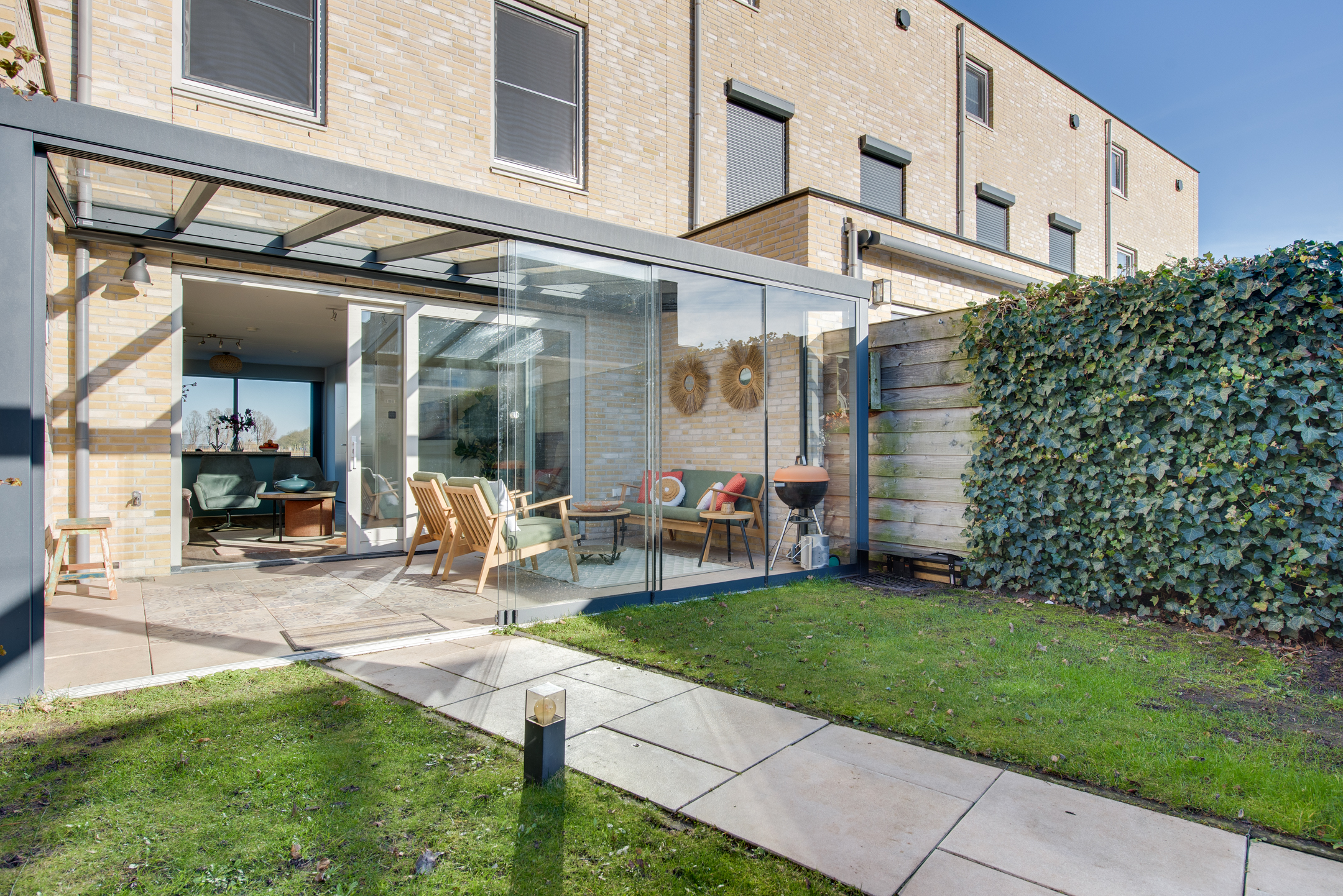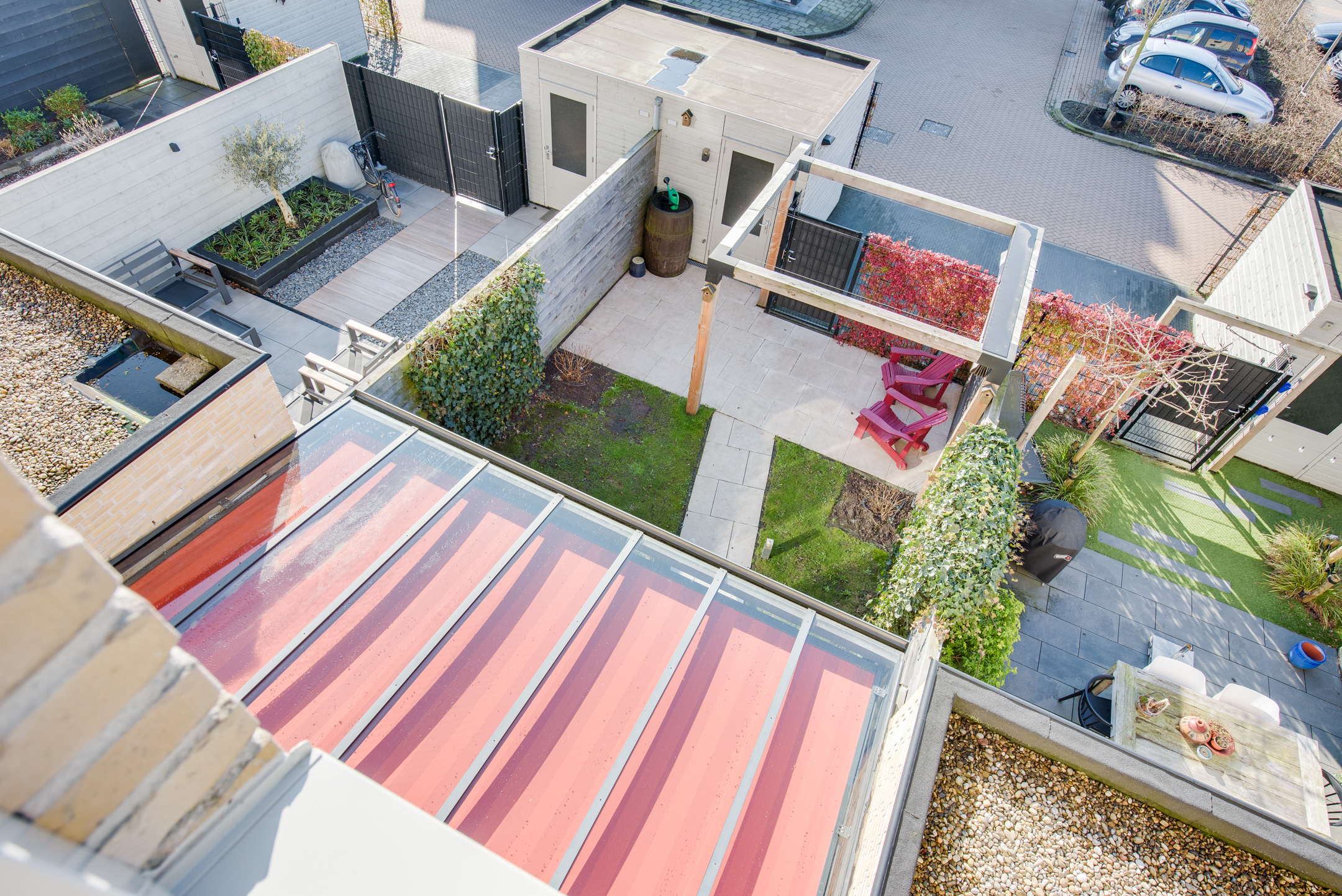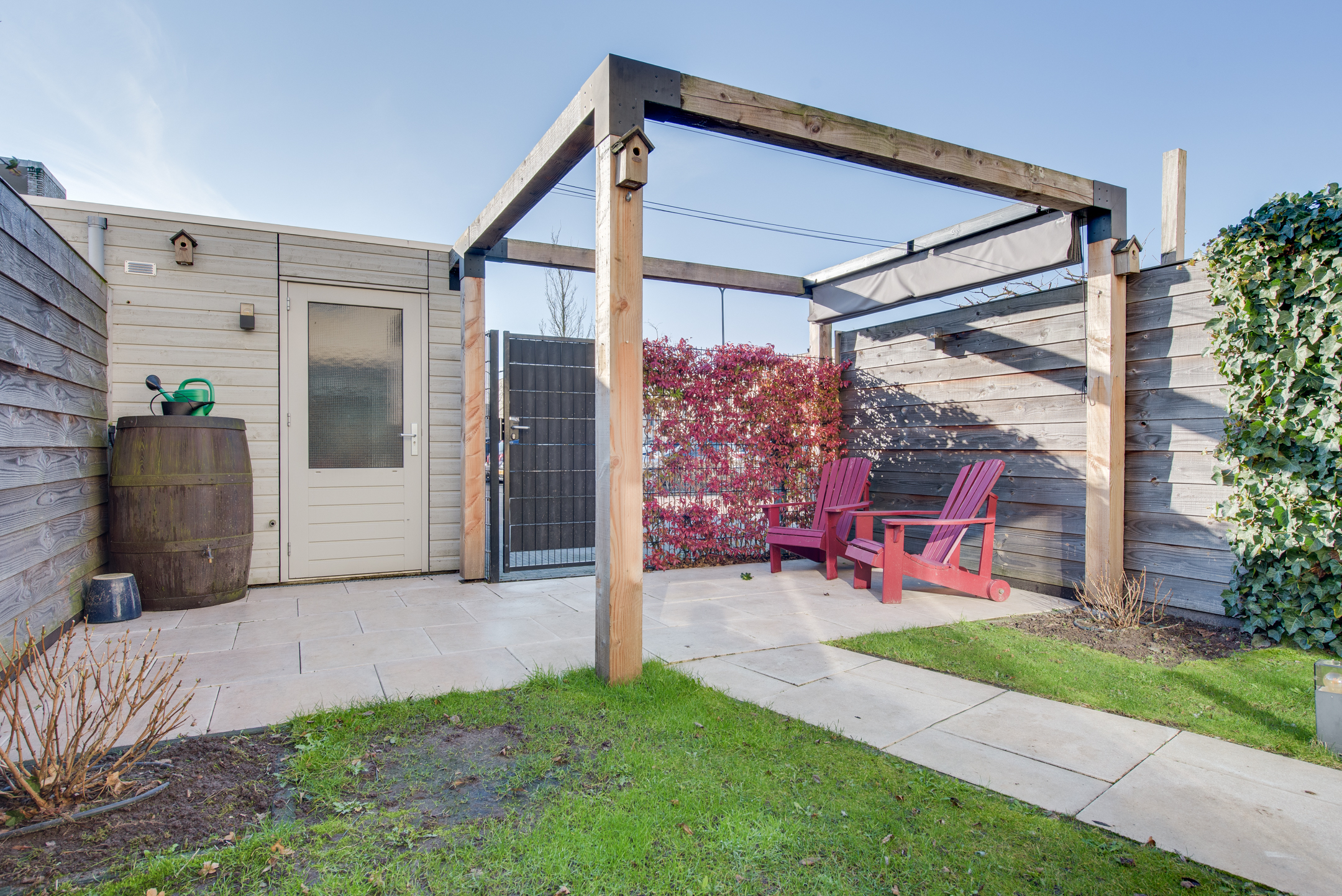 De sfeervolle achtertuin op het zuidwesten is prachtig aangelegd met een terras, gazon en een pergola met schaduwdoek. De tuin is keurig omsloten door een houten erfafscheiding en beschikt over een afsluitbare poort. De overkapping aan de woning is een absoluut pluspunt: voorzien van sfeervolle Portugese tegels, een glazen schuifwand en een elektrische screen. Dit is echt een verlenging van de woonkamer waar u al vroeg in het voorjaar van kunt genieten.