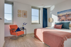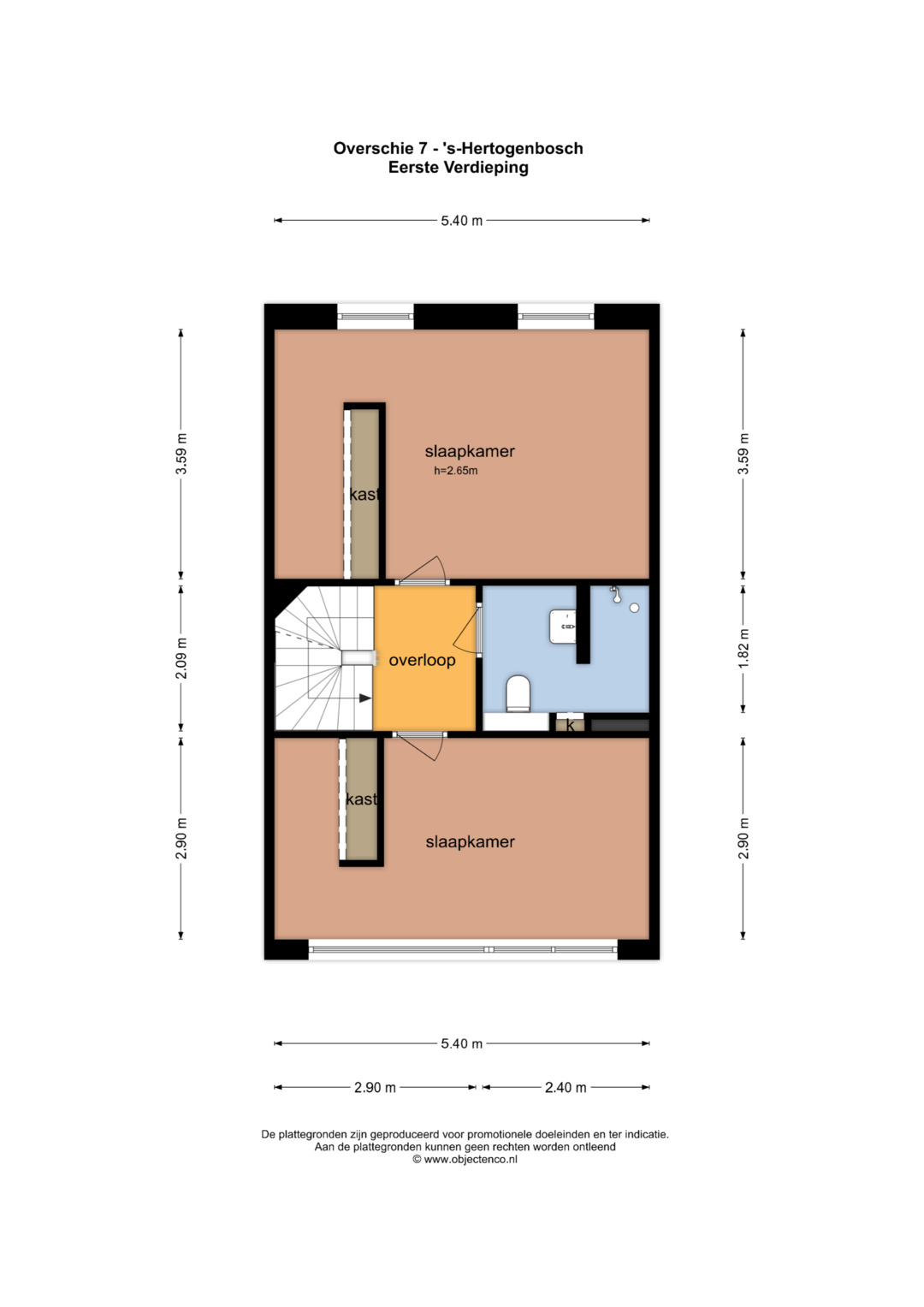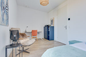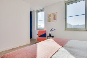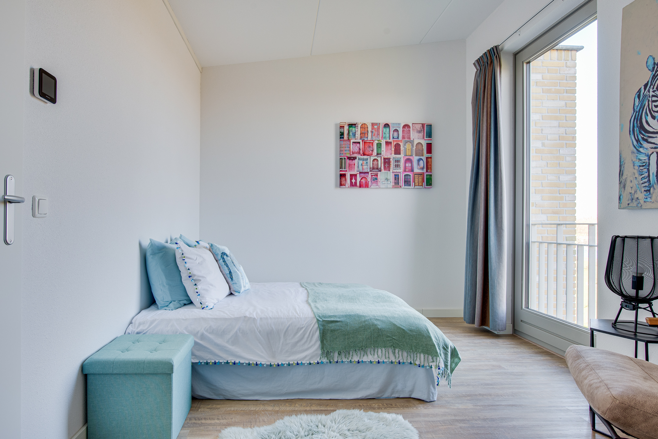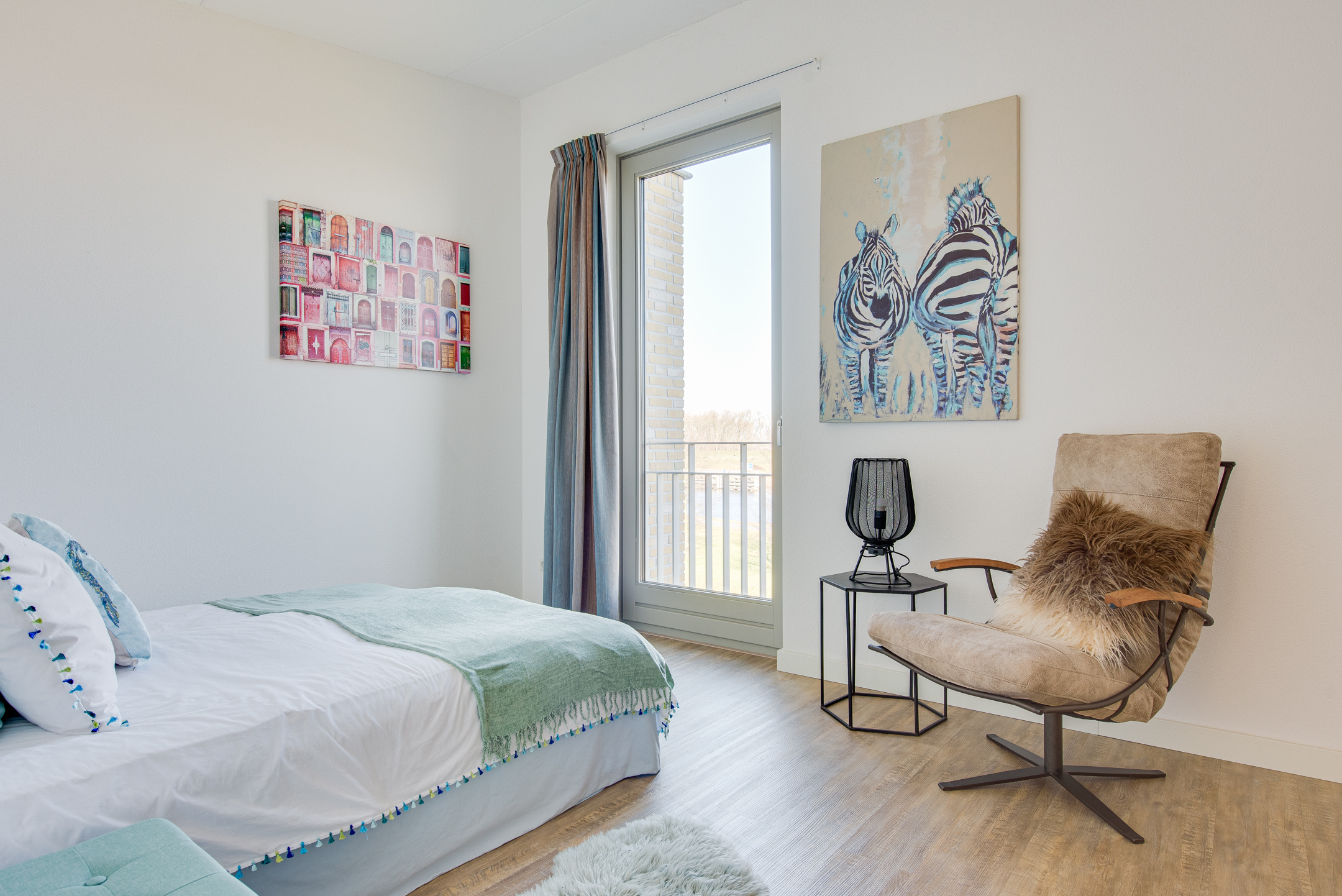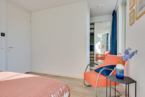Op de eerste verdieping bevinden zich twee royale slaapkamers, beide met een praktische inloopkast, en de badkamer. De afwerking (PVC-vloer, strak stucwerk en vloerverwarming/-koeling) is van dezelfde, consistente kwaliteit als op de begane grond. Ook hier zijn alle ramen voorzien van horren.