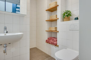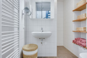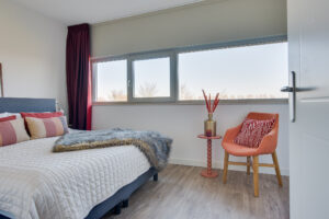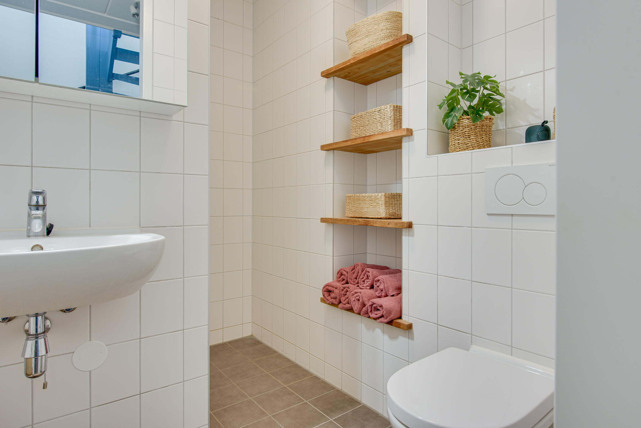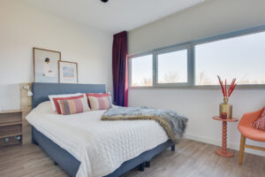 De slaapkamer aan de voorzijde is bijzonder dankzij het grote, horizontale panoramavenster, waardoor u hier optimaal geniet van het prachtige uitzicht op het buitengebied. De badkamer is volledig betegeld en ingericht met een inloopdouche, wastafel met spiegelkast, zwevend wandcloset, een nisje met houten planken en een handdoekradiator.