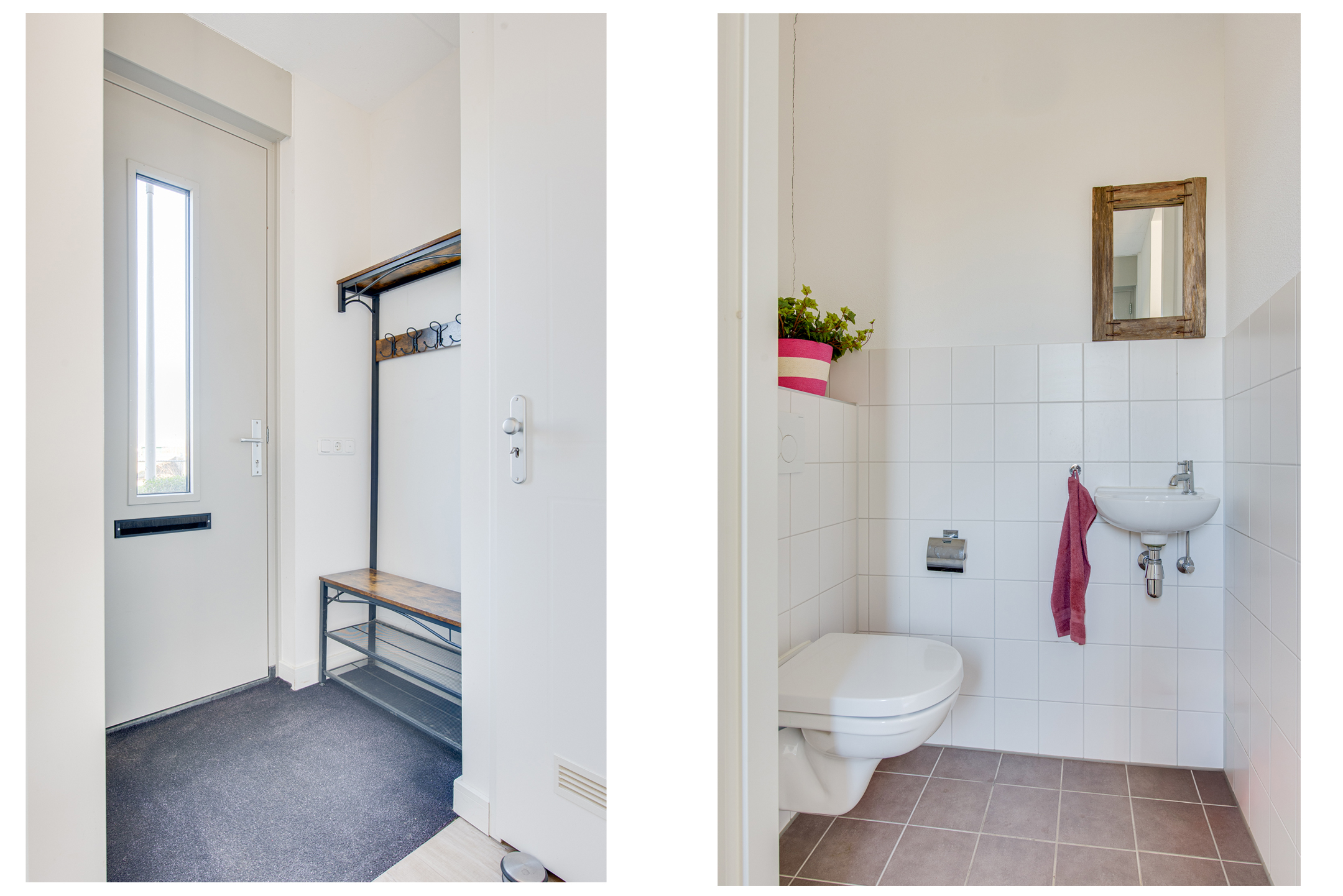 De hal biedt toegang tot de garderobe, meterkast, toiletruimte (met wandcloset en fonteintje) en de living.