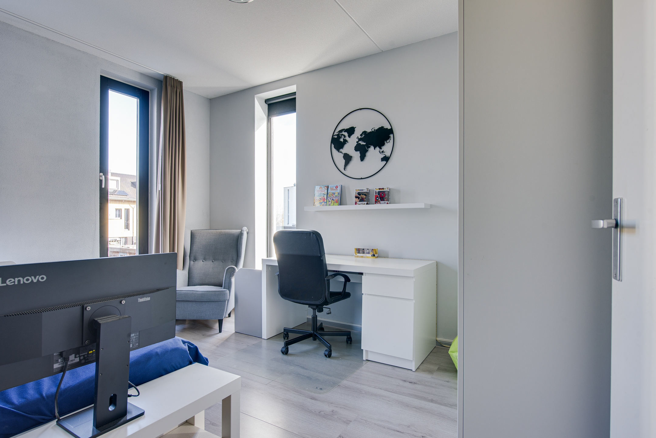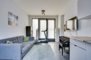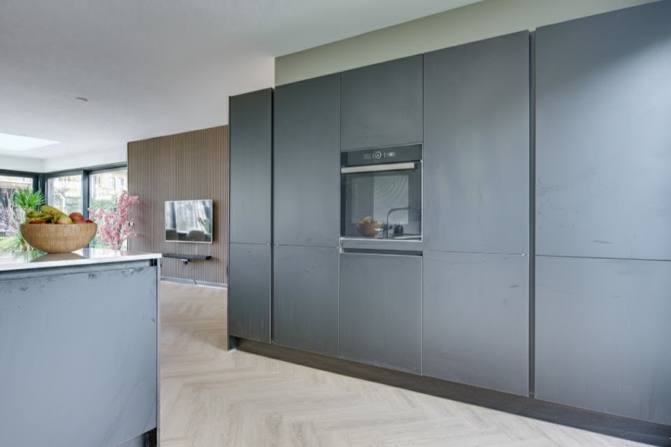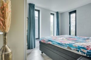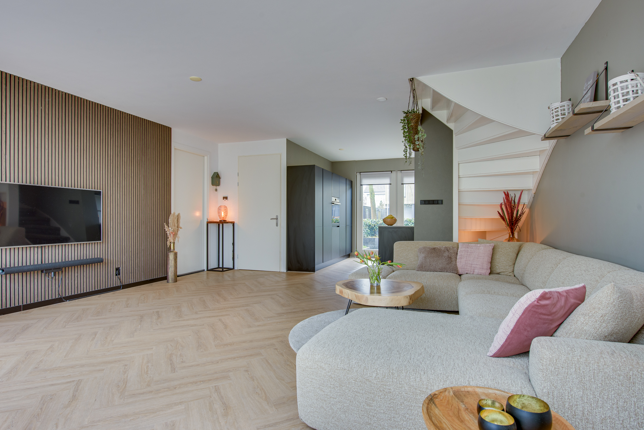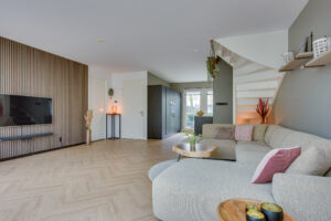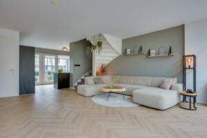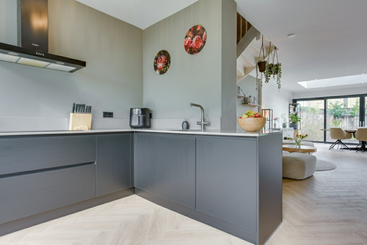 De ruimte is sfeervol afgewerkt met een lichte PVC visgraatvloer met vloerverwarming – stijlvol én praktisch. De moderne open keuken is in 2021 geplaatst en is eveneens voorzien van vloerverwarming. De keuken beschikt o.a. over een heet waterkraan, inductiekookplaat met afzuigkap, oven, koelkast, vriezer en vaatwasser.