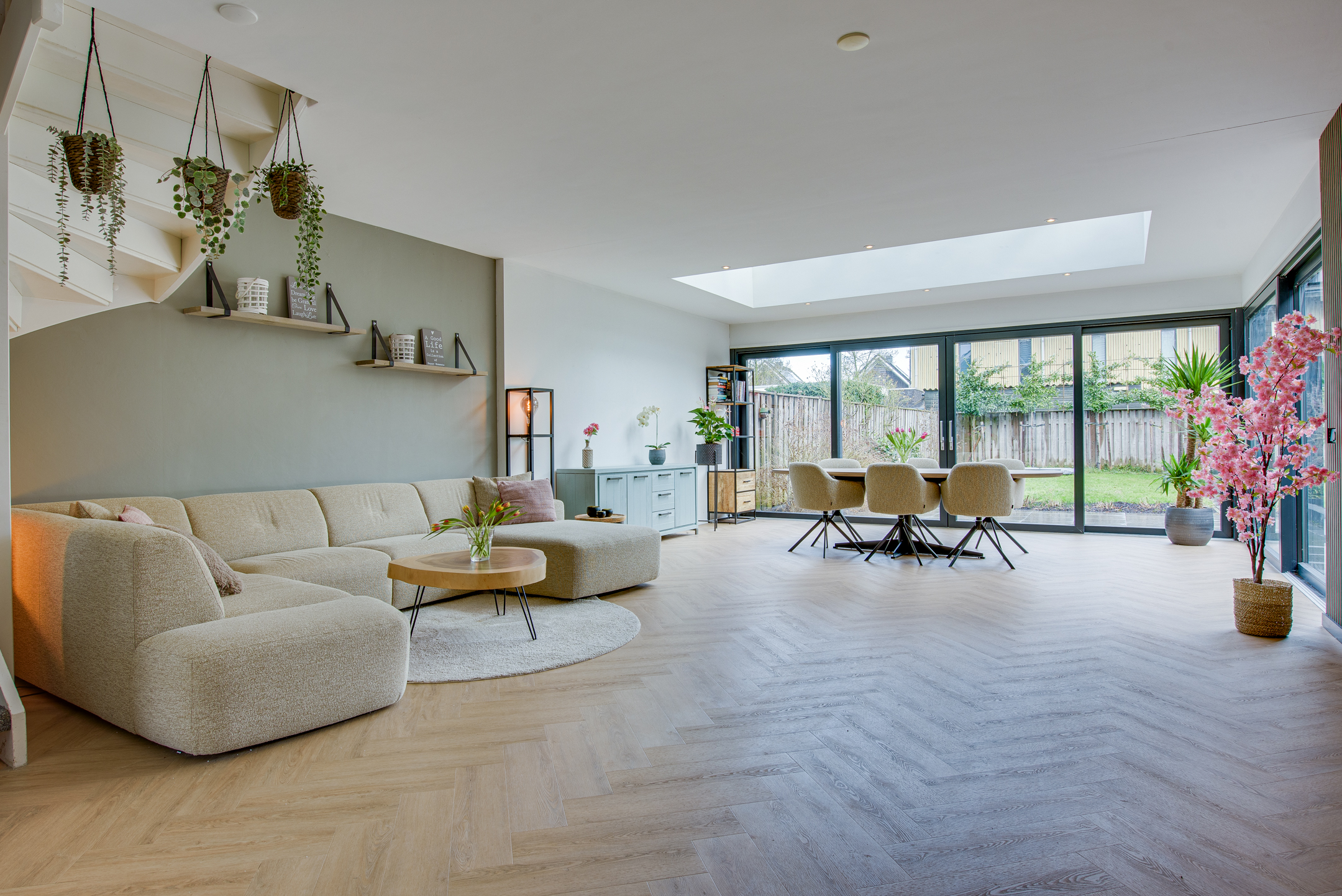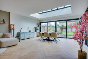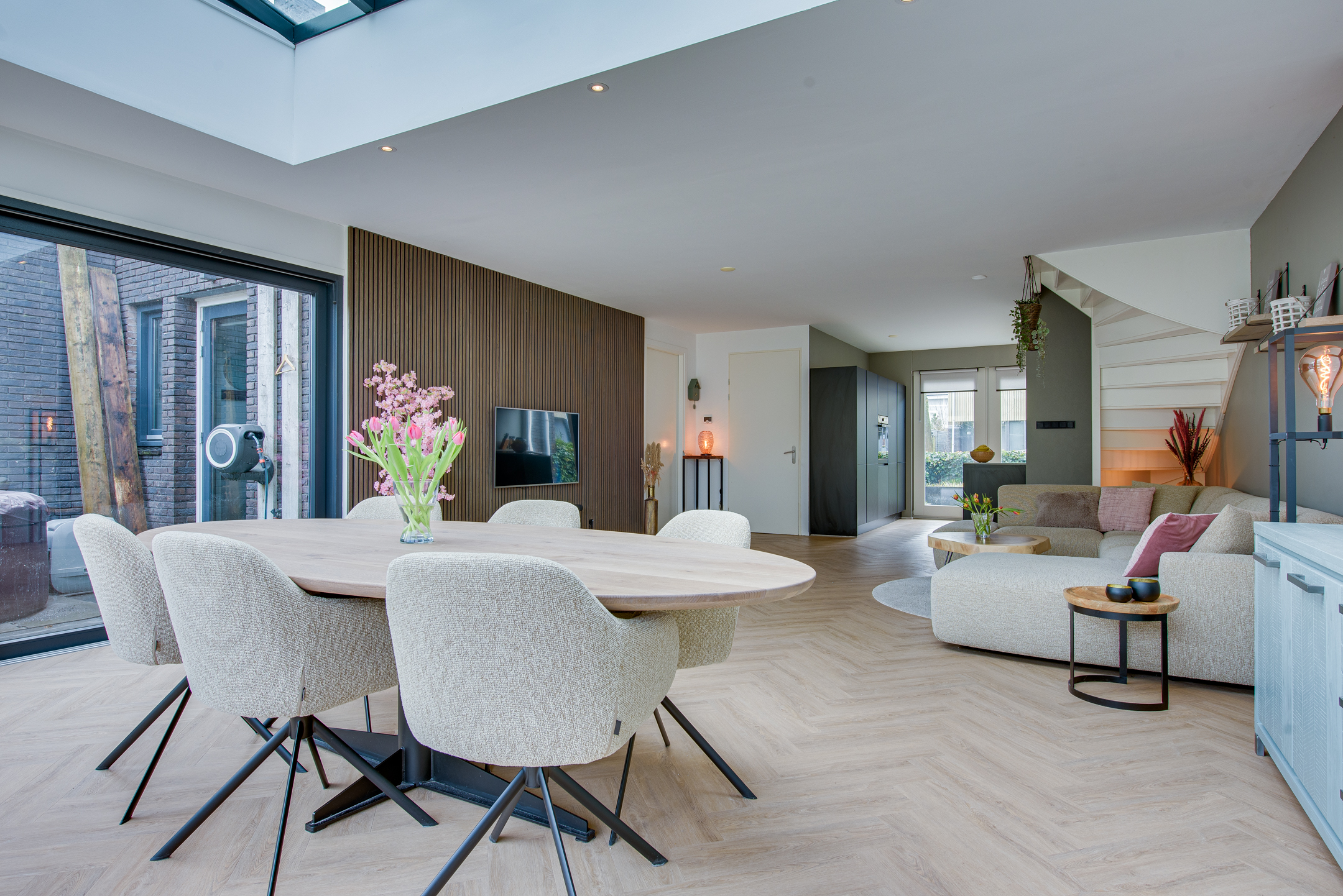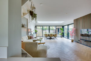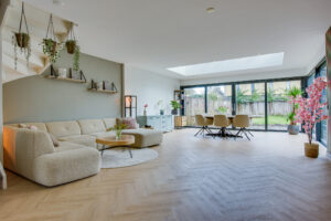 De woonkamer beschikt over een riante uitbouw met lichtstraat wat zorgt voor een indrukwekkende leefruimte met veel natuurlijk daglicht. Grote schuifpuien aan zowel de achter- als zijkant zorgen voor een optimale verbinding met de verzorgde achtertuin.