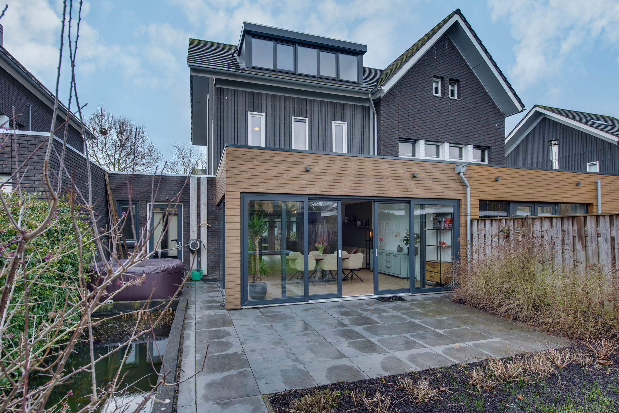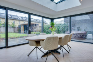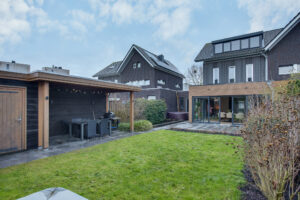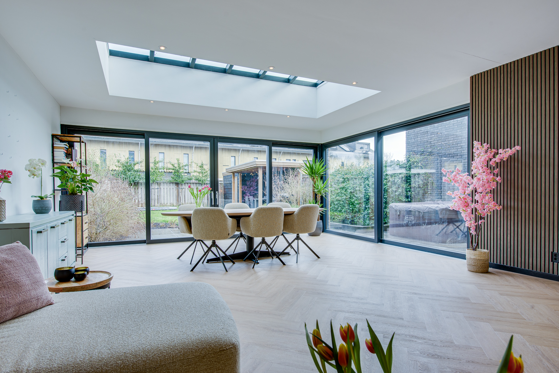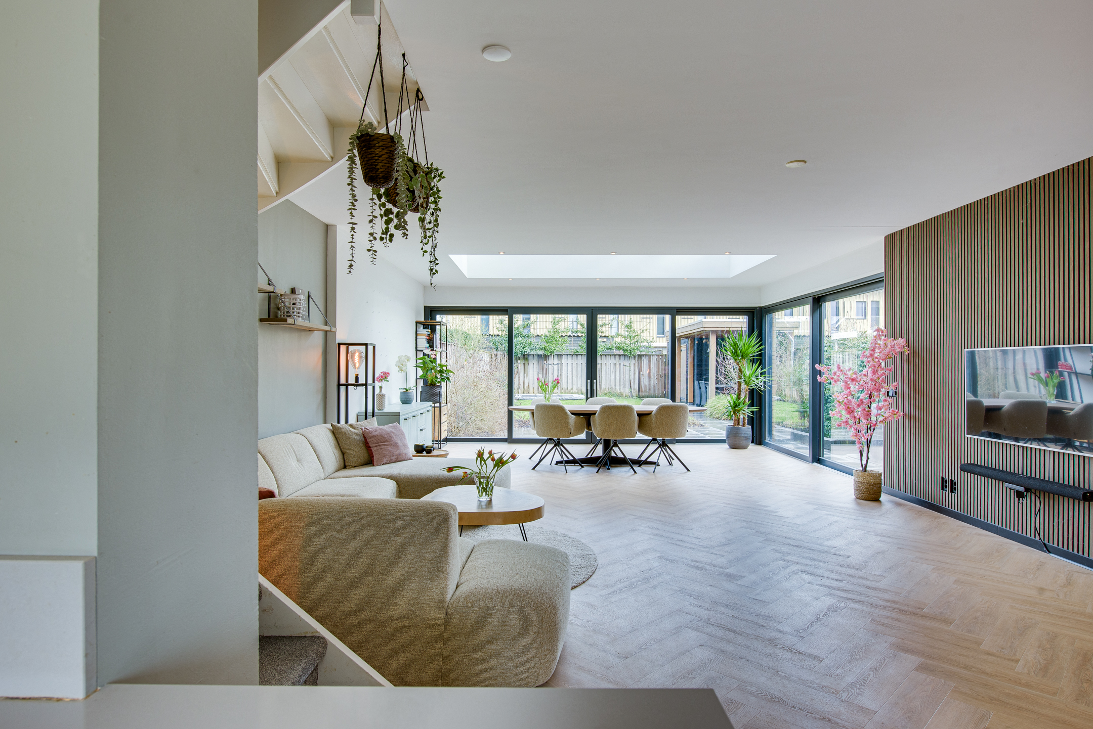 De woonkamer beschikt over een riante uitbouw met lichtstraat wat zorgt voor een indrukwekkende leefruimte met veel natuurlijk daglicht. Grote schuifpuien aan zowel de achter- als zijkant zorgen voor een optimale verbinding met de verzorgde achtertuin.