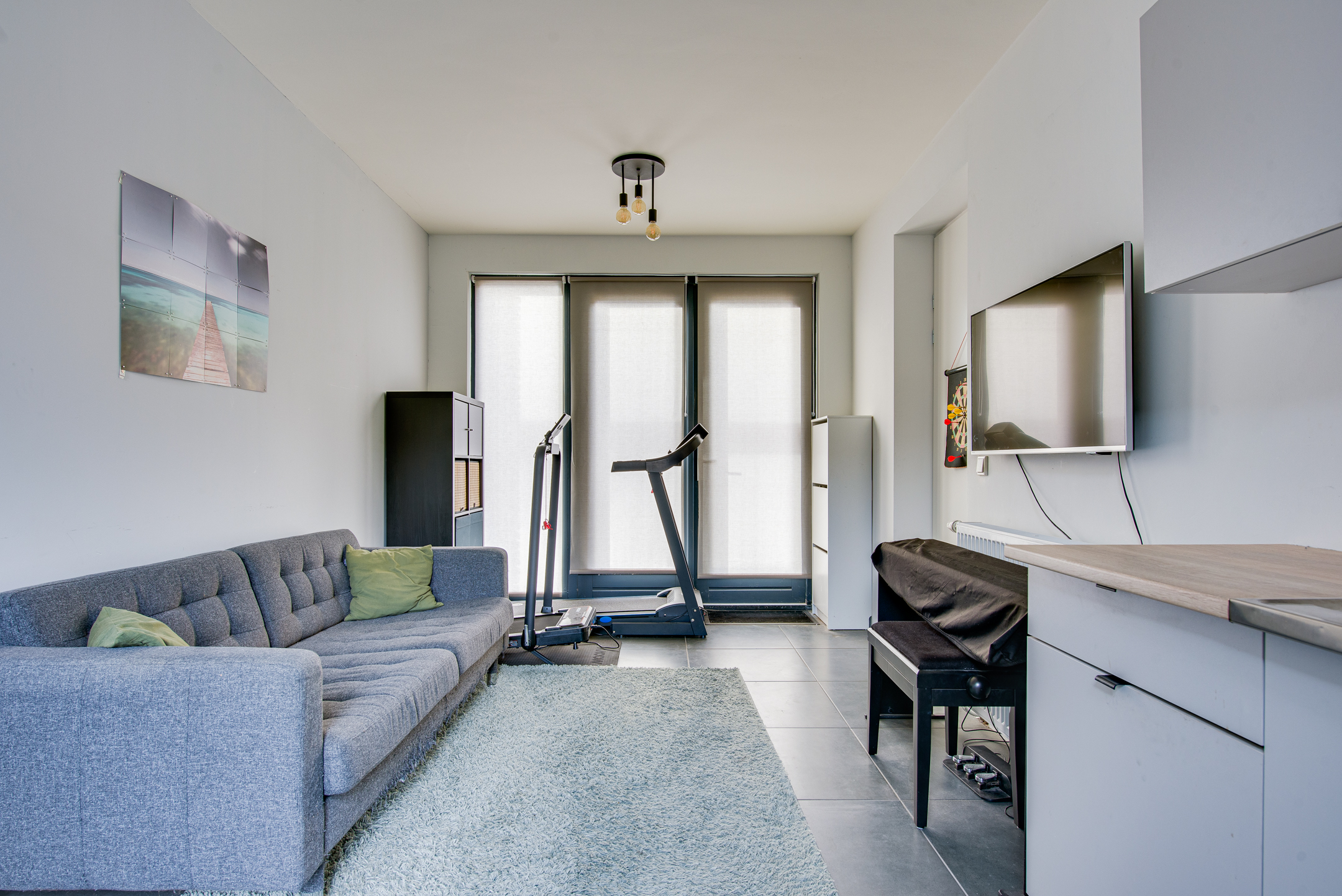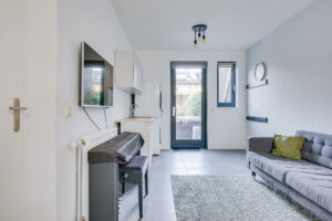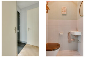 De hal beschikt over de meterkast en toiletruimte met fontein. Wanneer we doorlopen komen we in de woonkamer met stijlvolle keuken.