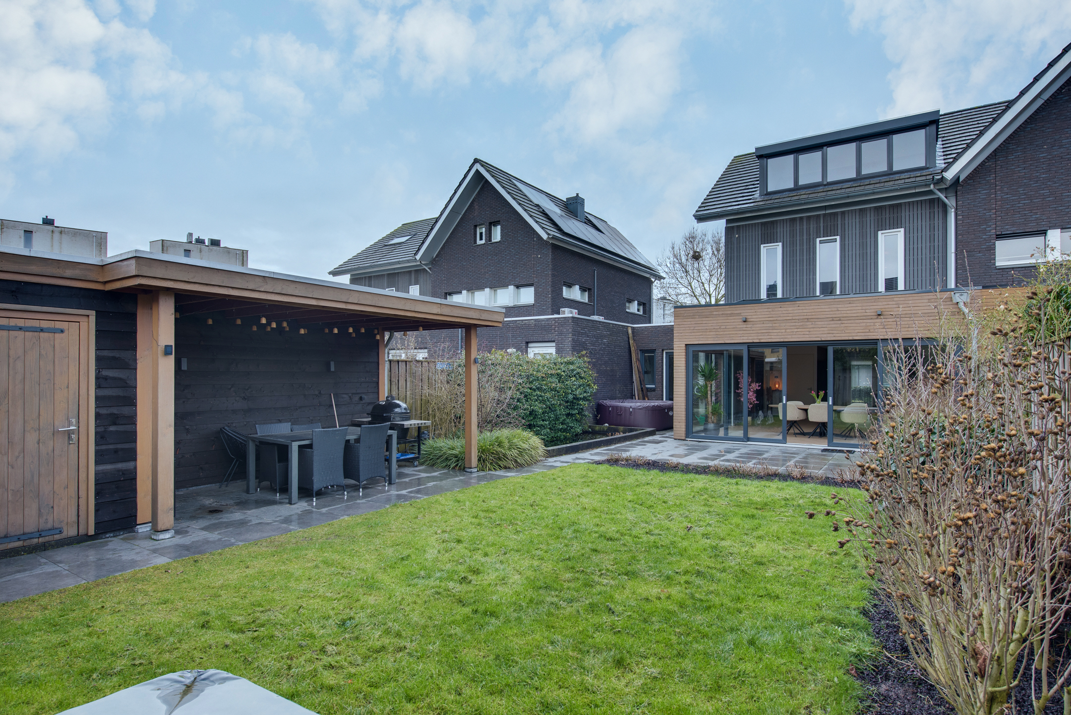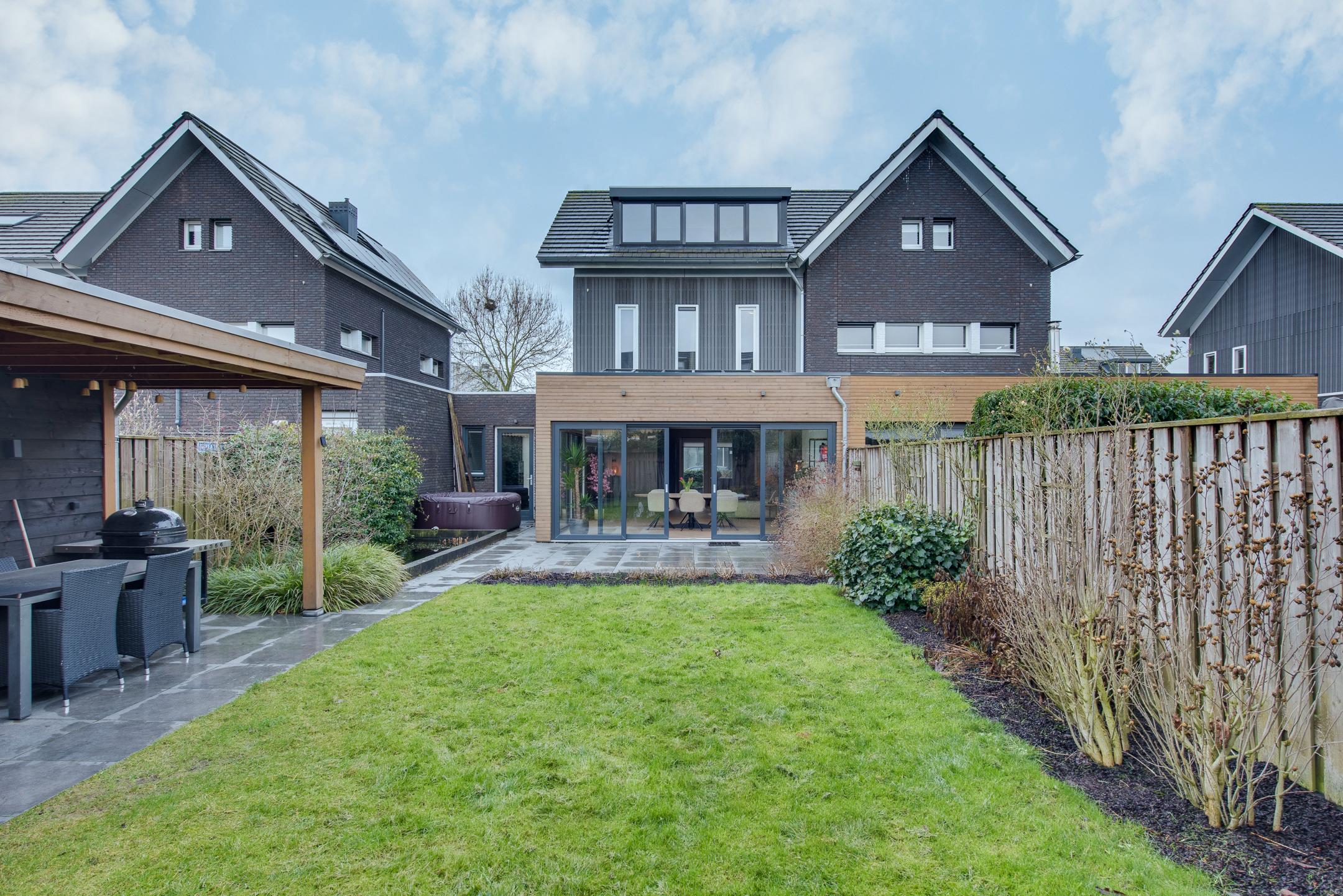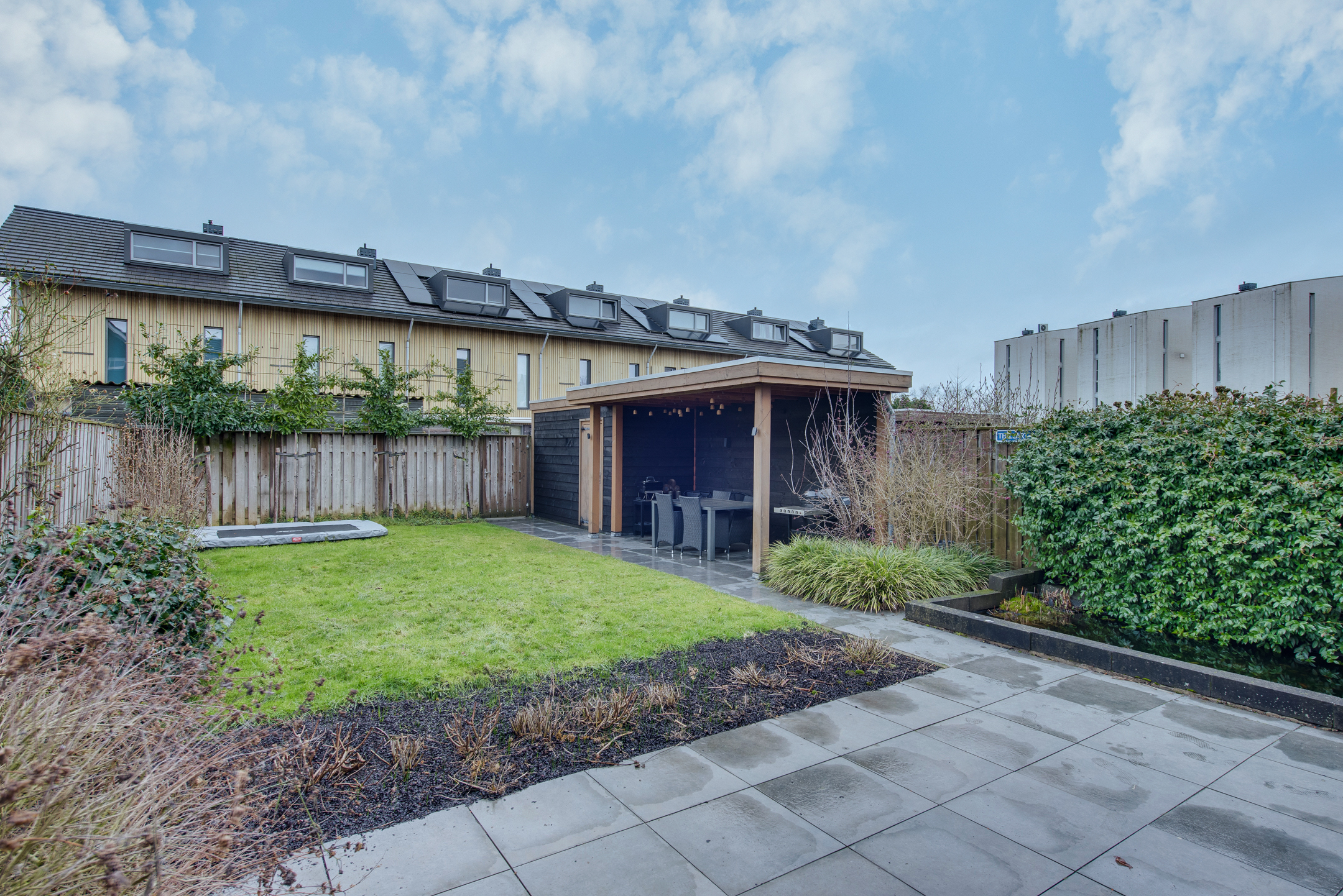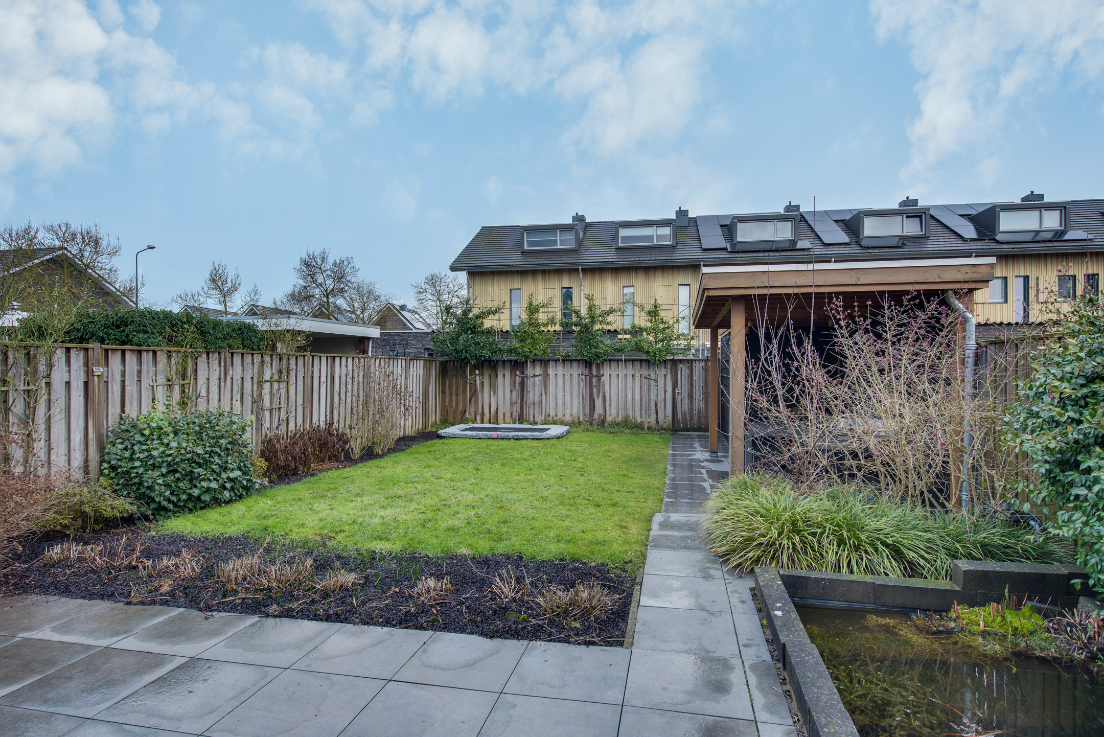 De achtertuin is van ruim formaat en verzorgd aangelegd met o.a. sierbestrating, een grasgazon en een vijver. Onder de sfeervolle, houten overkapping is het in alle privacy heerlijk vertoeven. Aansluitend aan de overkapping is een berging gesitueerd welke beschikt over veel opbergcapaciteit.