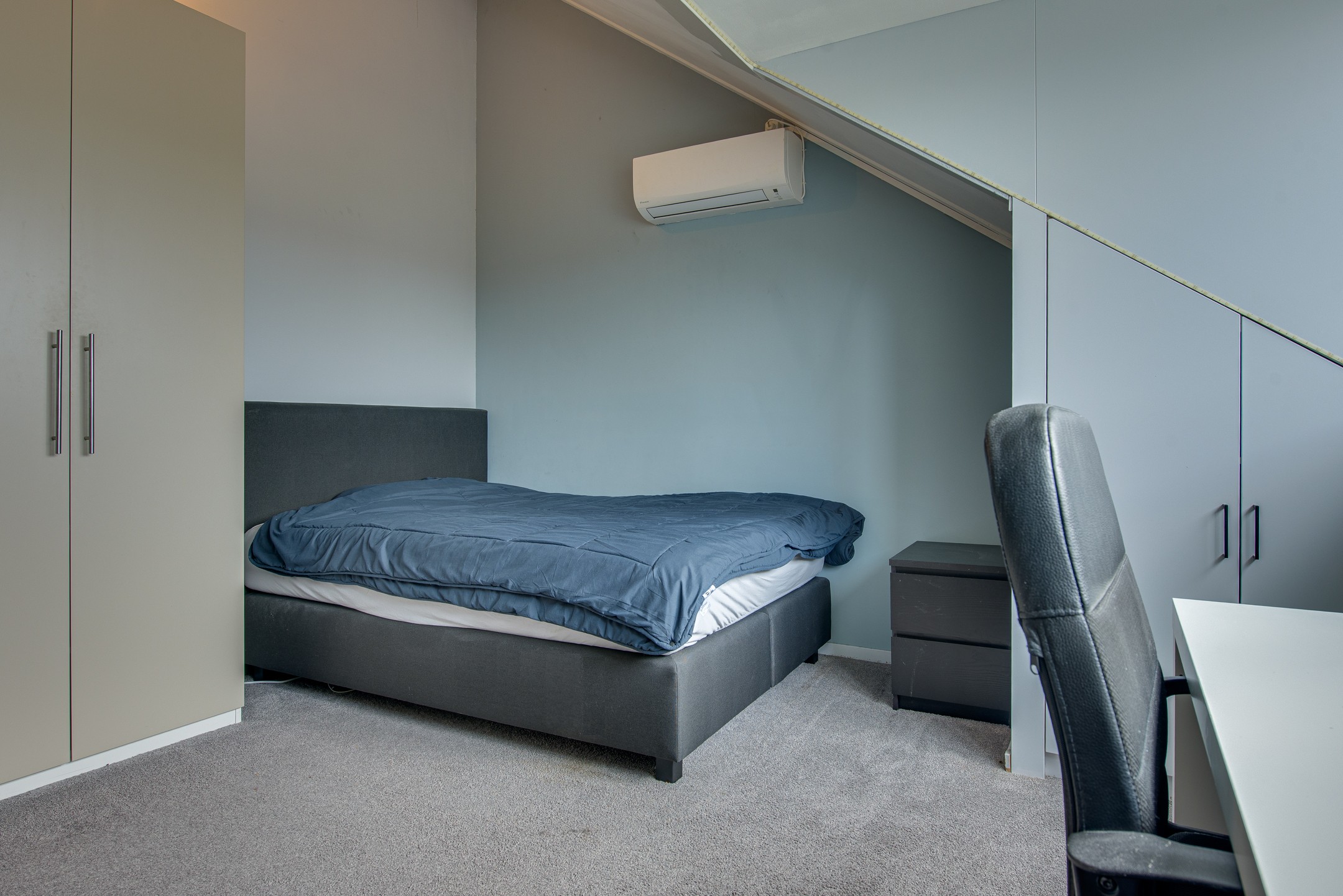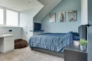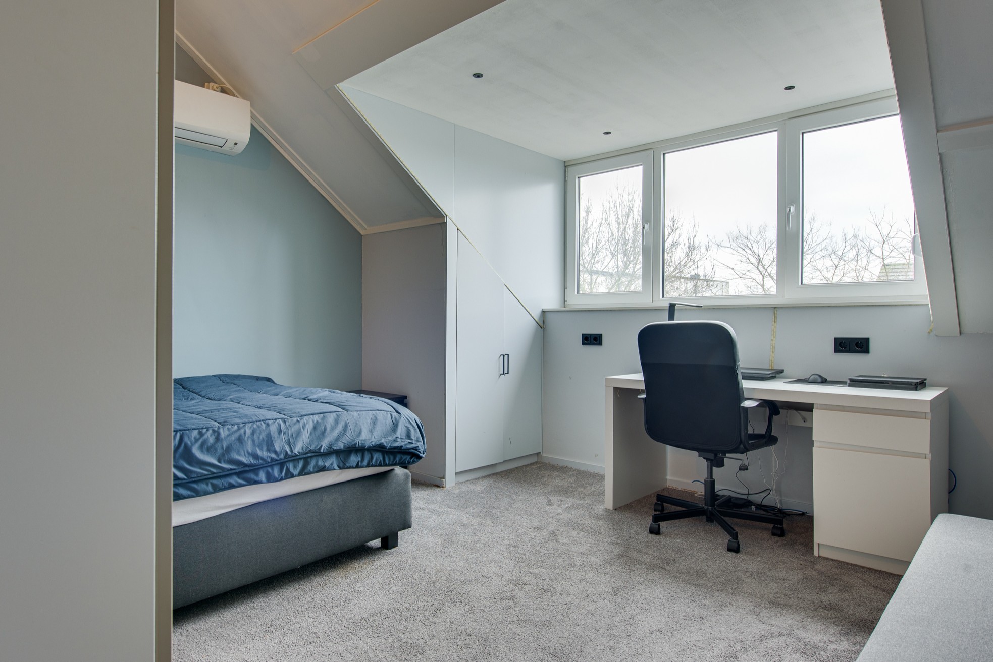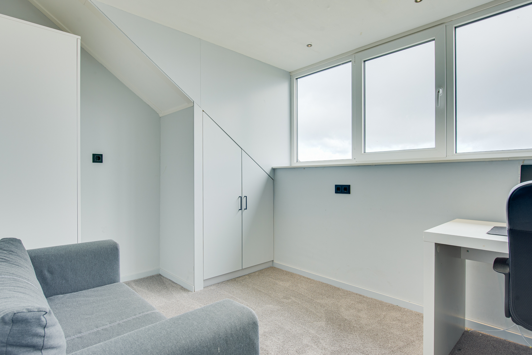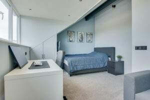 De tweede verdieping beschikt over twee zeer ruime slaapkamers. Dankzij twee dakkapellen – een grote aan de achterzijde en een kleinere aan de voorzijde – is hier volop ruimte en licht gecreëerd. Beide dakkapellen zijn voorzien van rolluiken. De slaapkamer aan de achterzijde beschikt over een airconditioning. Daarnaast is er een praktische opbergzolder en zijn er diverse bergruimtes gerealiseerd in de dakschuinte.