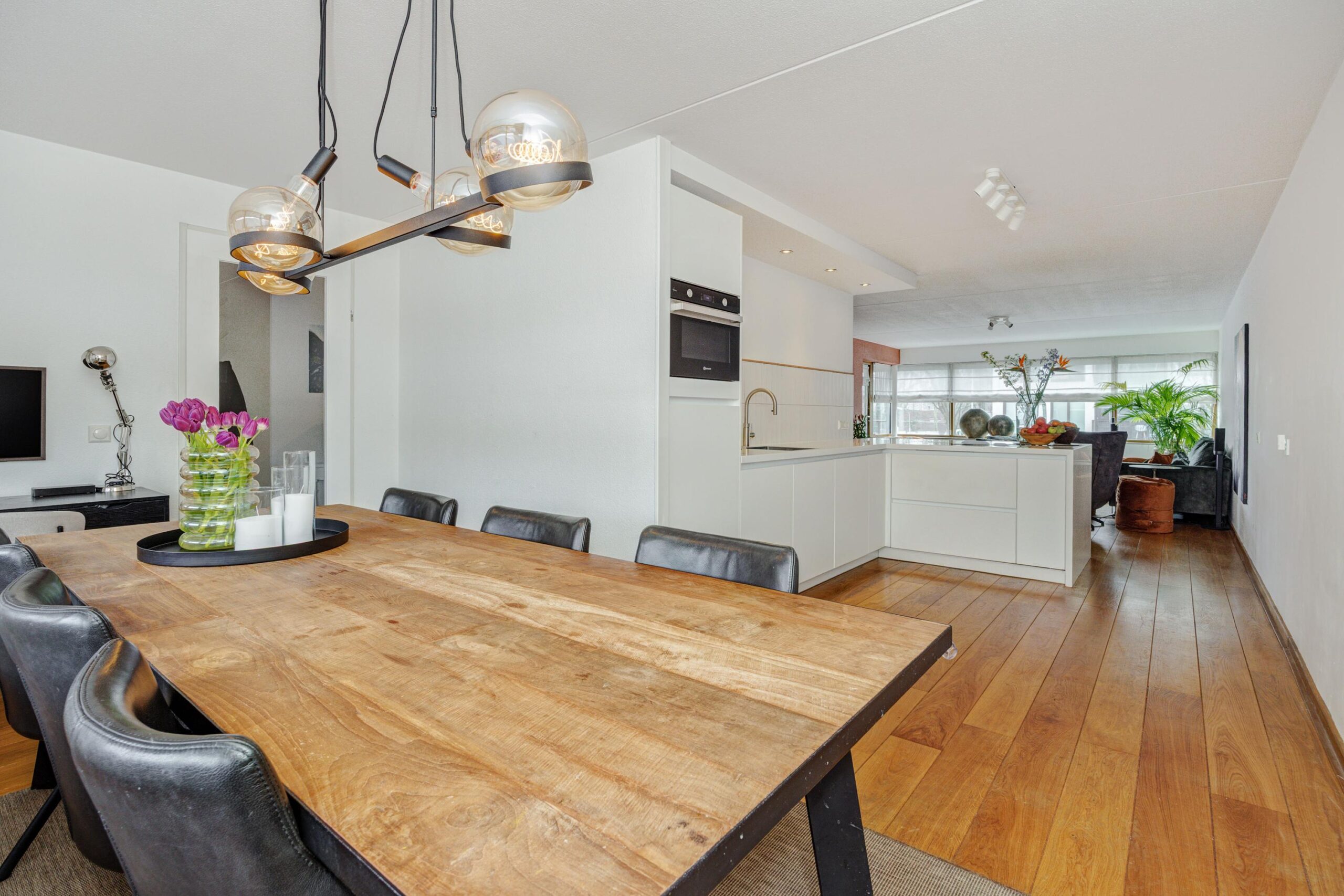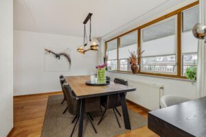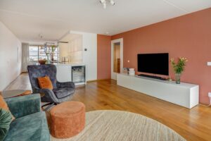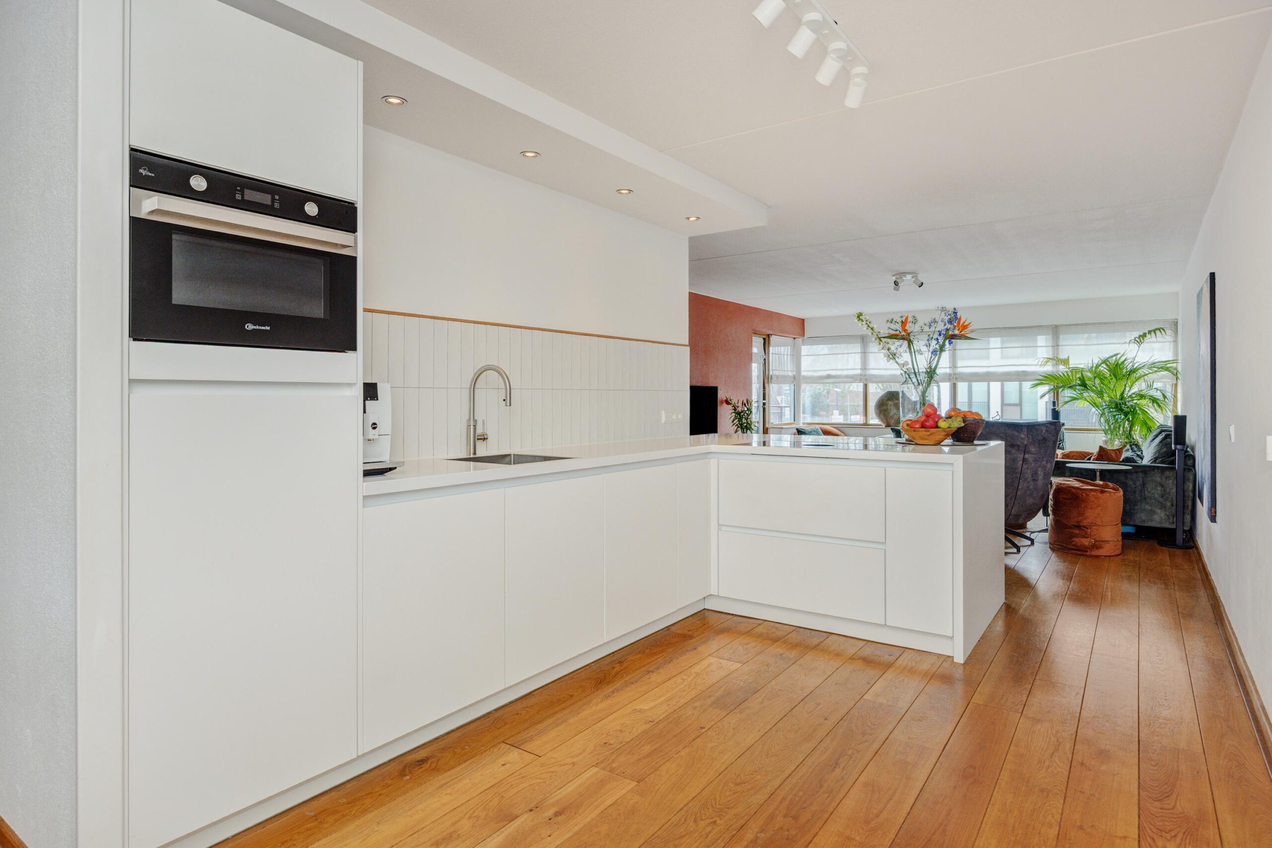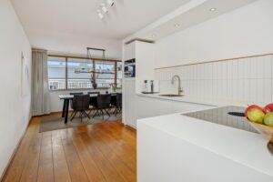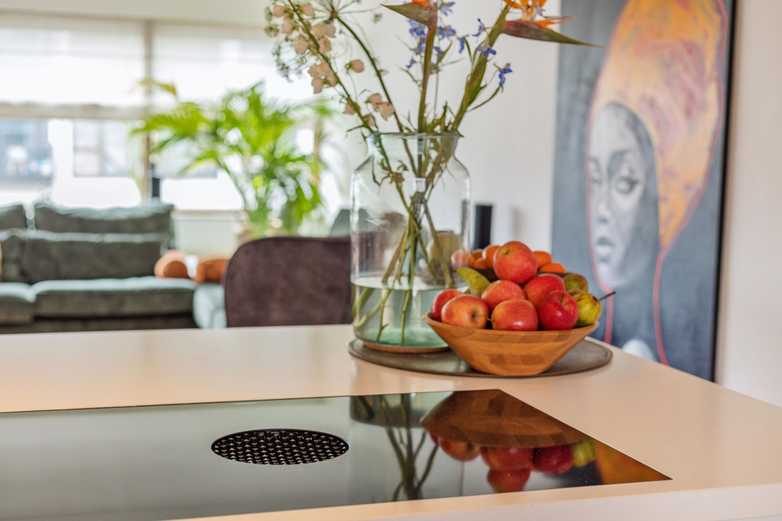 Zodra je de living binnenstapt, valt de enorme hoeveelheid licht direct op. Dankzij de grote raampartijen voelt de ruimte extra royaal aan. De sfeervolle zithoek aan de straatzijde biedt een vrij uitzicht over de straat en de kruising, en loopt naadloos over in het balkon. In het hart van de living bevindt zich de luxe, moderne keuken uit 2021. Deze is werkelijk van alle gemakken voorzien: een BORA-inductiekookplaat, een Quooker, een wijnkoelkast, vaatwasser, koelkast, vriezer en een combi-oven. Door de centrale opstelling blijf je tijdens het koken altijd in contact met gasten aan de eettafel of in de zithoek. De gehele ruimte is afgewerkt met een fraaie Frans eikenhouten vloer en stucwerk op de wanden.