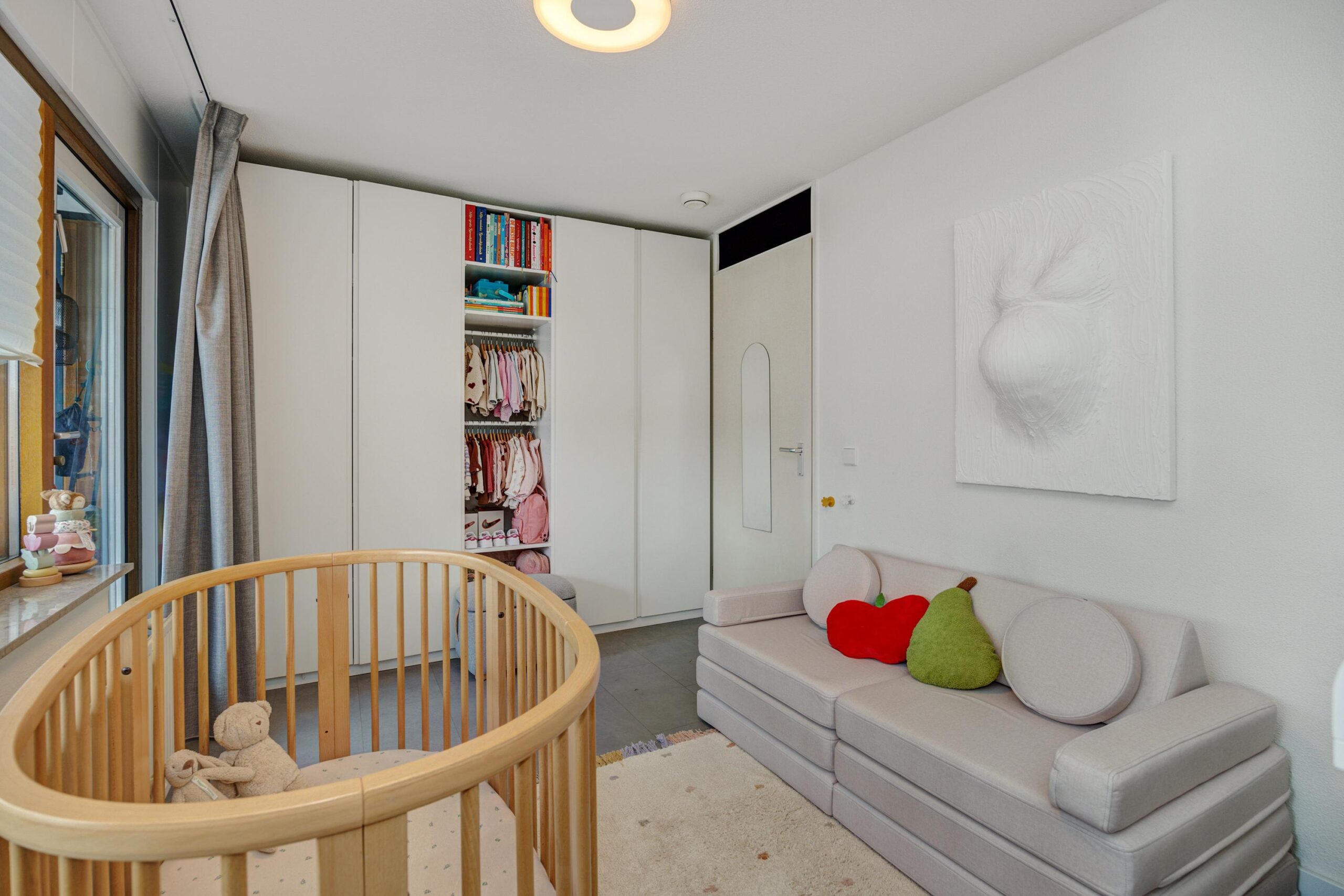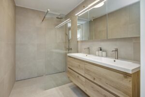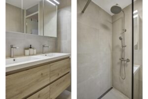 De badkamer is in 2024 vernieuwd en heeft een strakke, moderne uitstraling. Hier vind je een breed wastafelmeubel met dubbele wastafel, een praktische spiegelkast en een ruime inloopdouche met dubbele easy drain. Tegenover de badkamer bevinden zich een separate toiletruimte en een handige bergkast met de opstelling voor de wasapparatuur, de cv-ketel (Intergas, 2016) en de WTW-unit.