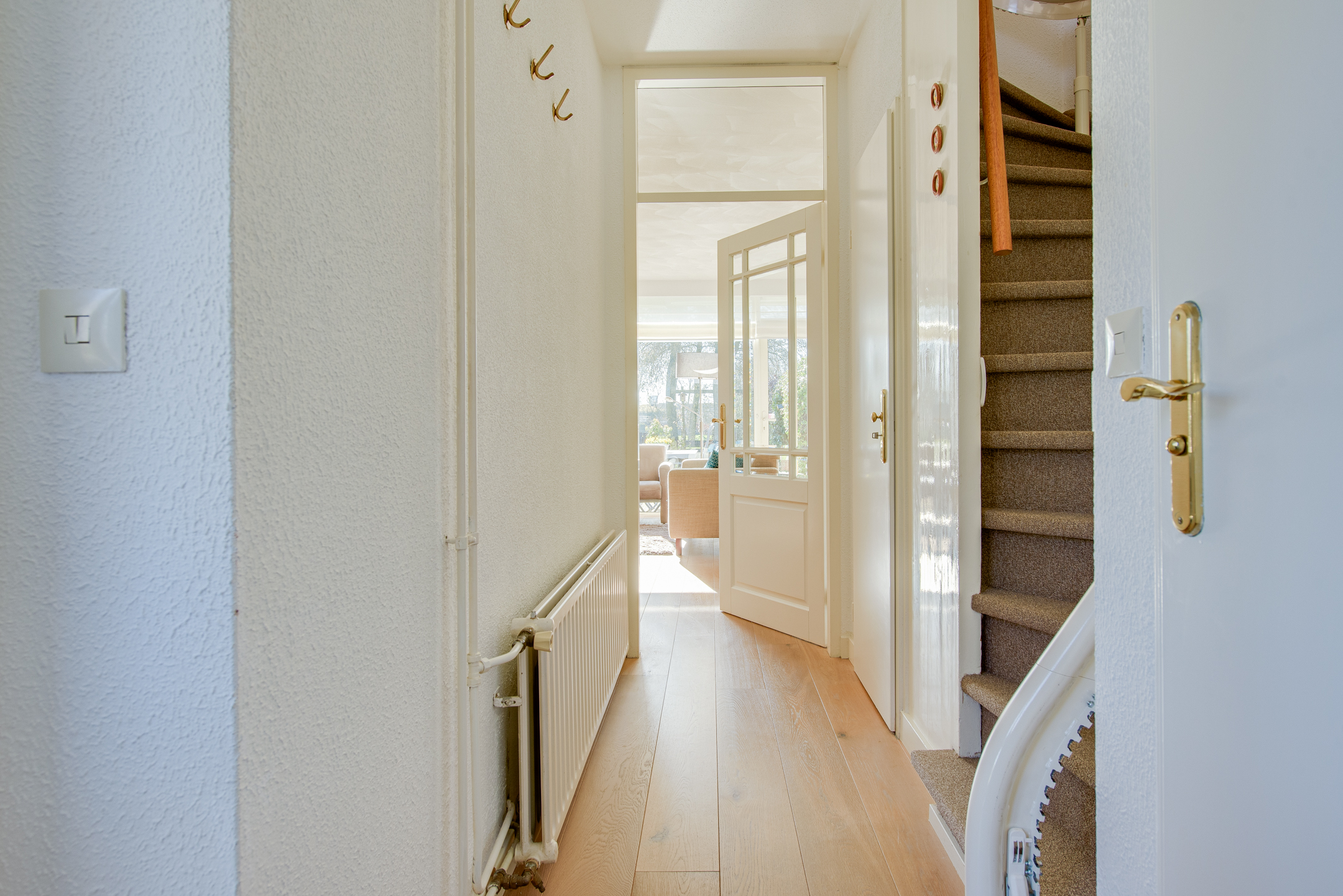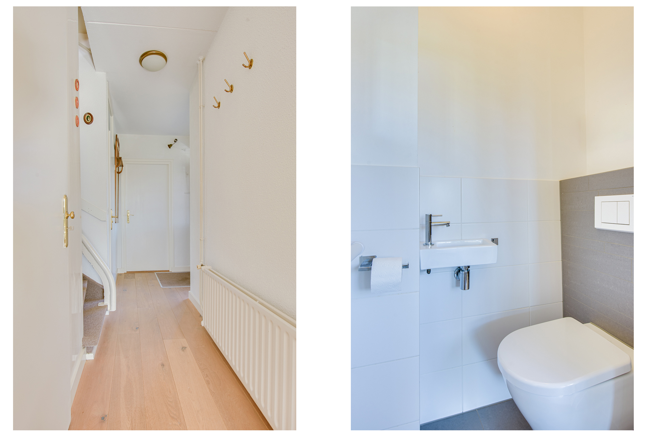 Via de entree aan de voorzijde van de woning bereiken we de hal met vernieuwde toiletruimte (wandcloset met fonteintje), trapkast en trapopgang naar de eerste verdieping. Vanuit de hal is er tevens toegang tot de woonkamer en de berging.