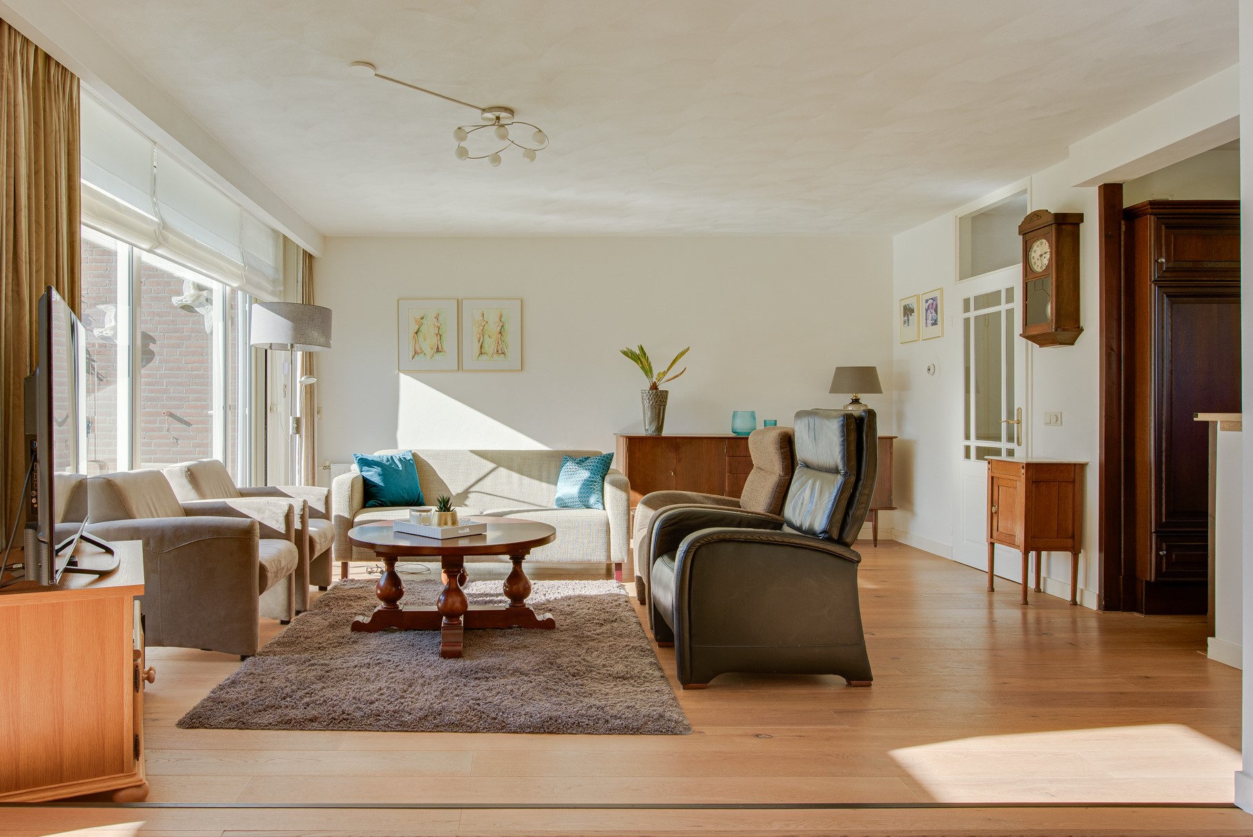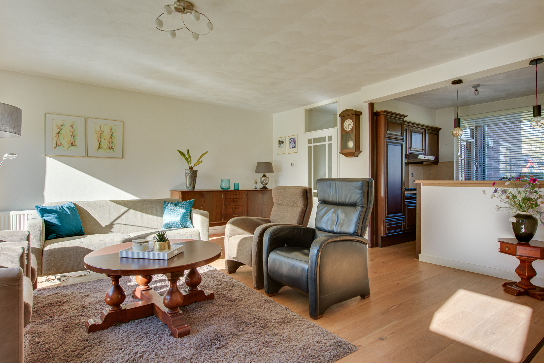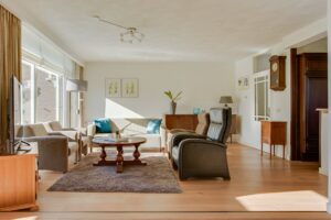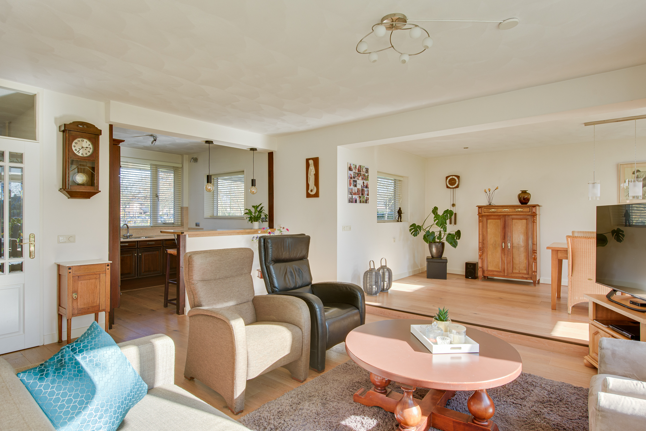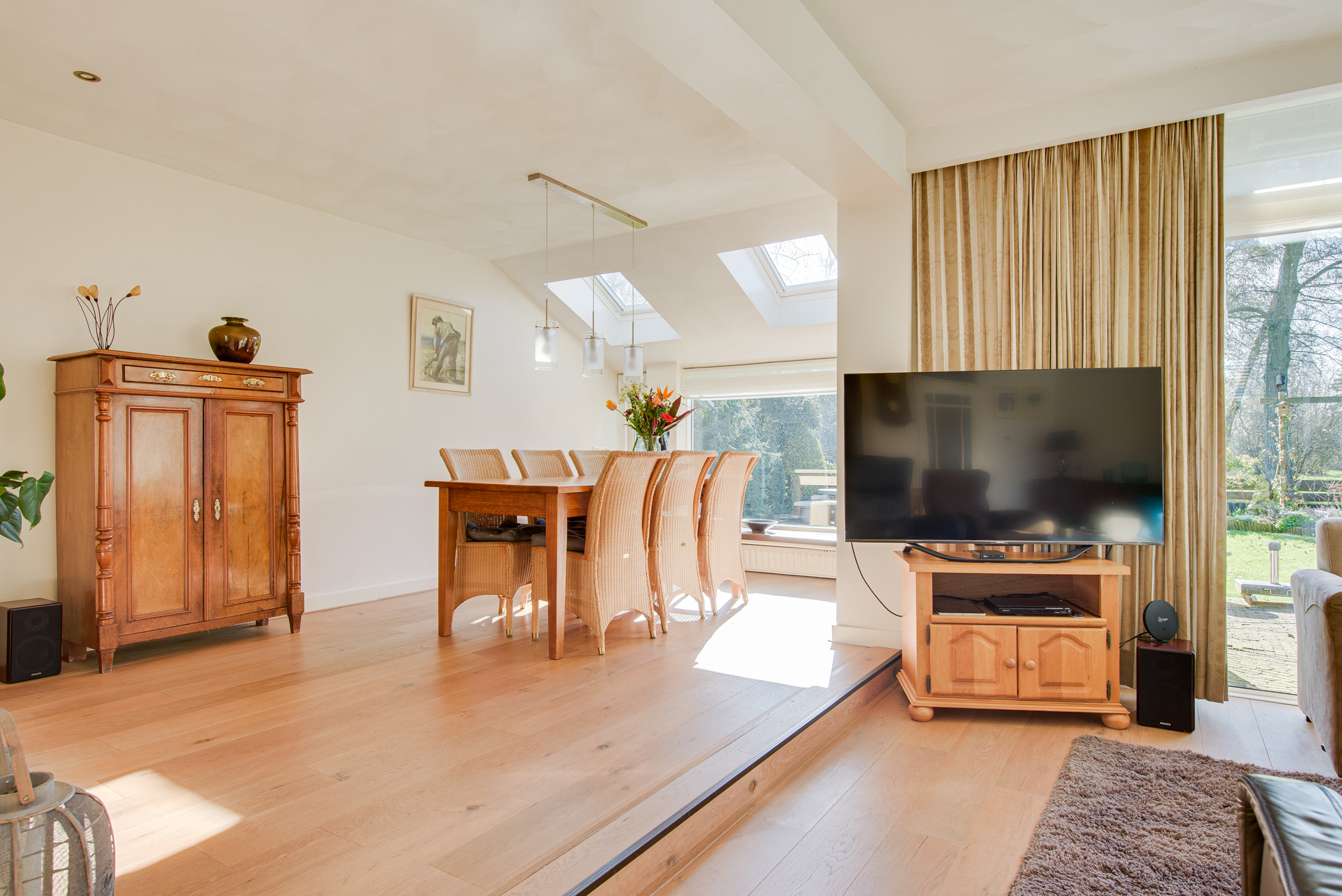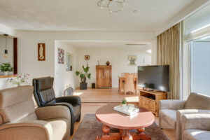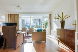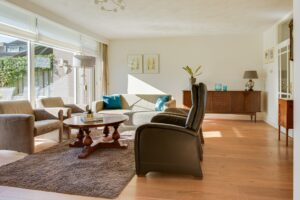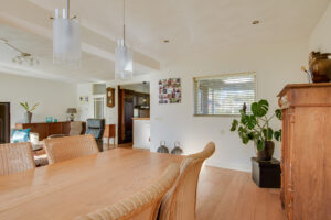 Bij binnenkomst in de woonkamer valt direct de ruimte en de hoeveelheid lichtinval op. De voormalige garage is bij de woonkamer getrokken, waardoor er een fijne en royale living met eetkamer is gecreëerd. De eetkamer is voorzien van raampartijen en twee dakramen aan de achterzijde. Vanuit de woonkamer is er toegang tot de achtertuin. De achtergevel is voorzien van kunststof kozijnen.