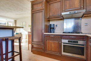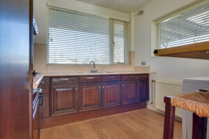 De woonkamer loopt naadloos over in de keuken die aan de voorzijde van de woning is gelegen. De keuken heeft twee grote raampartijen met vrij zicht over het voorgelegen groen. De keuken is geplaatst in een L-opstelling en voorzien van een koelkast, oven, 4-pits gaskookplaat, dubbele spoelbak en bergruimte in de kastjes.