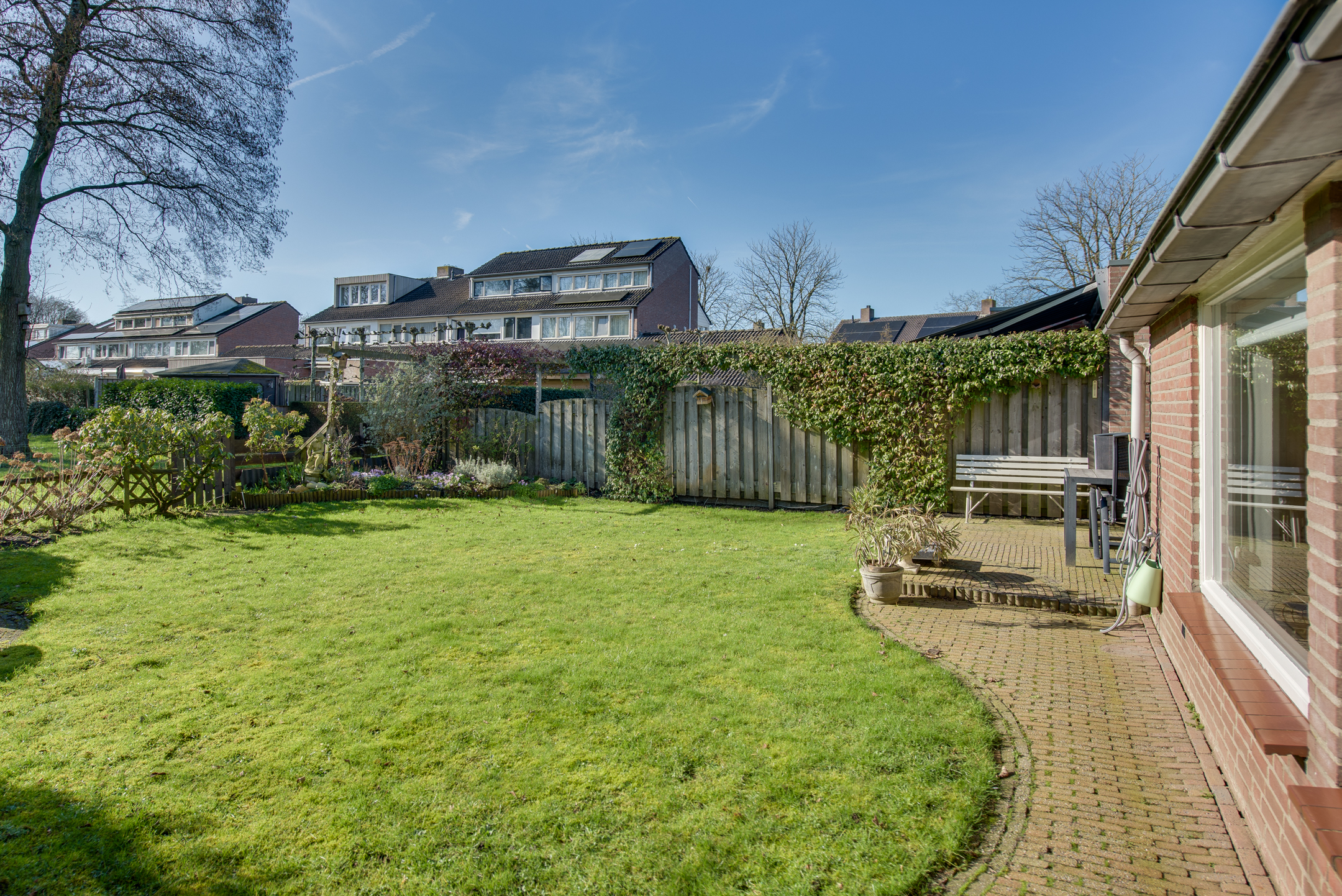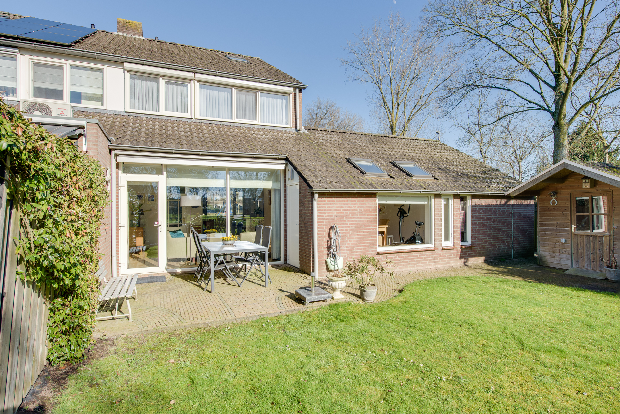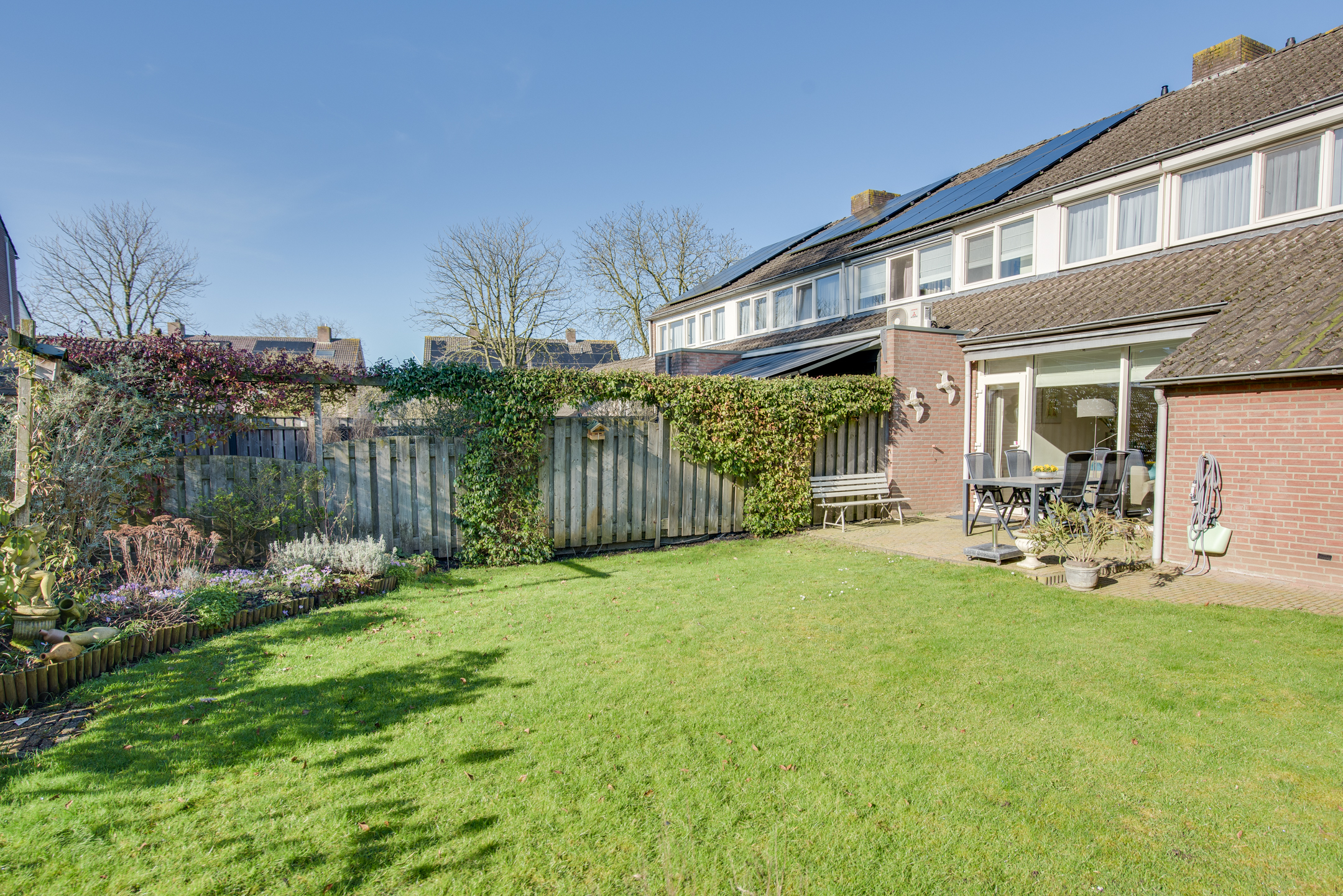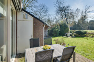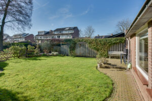 Vanuit de woonkamer is de zonnige achtertuin met achterom te bereiken. De royale tuin is op het zuidwesten gelegen en is voorzien van sierbestrating, gazon, groenborders, buitenkraan en elektrisch zonnescherm. Aan de gevel bevindt zich een bergkast en in de tuin is een vrijstaande houten berging geplaatst. De tuin biedt voldoende privacy door de vrije ligging aan de achterzijde. Een fijne, zonnige tuin!