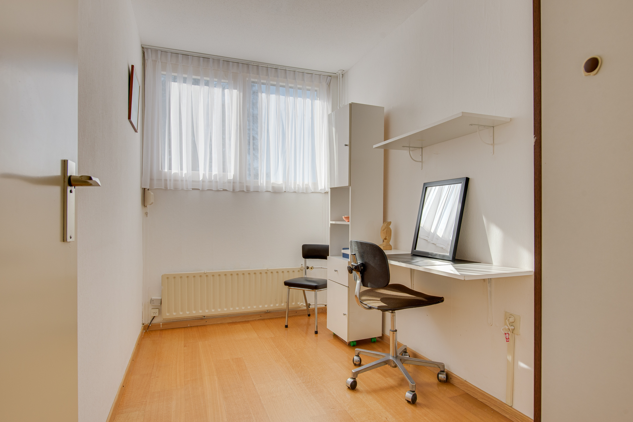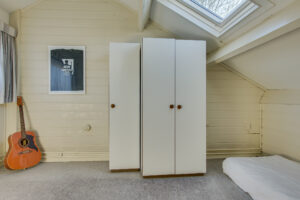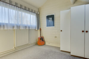 De vierde slaapkamer, met kunststof kozijn, is voorzien van bergruimte achter het knieschot aan de achterzijde.