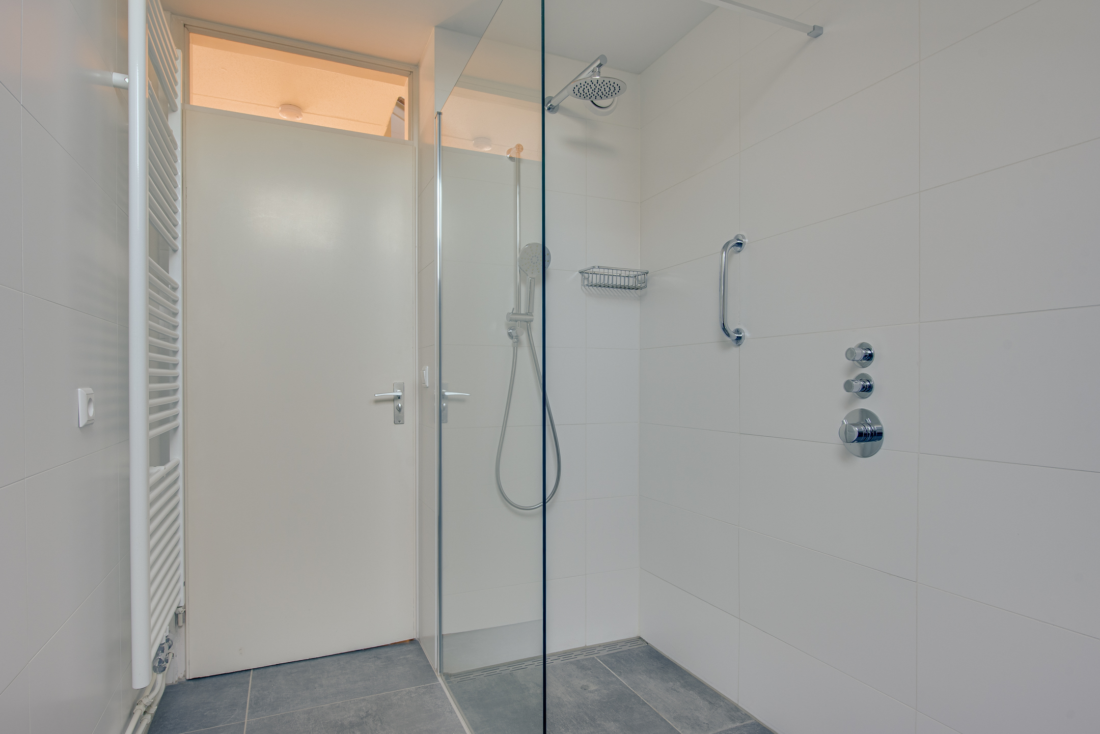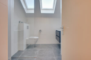 Tenslotte bereiken we de royale badkamer (± 2022) voorzien van een inloopdouche, wastafel met meubel, wandcloset en designradiator. De badkamer met kunststof Velux dakraam is volledig betegeld met een witte wandtegel en een grijze vloertegel.