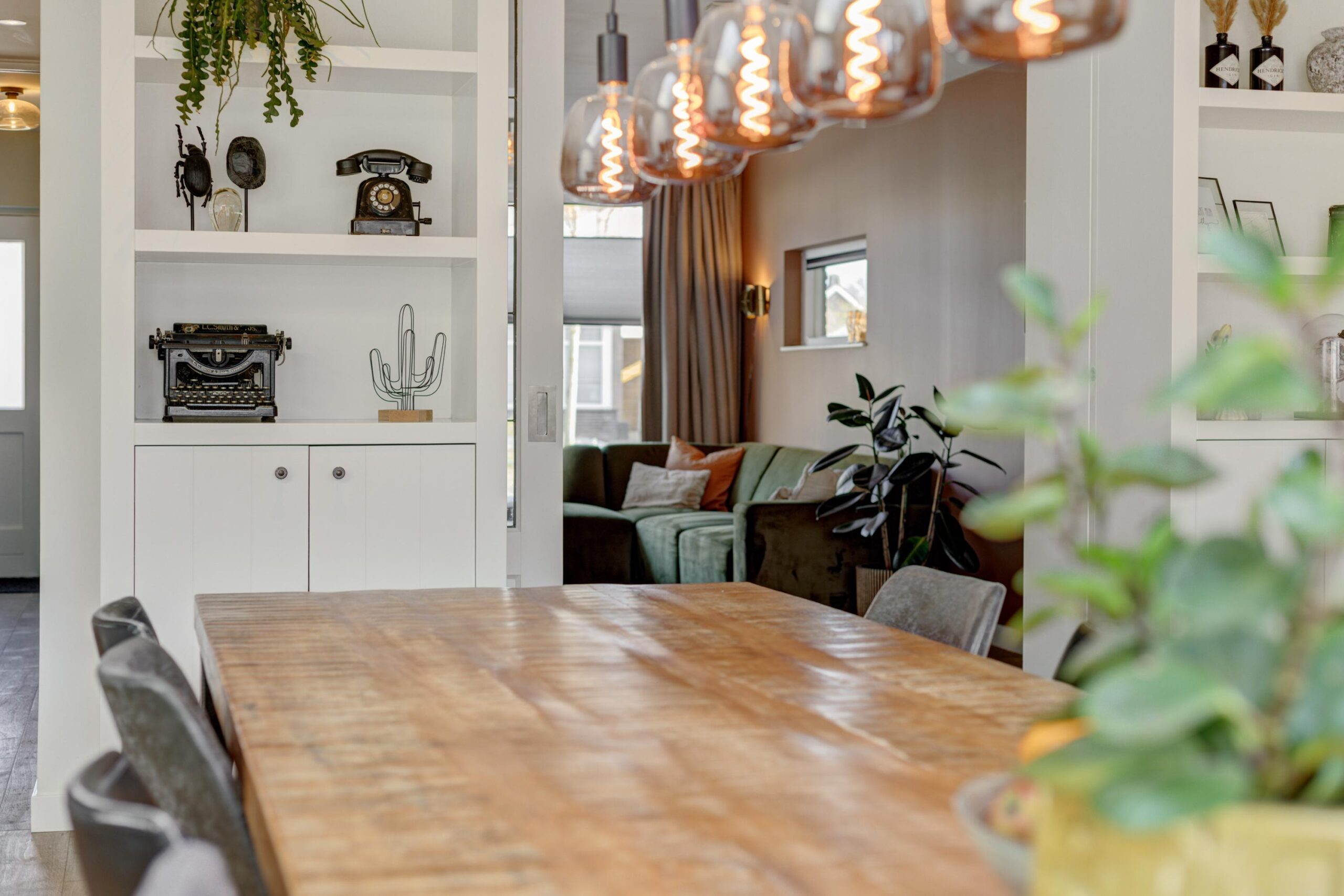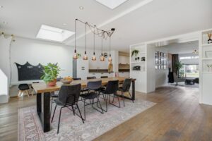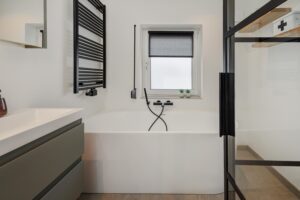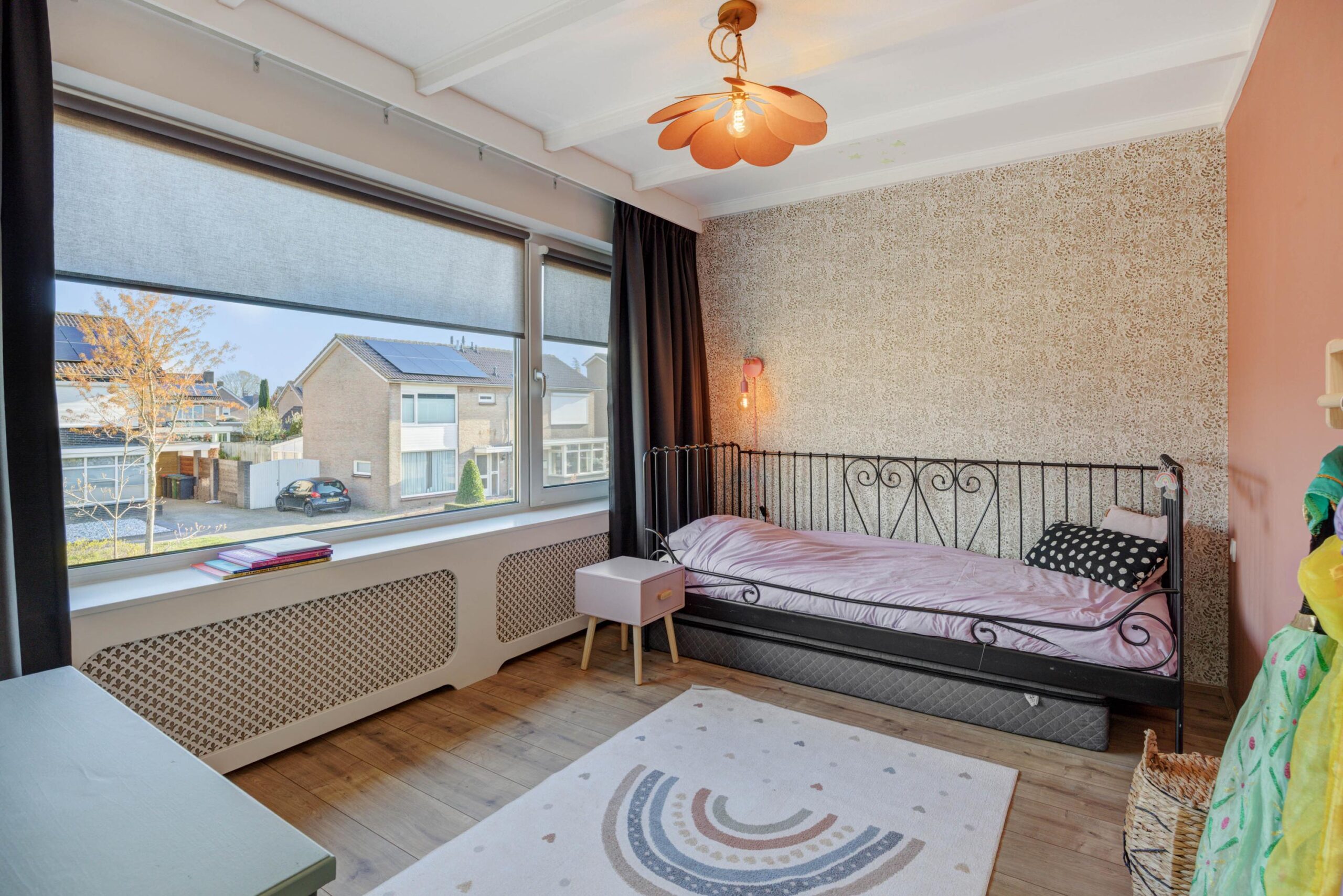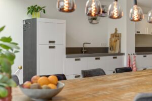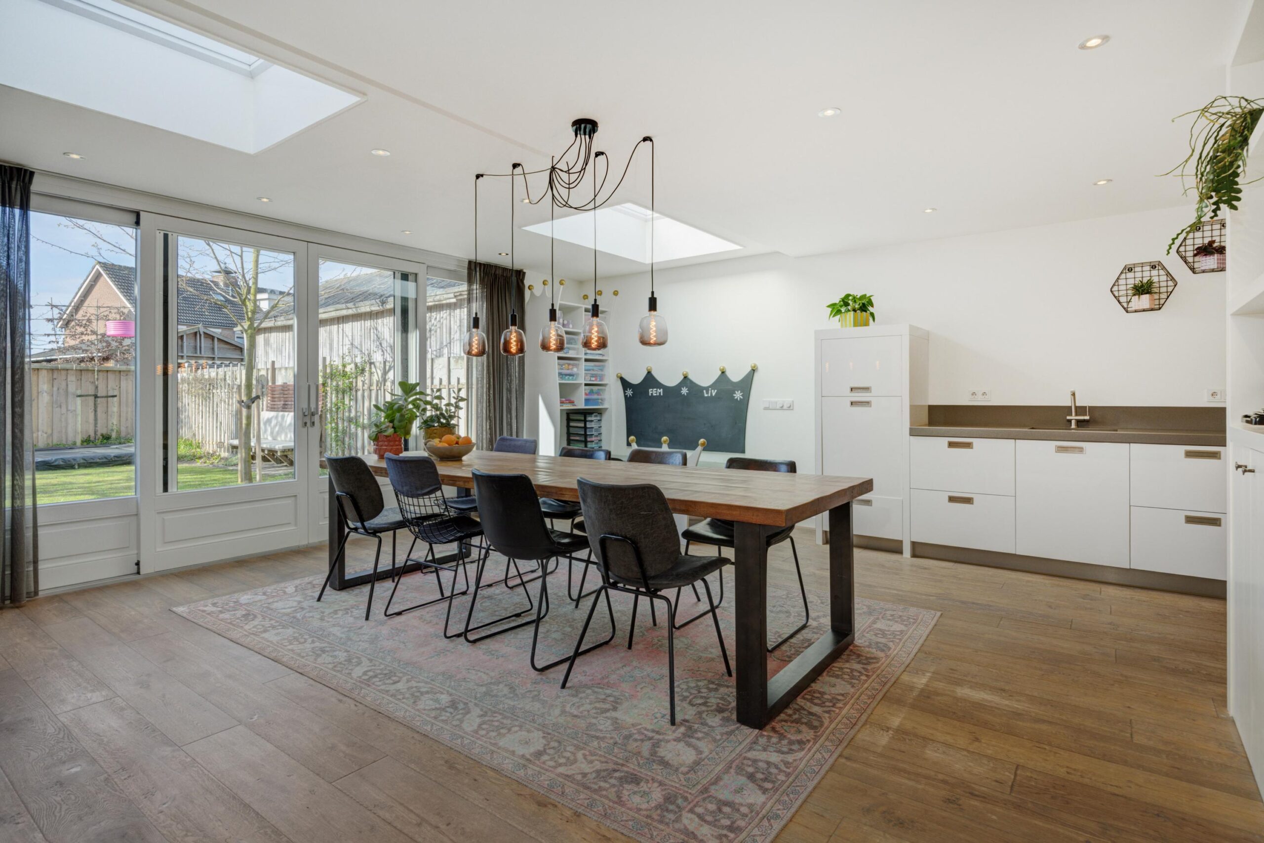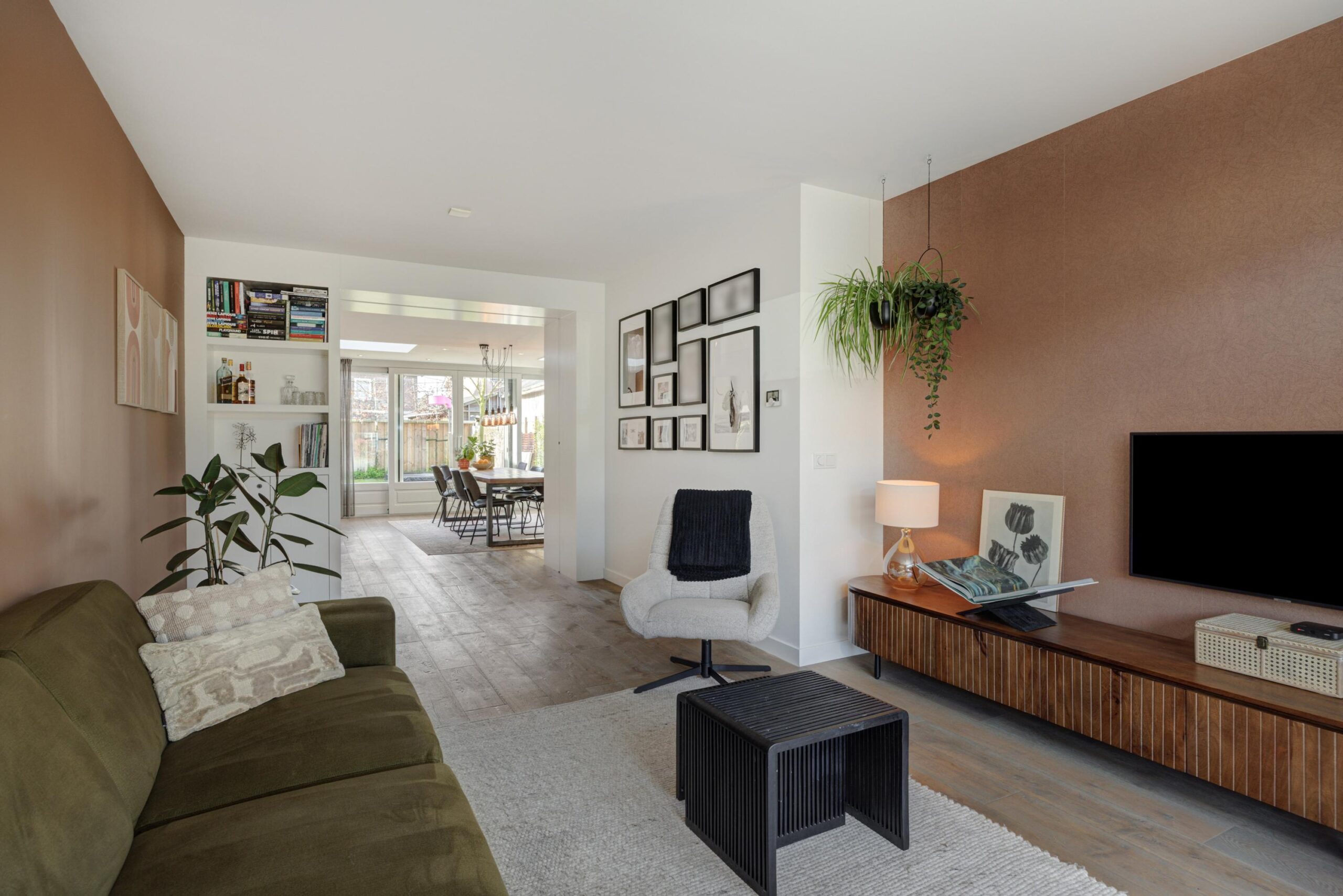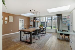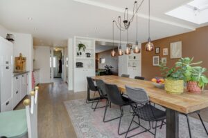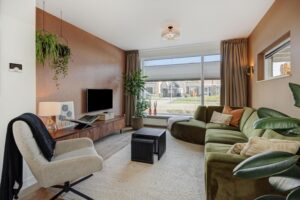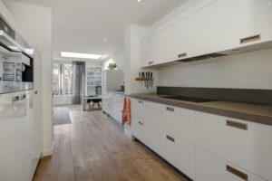 Aan de achterzijde is de woning riant uitgebouwd. Dankzij de vierlaagse, zonwerende lichtkoepels (vervangen in 2025) en de riante schuifpui valt er een zee aan licht naar binnen. Je hebt hier alle ruimte voor een grote tuingerichte eethoek. De living heeft karakteristieke en-suite kasten met deuren, waardoor je de zithoek en eethoek gezellig van elkaar kunt scheiden. De zithoek is op sfeervolle wijze gesitueerd aan de voorzijde. Behalve in de berging geniet je op de hele begane grond van vloerverwarming.