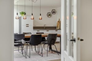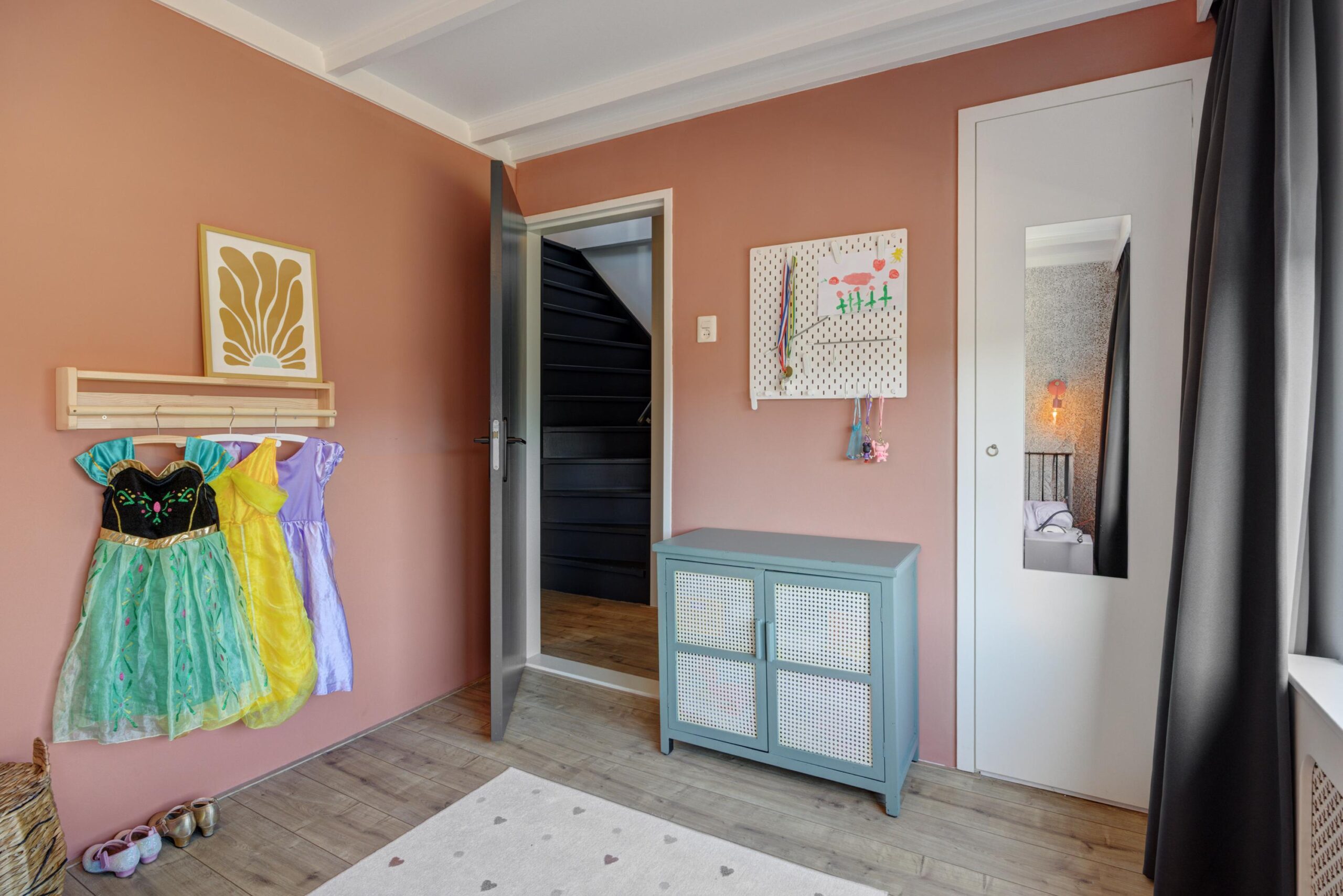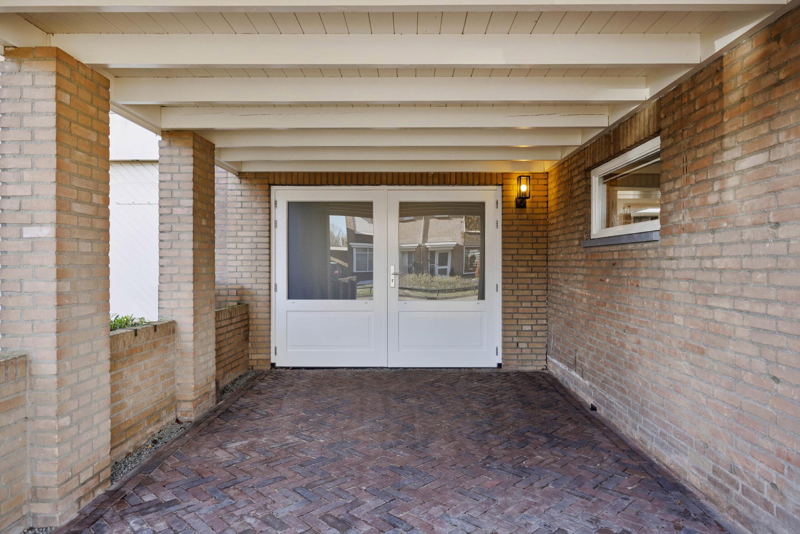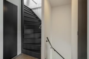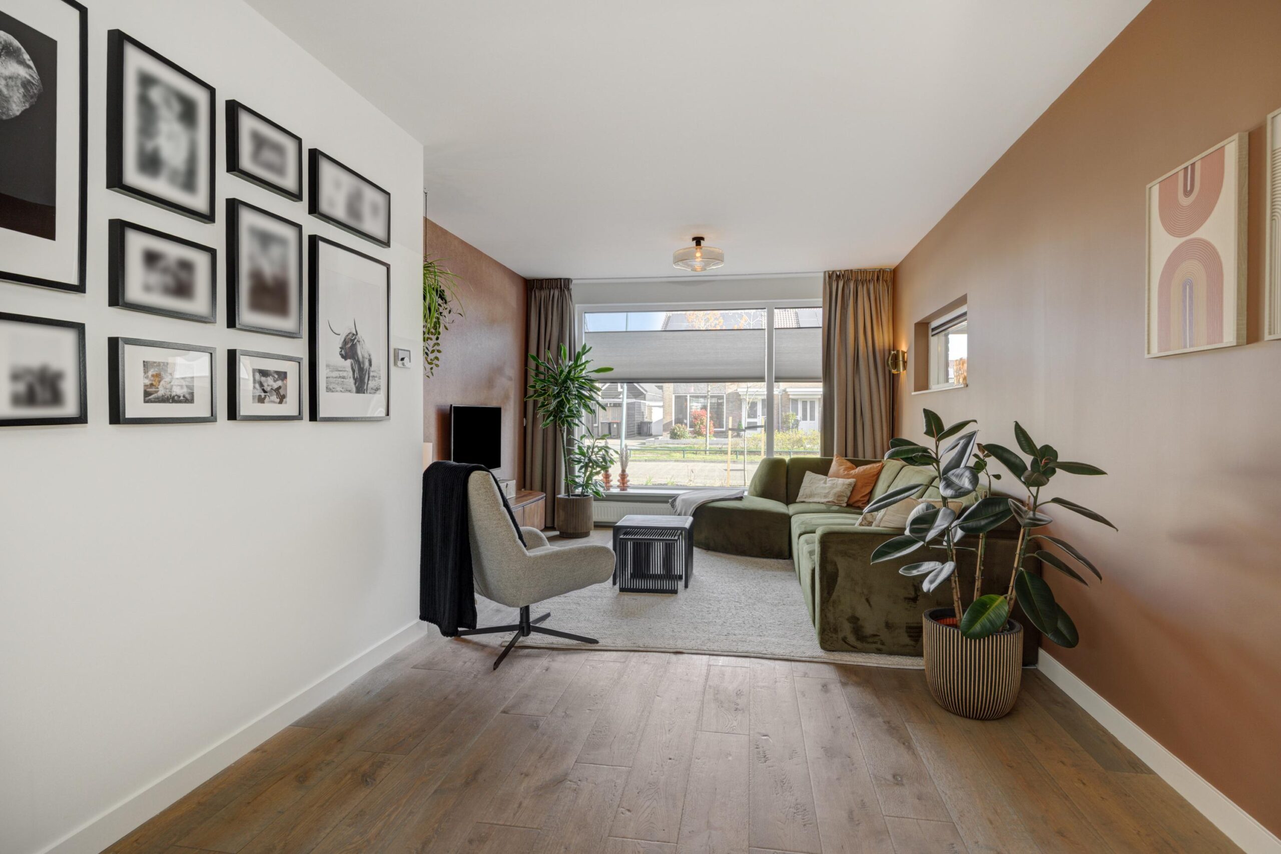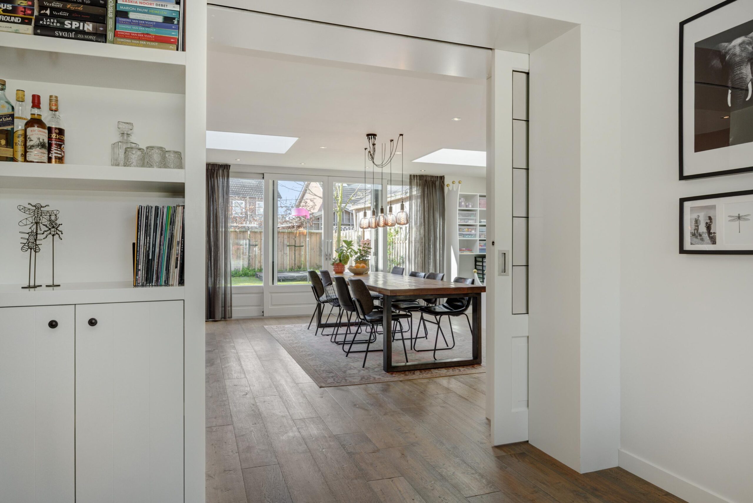 Aan de achterzijde is de woning riant uitgebouwd. Dankzij de vierlaagse, zonwerende lichtkoepels (vervangen in 2025) en de riante schuifpui valt er een zee aan licht naar binnen. Je hebt hier alle ruimte voor een grote tuingerichte eethoek. De living heeft karakteristieke en-suite kasten met deuren, waardoor je de zithoek en eethoek gezellig van elkaar kunt scheiden. De zithoek is op sfeervolle wijze gesitueerd aan de voorzijde. Behalve in de berging geniet je op de hele begane grond van vloerverwarming.