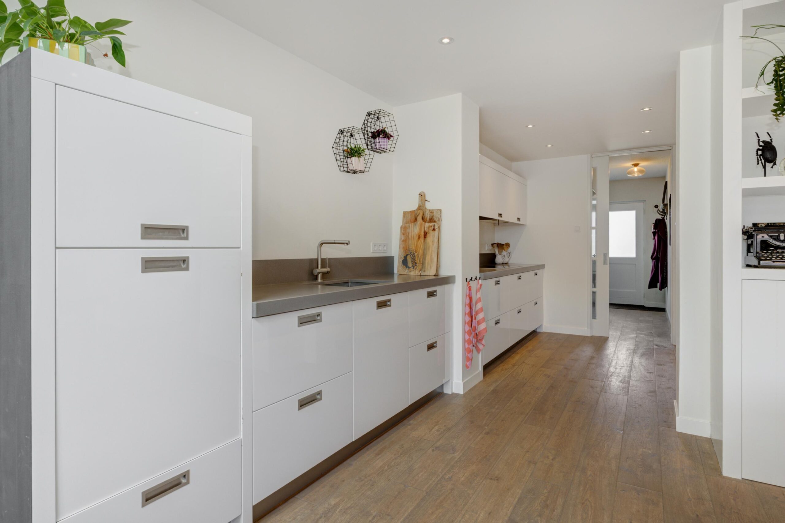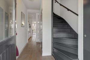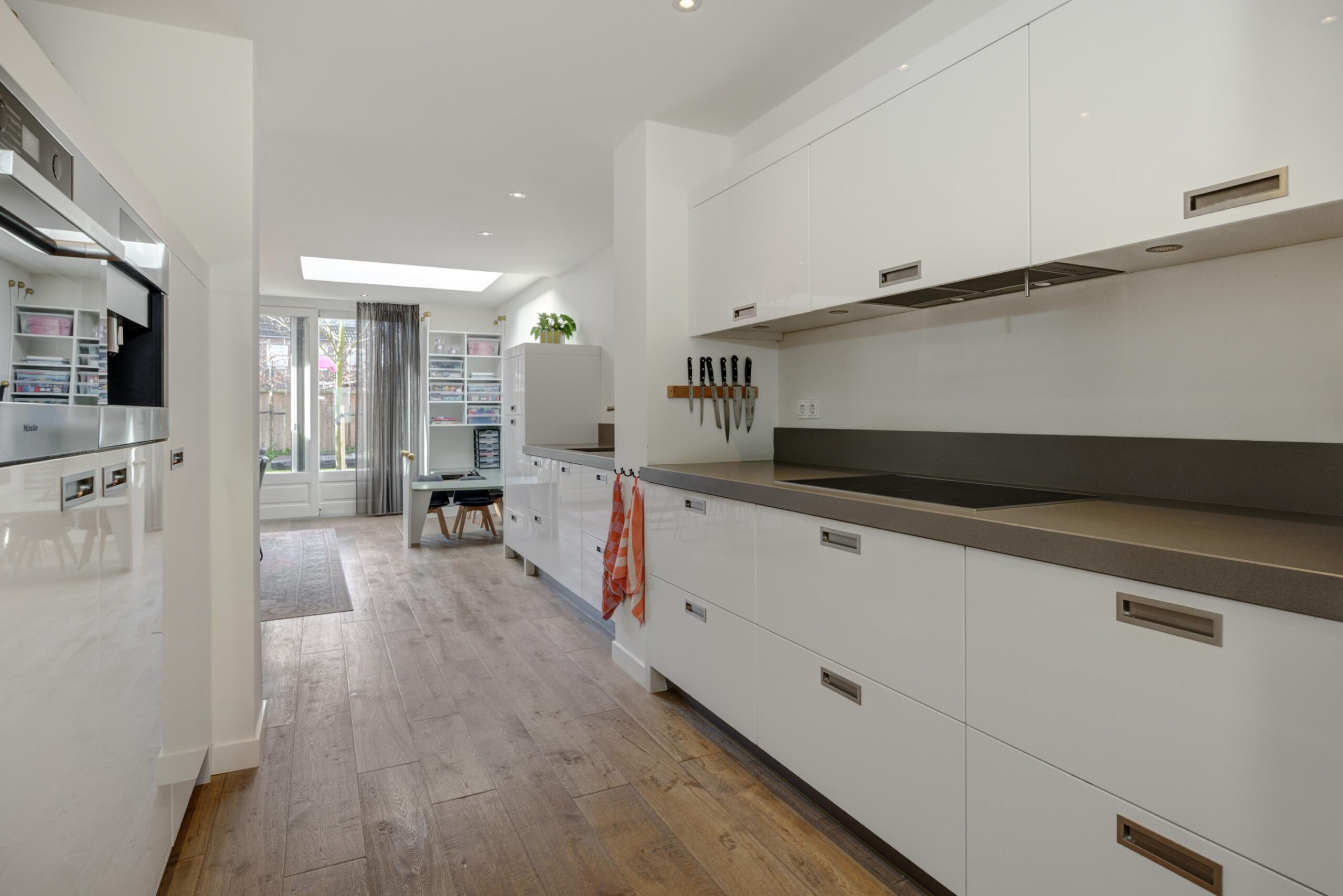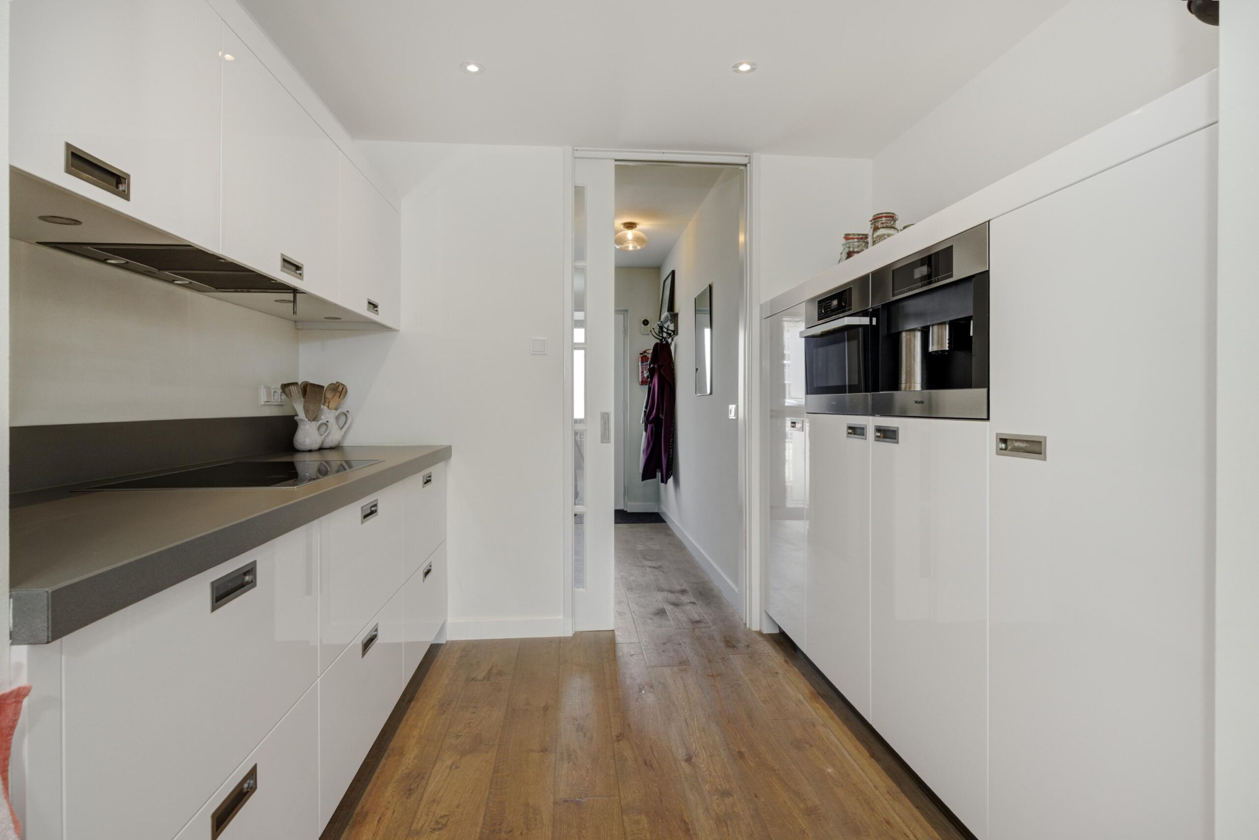 Zodra je via de nieuw aangelegde voortuin met overdekte entree de woning binnenstapt, ervaar je direct de prettige sfeer. In de hal vind je de meterkast (vernieuwd in 2023), de garderobe, de trapopgang en twee praktische bergkasten (waarvan één in de voormalige toiletruimte). Via een schuifdeur loop je de moderne keuken in. Hier ontbreekt het je aan niets: je kookt met hoogwaardige Miele-apparatuur, waaronder een inductiekookplaat, combi-oven, een ingebouwd koffiezetapparaat en een vaatwasser op hoogte, ideaal!