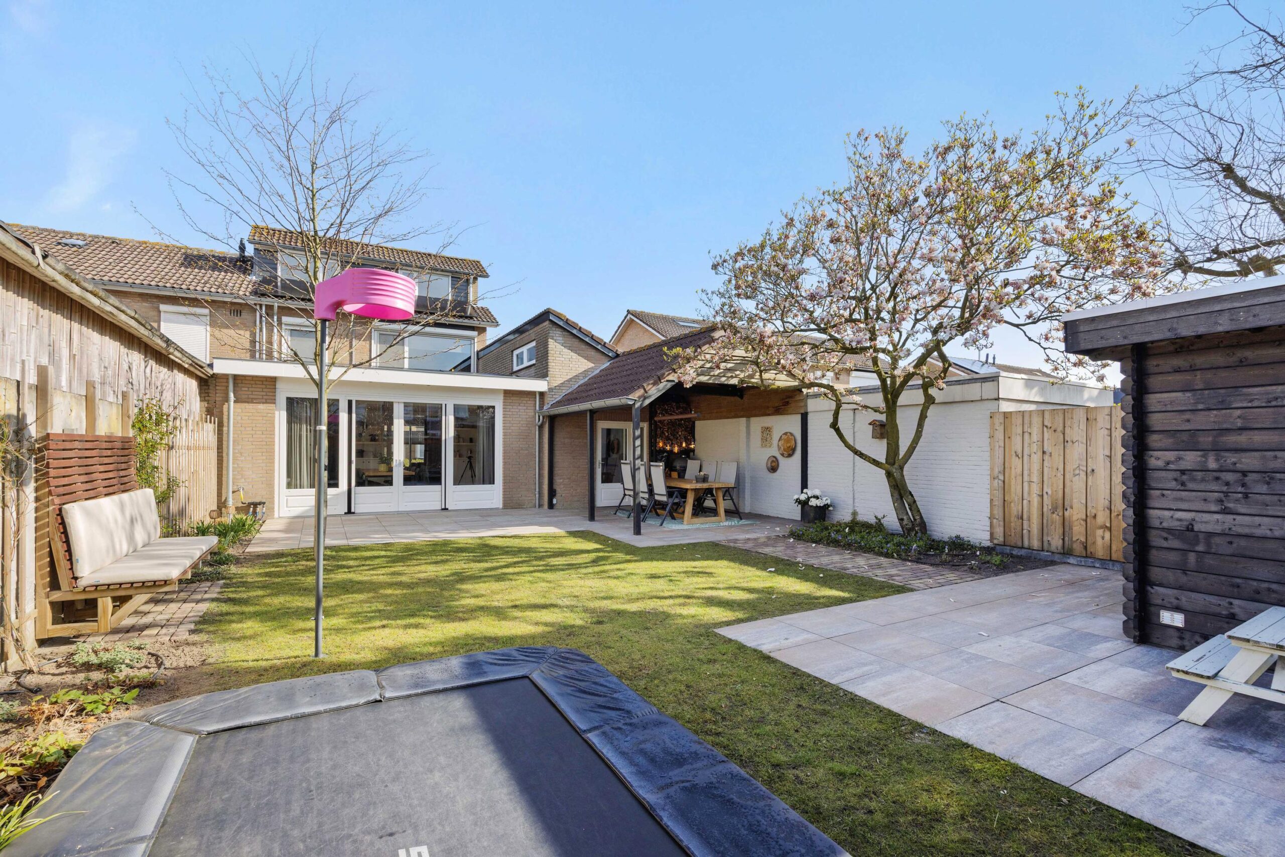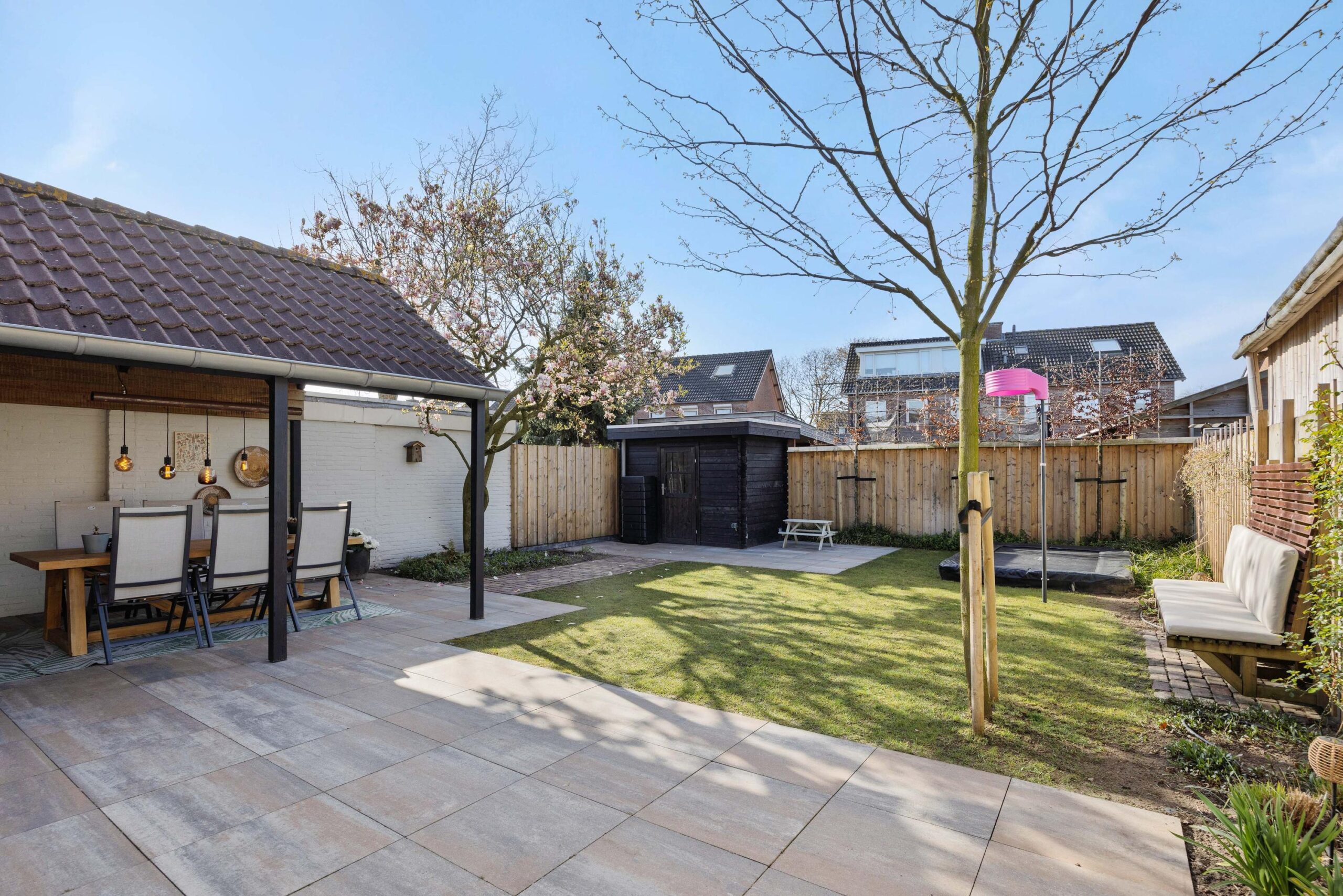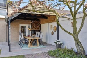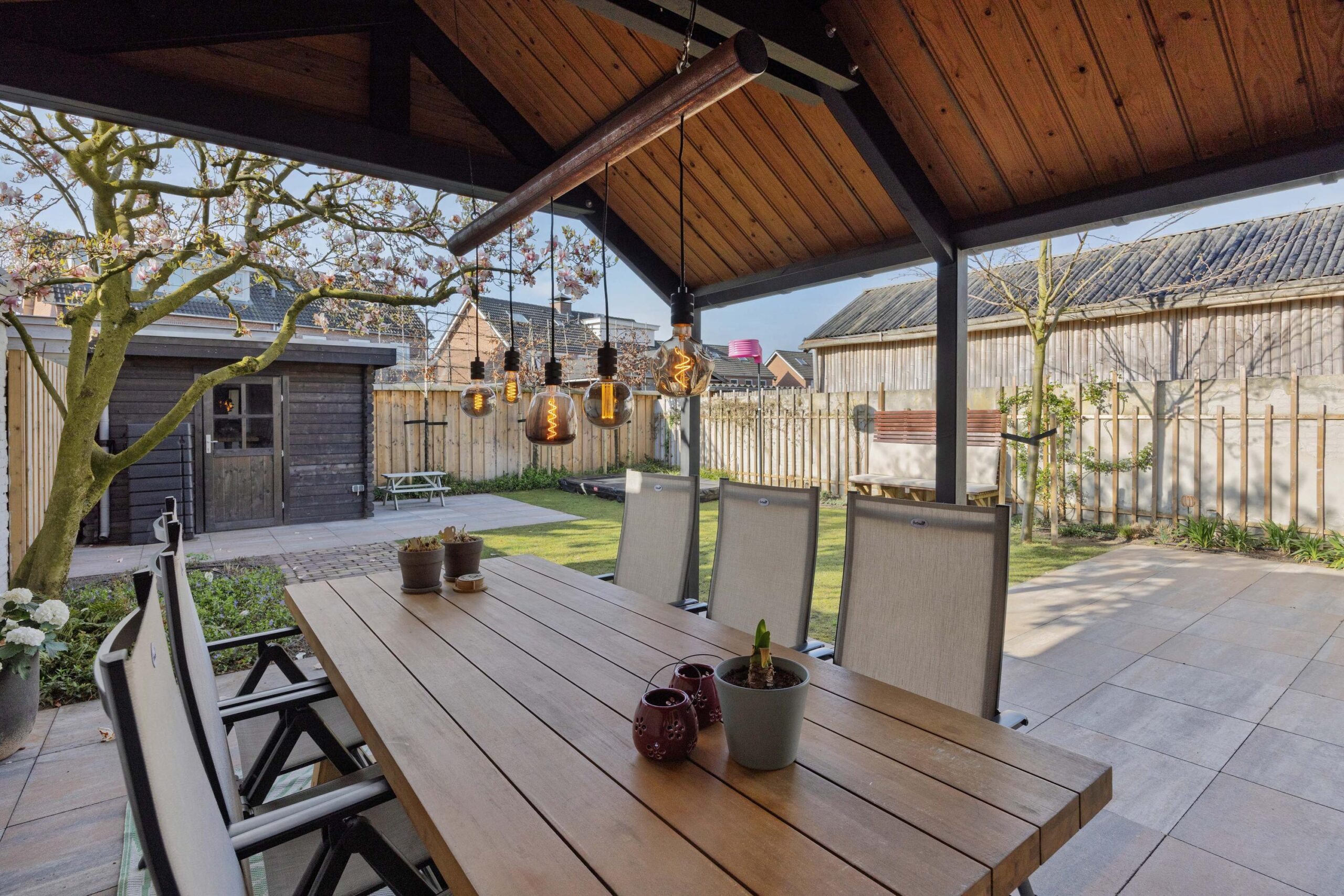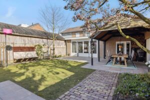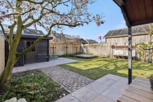 De achtertuin is in 2023 opnieuw aangelegd met diverse terrassen, een gazon, plantenbordes en een fijne overkapping die bereikbaar is via de bijkeuken. Hier kun je al vroeg in het jaar van het buitenleven genieten. Achterin de tuin staat een houten tuinhuis en de leibeuken en bomen, zoals een prachtige magnolia, zorgen voor extra privacy en sfeer. De voortuin en oprit zijn in 2025 nieuw aangelegd. Zowel de voor- als achtertuin zijn voorzien van een handige sproei- en beregeningsinstallatie, zodat de tuin er altijd top bij staat.